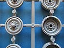 Die Laufrollen machen einen ausgezeichneten Eindruck und sind auf beiden Seiten schön detailliert. Die Aussenfelge wird zudem einzeln mit dem Radkranz und Gummierung verdehen, wodurch die spezifische recht aufwändige Form der Räder gut dargestellt wird.