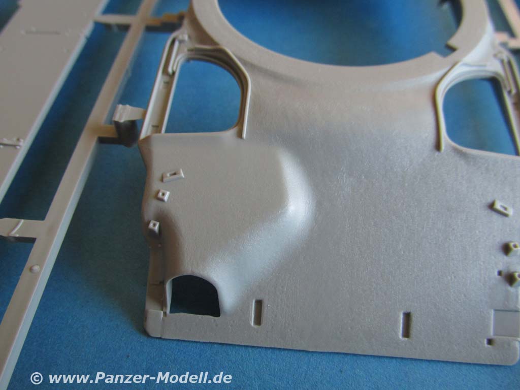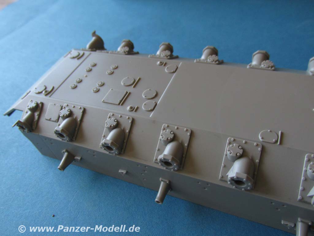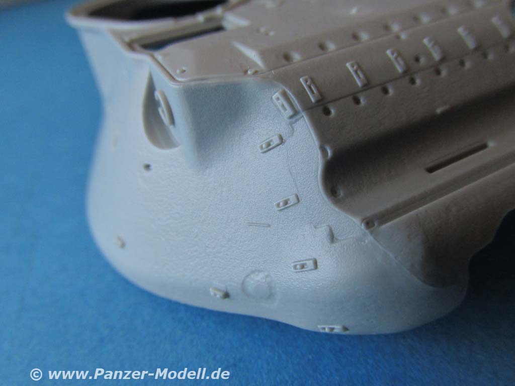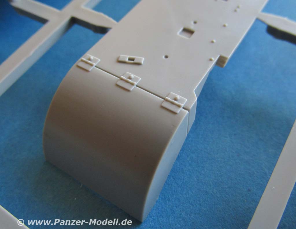 Die Oberwanne ist einteilig und weist eine wunderschöne, realistische Gussstruktur auf, die nicht zu übertrieben ist. Fahrer- und Funkerluke sind offen oder geschlossen baubar.