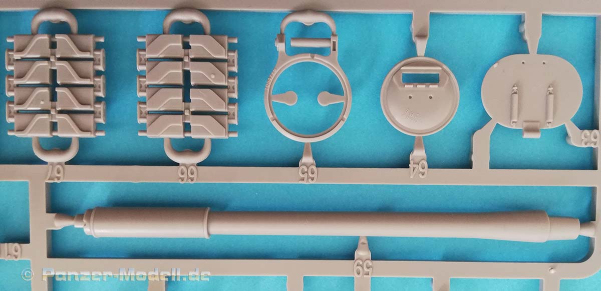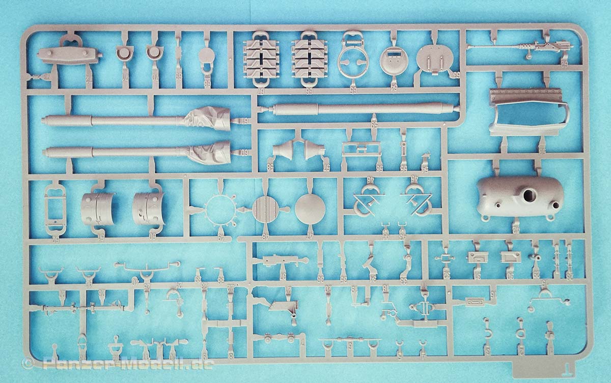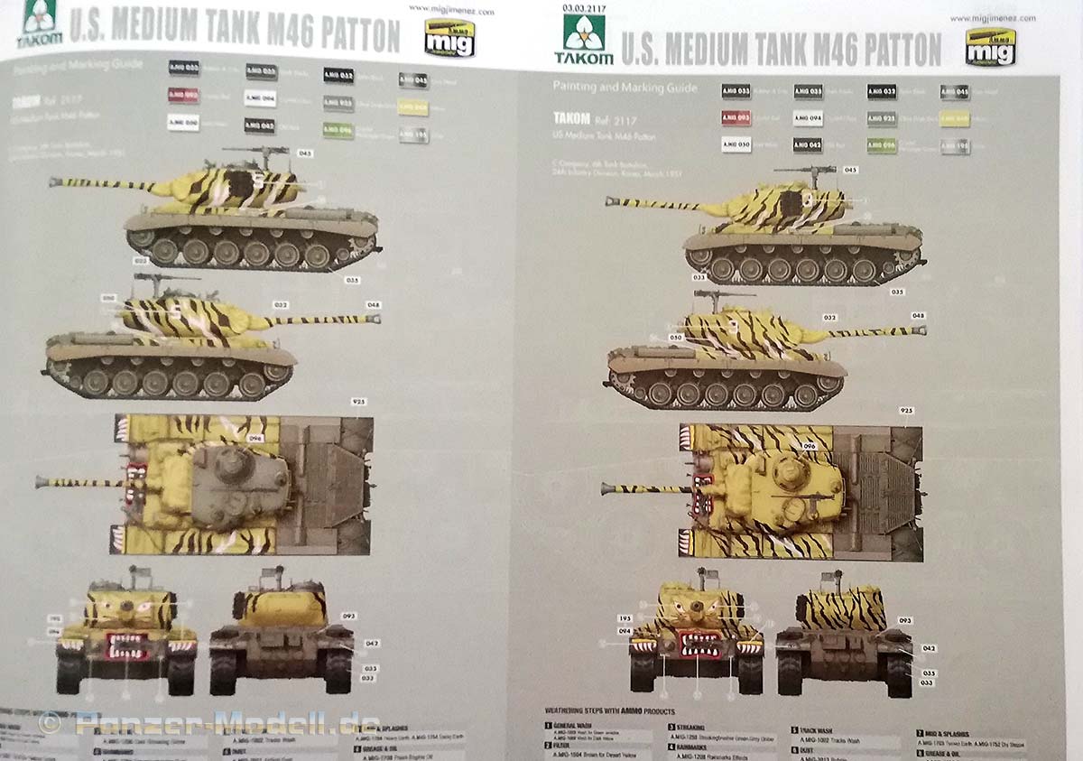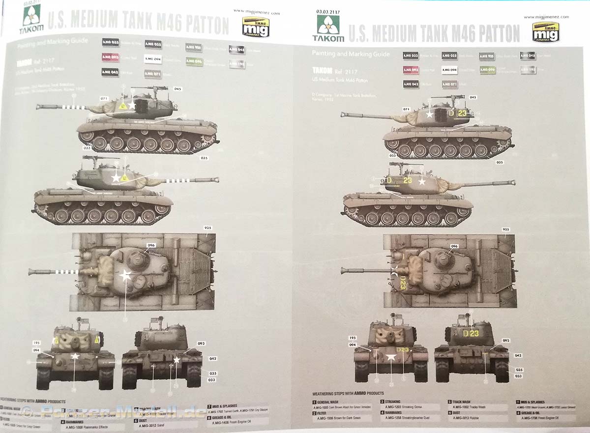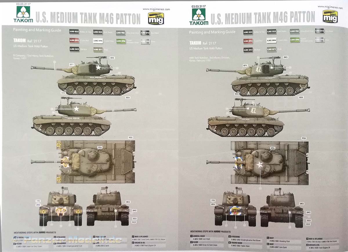 Die einzelnen Spritzlinge sehen hervorragend aus. Es finden sich natürlich weder Fischhäute noch Grate. Die Auswerferstellen findet man nur an später nicht mehr sichtbaren Stellen, mit Ausnahme der Ketten, hier finden sich die Auswerfermarken im teilweise sichtbaren Bereich, diese sind aber so fein, dass sie ohne Probleme sehr leicht verschliffen werden können. Die Wanne ist aus einem Stück gegossen, und weist hervorragende Hinterschneidungen und Details auf. Die Schwingarme werden einzeln eingesteckt und die Dämpfer angeklebt danach können die Schwingarme in der korrekten Position unter Zuhilfenahme der beiliegenden Lehren in der korrekten Position ausgerichtet werden. Perfekt. Im weiteren Verlauf kann dann die Kette unter Zuhilfenahme dieser Lehren stressfrei montiert werden. Hier hat der Modellbauer dann die Wahl zwischen zwei verschiedenen Kettentypen: Der T84E1 Kette mit Gummipolstern oder der T80E1 mit Stahlgreifern. Welche Version hier genommen wird hängt von dem zu bauenden Fahrzeug ab. Leider hat Takom es hier versäumt, in der Bauanleitung auf das entsprechende Farbschema hinzuweisen, bei welchem Panzer welche Kette gefahren wurde. Hier ist also Eigenrecherche angesagt. (Dies gilt im übrigen auch für die Verwendung der Wetterschutzplanen der Kanonenblende und der Seitenschürzen Wetterschutzplanen waren meistens vorhanden, Kettenschürzen fast nie) Wer allerdings andere Ketten aufziehen möchte, findet eine Auswahl im Aftermarket Bereich. Die Oberwanne macht einen sehr schönen Eindruck, mit filigranen Lüftungsgittern und einer wunderbar dargestellten rauen Gussstruktur und feinsten Gussnummern. Dieses beides findet sich auch am hervorragend getroffenen Turm. Hier, wie auch an der Oberwanne, werden schön detaillierte Anbauteile verbaut. Die hohe Qualität zieht sich durch den ganzen Bausatz. Alle Besatzungsluken können offen oder geschlossen gebaut werden, für die Optiken liegen Glasteile bei. Ein gutes Browning M2 .Cal 50 MG kann auf dem Turm montiert werden. Alle Griffe liegen separat bei -hier kann sich manch anderer Hersteller eine Scheibe abschneiden! Das Rohr der Hauptbewaffnung liegt zweimal bei, einmal in zwei Hälften mit einer tollen Wetterschutzplane, die einen natürlichen Faltenwurf zeigt, und einmal in einem Stück für die ebenfalls vorhandene „nackte“ Kanonenblende. Auch liegt ein Zielscheinwerfer bei, dieser ist aber ein typisches Ausstattungsmerkmal der Marine Corps Panzer und sollte nur bei diesen Verwendet werden. Der Scheinwerfer an sich ist Top detailliert und macht einen hervorragenden Eindruck. Vielleicht soll hier auch das Stück Kupferdraht Verwendung finden, ansonsten habe ich es nicht in der Bauanleitung gefunden vielleicht habe ich es aber auch nur übersehen…… Die Bauanleitung im typischen Takom Stil beinhaltet auf dem Cover einen kurzen Abriss über die Geschichte des M46 und führt dann in 27 Schritten zum fertigen Modell. Ab Baustufe 25 kann man wählen, ob man ein Fahrzeug mit oder ohne Wetterschutzplane bauen möchte hier also aufpassen! Die Decal Optionen erlauben die Darstellung von NEUN Fahrzeugen: Sechs Fahrzeuge der US Army in Korea, eingesetzt zwischen 1951 und 1955 davon vier mit „Tigerfaces“ und eines in Wintertarnung. Drei Fahrzeuge dse US Marine Corps, eingesetzt in Korea zwischen 1952 und 1953 davon eines mit Zielscheinwerfer. Mein Fazit: Eine absolute Kaufempfehlung Ein toller Bausatz aus einem (leider immer noch) vernachlässigtem Themengebiet. LEIDER ist der Modellbauer hier auf Eigenrecherche angewiesen, wenn er ein bestimmtes Fahrzeug darstellen möchte. Wer allerdings einen „typischen“ M46 aus dem Koreakrieg bauen will, der kann hier voller Freude sofort losbasteln.