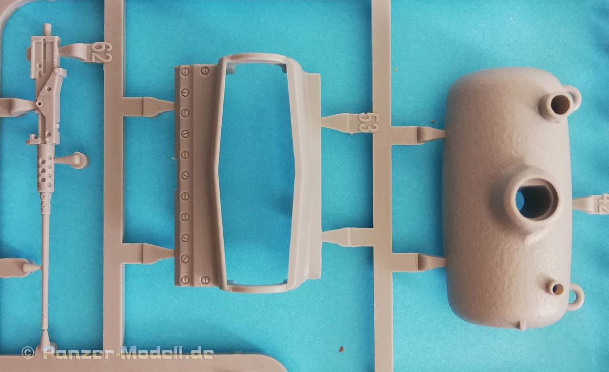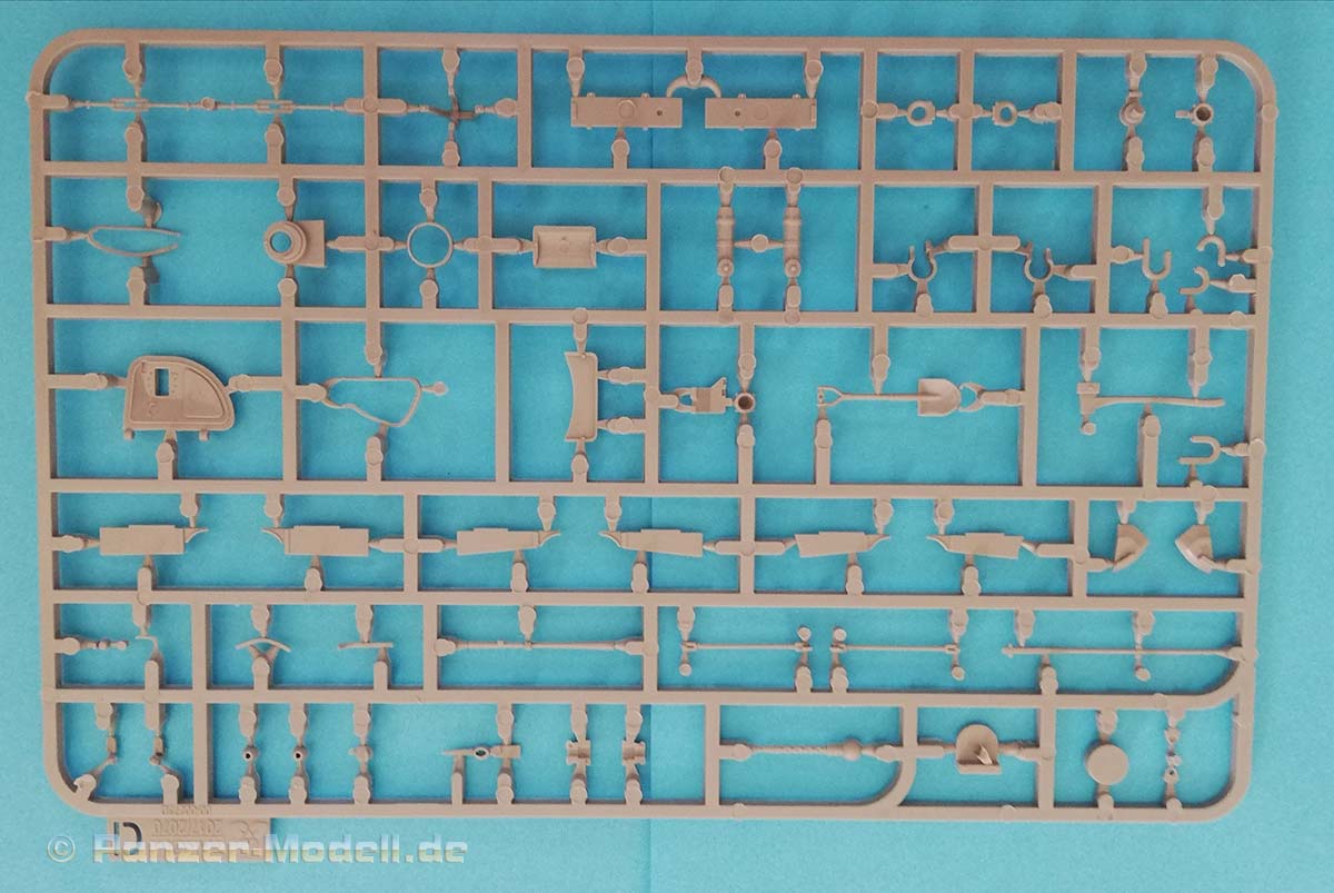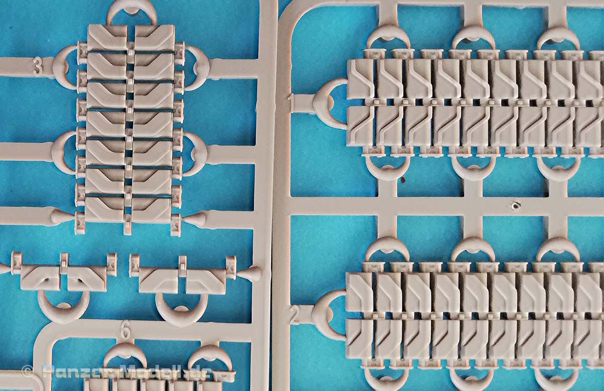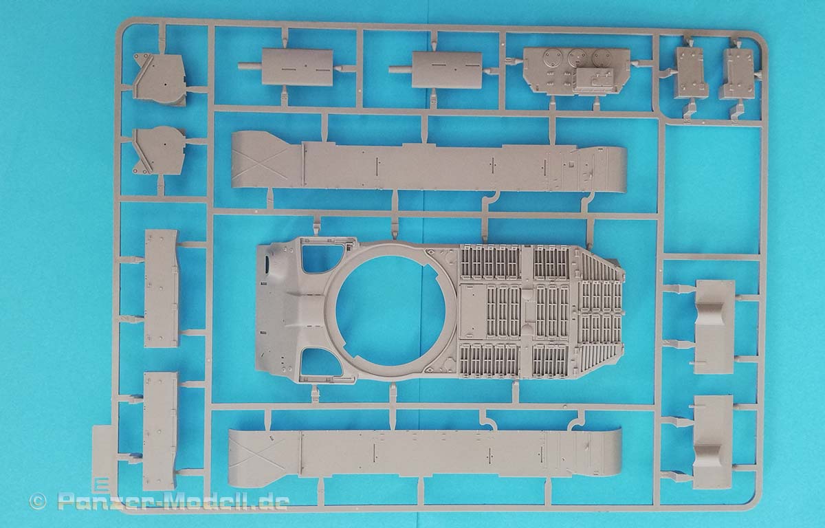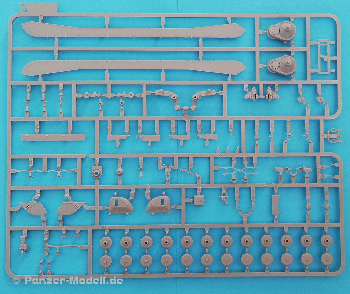 Die einzelnen Spritzlinge sehen hervorragend aus. Es finden sich natürlich weder Fischhäute noch Grate. Die Auswerferstellen findet man nur an später nicht mehr sichtbaren Stellen, mit Ausnahme der Ketten, hier finden sich die Auswerfermarken im teilweise sichtbaren Bereich, diese sind aber so fein, dass sie ohne Probleme sehr leicht verschliffen werden können. Die Wanne ist aus einem Stück gegossen, und weist hervorragende Hinterschneidungen und Details auf. Die Schwingarme werden einzeln eingesteckt und die Dämpfer angeklebt danach können die Schwingarme in der korrekten Position unter Zuhilfenahme der beiliegenden Lehren in der korrekten Position ausgerichtet werden. Perfekt. Im weiteren Verlauf kann dann die Kette unter Zuhilfenahme dieser Lehren stressfrei montiert werden. Hier hat der Modellbauer dann die Wahl zwischen zwei verschiedenen Kettentypen: Der T84E1 Kette mit Gummipolstern oder der T80E1 mit Stahlgreifern. Welche Version hier genommen wird hängt von dem zu bauenden Fahrzeug ab. Leider hat Takom es hier versäumt, in der Bauanleitung auf das entsprechende Farbschema hinzuweisen, bei welchem Panzer welche Kette gefahren wurde. Hier ist also Eigenrecherche angesagt. (Dies gilt im übrigen auch für die Verwendung der Wetterschutzplanen der Kanonenblende und der Seitenschürzen Wetterschutzplanen waren meistens vorhanden, Kettenschürzen fast nie) Wer allerdings andere Ketten aufziehen möchte, findet eine Auswahl im Aftermarket Bereich. Die Oberwanne macht einen sehr schönen Eindruck, mit filigranen Lüftungsgittern und einer wunderbar dargestellten rauen Gussstruktur und feinsten Gussnummern. Dieses beides findet sich auch am hervorragend getroffenen Turm. Hier, wie auch an der Oberwanne, werden schön detaillierte Anbauteile verbaut. Die hohe Qualität zieht sich durch den ganzen Bausatz. Alle Besatzungsluken können offen oder geschlossen gebaut werden, für die Optiken liegen Glasteile bei. Ein gutes Browning M2 .Cal 50 MG kann auf dem Turm montiert werden. Alle Griffe liegen separat bei -hier kann sich manch anderer Hersteller eine Scheibe abschneiden! Das Rohr der Hauptbewaffnung liegt zweimal bei, einmal in zwei Hälften mit einer tollen Wetterschutzplane, die einen natürlichen Faltenwurf zeigt, und einmal in einem Stück für die ebenfalls vorhandene „nackte“ Kanonenblende. Auch liegt ein Zielscheinwerfer bei, dieser ist aber ein typisches Ausstattungsmerkmal der Marine Corps Panzer und sollte nur bei diesen Verwendet werden. Der Scheinwerfer an sich ist Top detailliert und macht einen hervorragenden Eindruck. Vielleicht soll hier auch das Stück Kupferdraht Verwendung finden, ansonsten habe ich es nicht in der Bauanleitung gefunden vielleicht habe ich es aber auch nur übersehen…… Die Bauanleitung im typischen Takom Stil beinhaltet auf dem Cover einen kurzen Abriss über die Geschichte des M46 und führt dann in 27 Schritten zum fertigen Modell. Ab Baustufe 25 kann man wählen, ob man ein Fahrzeug mit oder ohne Wetterschutzplane bauen möchte hier also aufpassen! Die Decal Optionen erlauben die Darstellung von NEUN Fahrzeugen: Sechs Fahrzeuge der US Army in Korea, eingesetzt zwischen 1951 und 1955 davon vier mit „Tigerfaces“ und eines in Wintertarnung. Drei Fahrzeuge dse US Marine Corps, eingesetzt in Korea zwischen 1952 und 1953 davon eines mit Zielscheinwerfer. Mein Fazit: Eine absolute Kaufempfehlung Ein toller Bausatz aus einem (leider immer noch) vernachlässigtem Themengebiet. LEIDER ist der Modellbauer hier auf Eigenrecherche angewiesen, wenn er ein bestimmtes Fahrzeug darstellen möchte. Wer allerdings einen „typischen“ M46 aus dem Koreakrieg bauen will, der kann hier voller Freude sofort losbasteln.