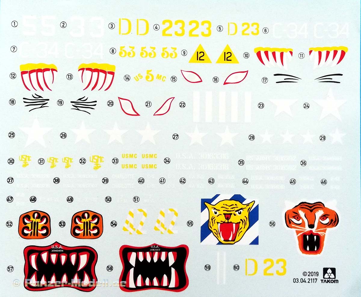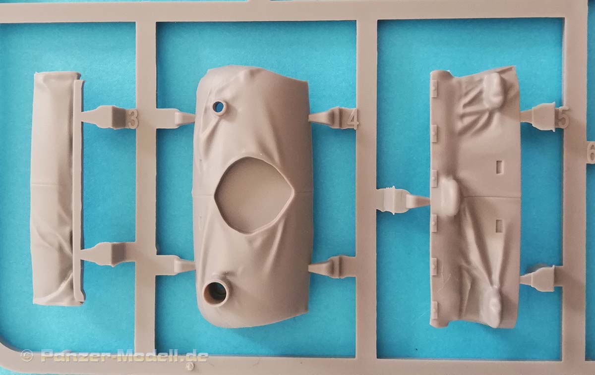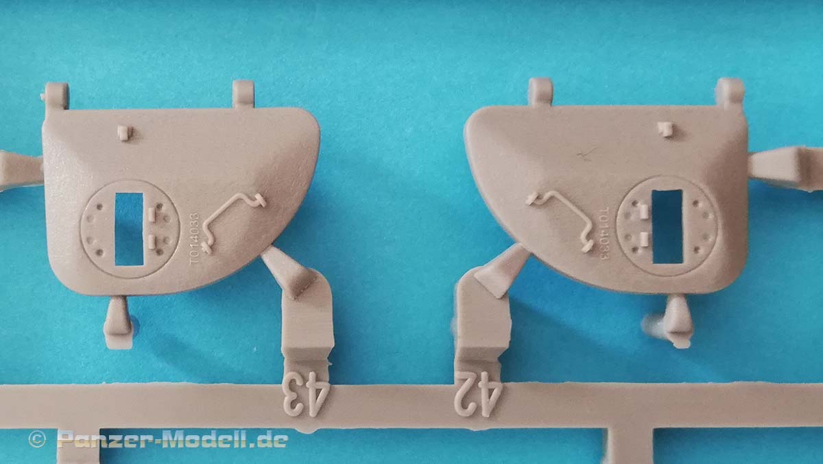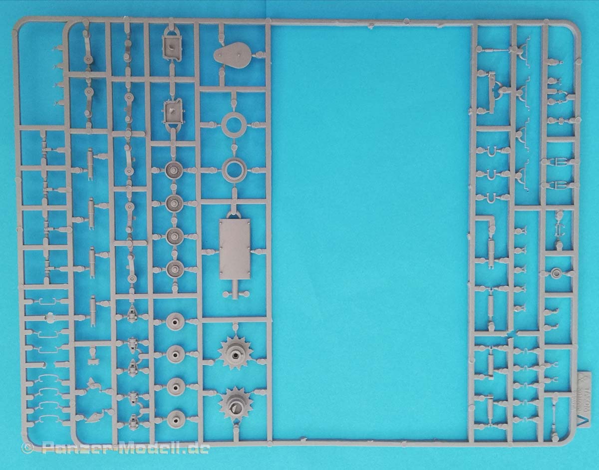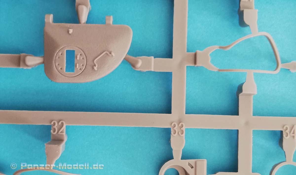 Die einzelnen Spritzlinge sehen hervorragend aus. Es finden sich natürlich weder Fischhäute noch Grate. Die Auswerferstellen findet man nur an später nicht mehr sichtbaren Stellen, mit Ausnahme der Ketten, hier finden sich die Auswerfermarken im teilweise sichtbaren Bereich, diese sind aber so fein, dass sie ohne Probleme sehr leicht verschliffen werden können. Die Wanne ist aus einem Stück gegossen, und weist hervorragende Hinterschneidungen und Details auf. Die Schwingarme werden einzeln eingesteckt und die Dämpfer angeklebt danach können die Schwingarme in der korrekten Position unter Zuhilfenahme der beiliegenden Lehren in der korrekten Position ausgerichtet werden. Perfekt. Im weiteren Verlauf kann dann die Kette unter Zuhilfenahme dieser Lehren stressfrei montiert werden. Hier hat der Modellbauer dann die Wahl zwischen zwei verschiedenen Kettentypen: Der T84E1 Kette mit Gummipolstern oder der T80E1 mit Stahlgreifern. Welche Version hier genommen wird hängt von dem zu bauenden Fahrzeug ab. Leider hat Takom es hier versäumt, in der Bauanleitung auf das entsprechende Farbschema hinzuweisen, bei welchem Panzer welche Kette gefahren wurde. Hier ist also Eigenrecherche angesagt. (Dies gilt im übrigen auch für die Verwendung der Wetterschutzplanen der Kanonenblende und der Seitenschürzen Wetterschutzplanen waren meistens vorhanden, Kettenschürzen fast nie) Wer allerdings andere Ketten aufziehen möchte, findet eine Auswahl im Aftermarket Bereich. Die Oberwanne macht einen sehr schönen Eindruck, mit filigranen Lüftungsgittern und einer wunderbar dargestellten rauen Gussstruktur und feinsten Gussnummern. Dieses beides findet sich auch am hervorragend getroffenen Turm. Hier, wie auch an der Oberwanne, werden schön detaillierte Anbauteile verbaut. Die hohe Qualität zieht sich durch den ganzen Bausatz. Alle Besatzungsluken können offen oder geschlossen gebaut werden, für die Optiken liegen Glasteile bei. Ein gutes Browning M2 .Cal 50 MG kann auf dem Turm montiert werden. Alle Griffe liegen separat bei -hier kann sich manch anderer Hersteller eine Scheibe abschneiden! Das Rohr der Hauptbewaffnung liegt zweimal bei, einmal in zwei Hälften mit einer tollen Wetterschutzplane, die einen natürlichen Faltenwurf zeigt, und einmal in einem Stück für die ebenfalls vorhandene „nackte“ Kanonenblende. Auch liegt ein Zielscheinwerfer bei, dieser ist aber ein typisches Ausstattungsmerkmal der Marine Corps Panzer und sollte nur bei diesen Verwendet werden. Der Scheinwerfer an sich ist Top detailliert und macht einen hervorragenden Eindruck. Vielleicht soll hier auch das Stück Kupferdraht Verwendung finden, ansonsten habe ich es nicht in der Bauanleitung gefunden vielleicht habe ich es aber auch nur übersehen…… Die Bauanleitung im typischen Takom Stil beinhaltet auf dem Cover einen kurzen Abriss über die Geschichte des M46 und führt dann in 27 Schritten zum fertigen Modell. Ab Baustufe 25 kann man wählen, ob man ein Fahrzeug mit oder ohne Wetterschutzplane bauen möchte hier also aufpassen! Die Decal Optionen erlauben die Darstellung von NEUN Fahrzeugen: Sechs Fahrzeuge der US Army in Korea, eingesetzt zwischen 1951 und 1955 davon vier mit „Tigerfaces“ und eines in Wintertarnung. Drei Fahrzeuge dse US Marine Corps, eingesetzt in Korea zwischen 1952 und 1953 davon eines mit Zielscheinwerfer. Mein Fazit: Eine absolute Kaufempfehlung Ein toller Bausatz aus einem (leider immer noch) vernachlässigtem Themengebiet. LEIDER ist der Modellbauer hier auf Eigenrecherche angewiesen, wenn er ein bestimmtes Fahrzeug darstellen möchte. Wer allerdings einen „typischen“ M46 aus dem Koreakrieg bauen will, der kann hier voller Freude sofort losbasteln.