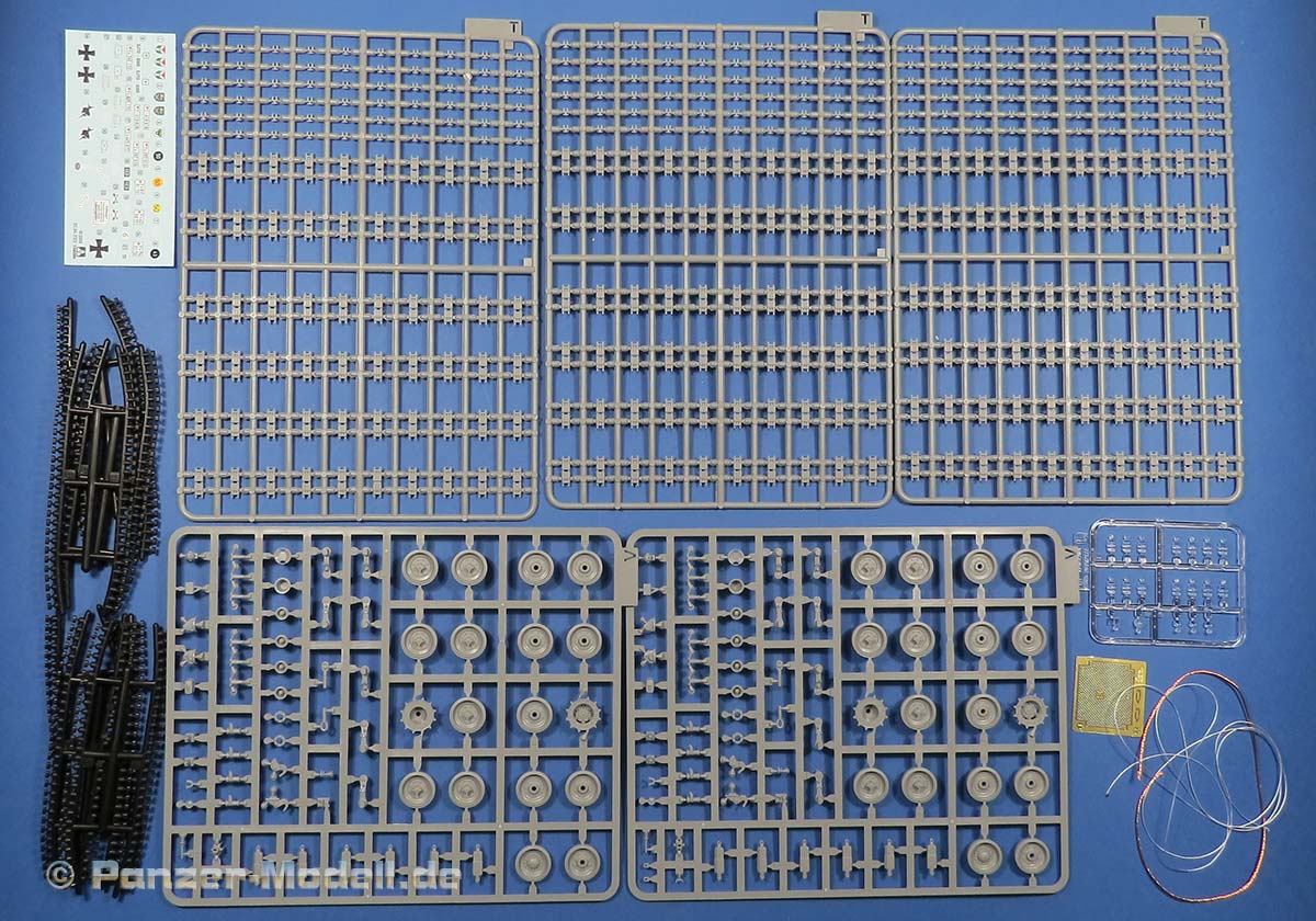 Einige der Spritzlinge, wie etwa für die Kette und für das Laufwerk sind bereits von vorigen Leopard 1 Bausätzen von Takom bekannt. Die restlichen sind komplett neu für den Bergepanzer gemacht.