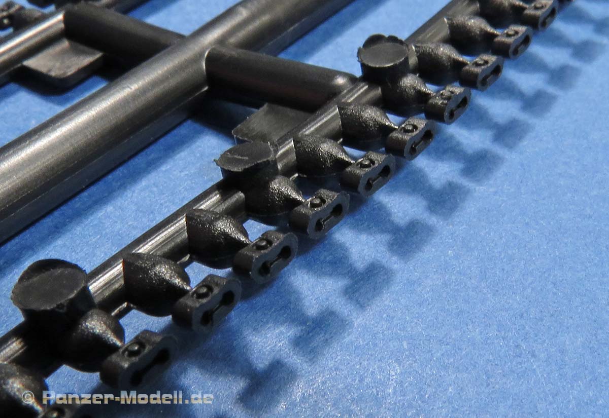 Insgesamt zwar eine Menge Arbeit, denn jeder Kettenglied sitzt an 4 Angüssen, dazu die Mittelverbinder an zwei Angüssen und die Endverbinder an einem Anguss - diese alle müssen abgetrennt und versäubert werden. Das nimmt Zeit in Anspruch, aber am ende besser und einfacher als Kettenglieder, die sich noch aus Ober- und Unterseite zusammensetzen.