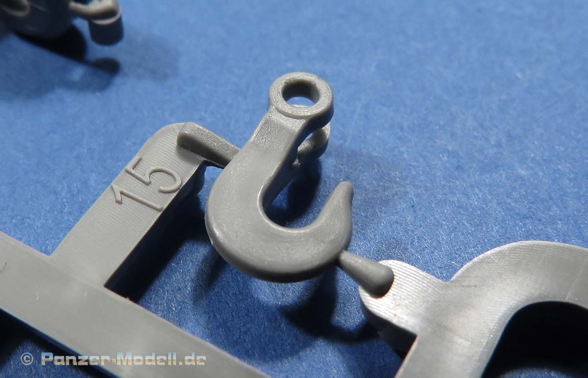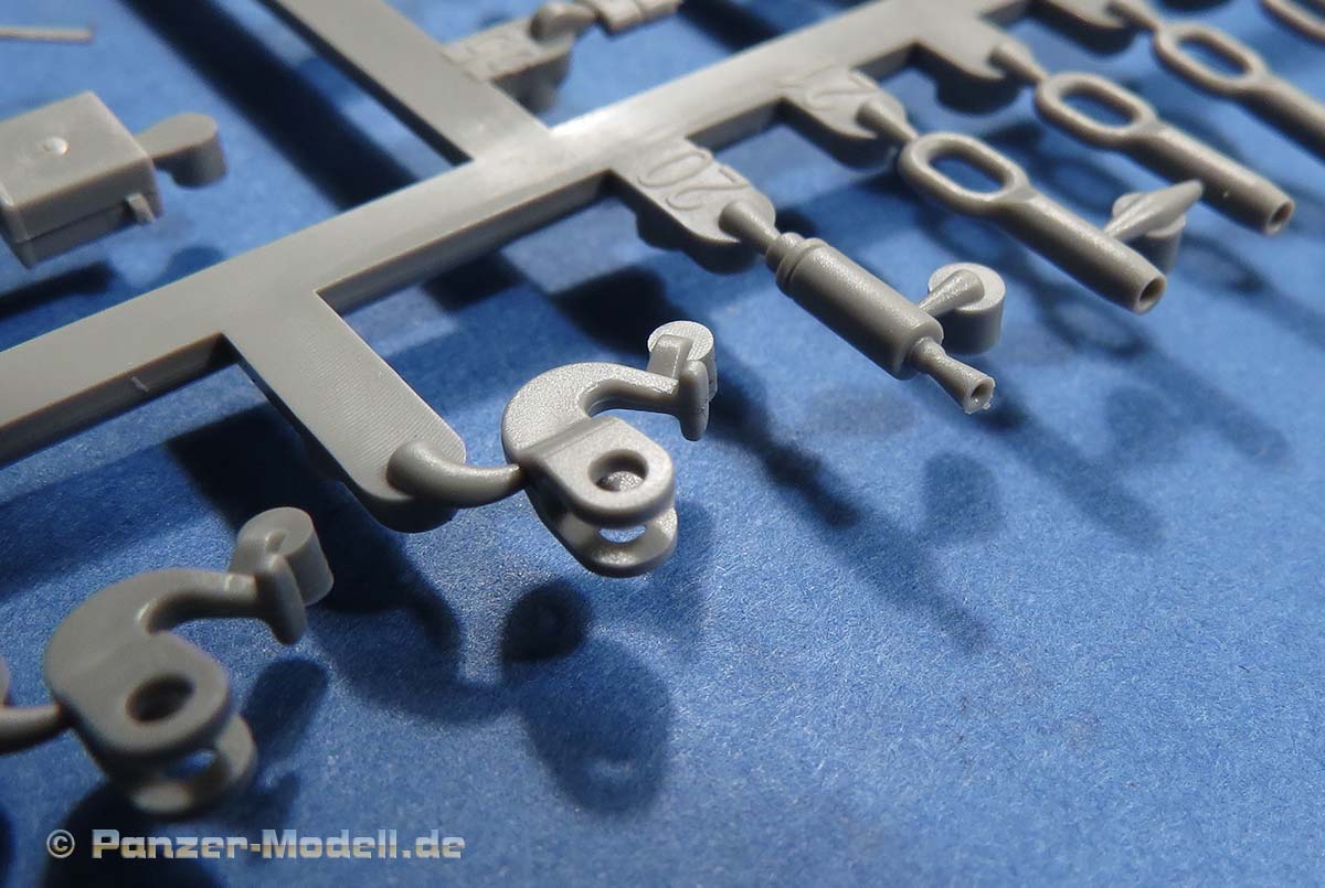 Natürlich sind sämtliche Werkzeuge, die zusätzlichen Schäkel, Eisgreifer wie am Original auch hier vorhanden und werden auf die Wannenseiten geklebt. Die Halterungen sind bereits entsprechend mit angegossen.