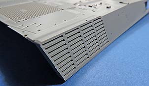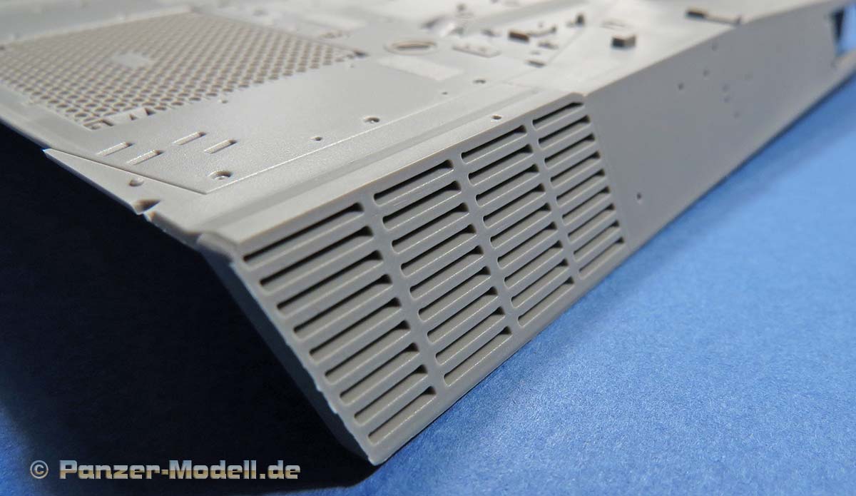 Das Motorlüftergitter auf dem Motordeck ist bereits in Plastik gespritzt mit beachtlich feiner Struktur über die das Oberflächengitter aus PE Platine geklebt wird und damit den perfekten optischen Eindruck erwecken dürfte.