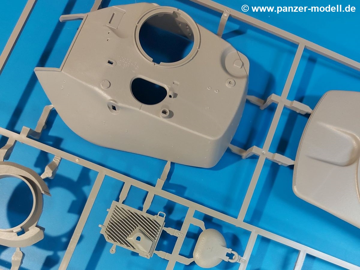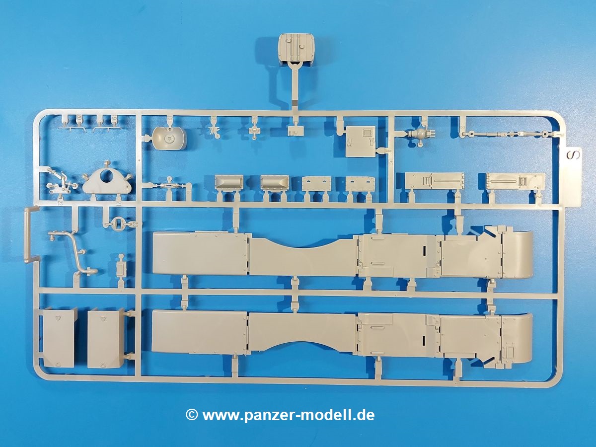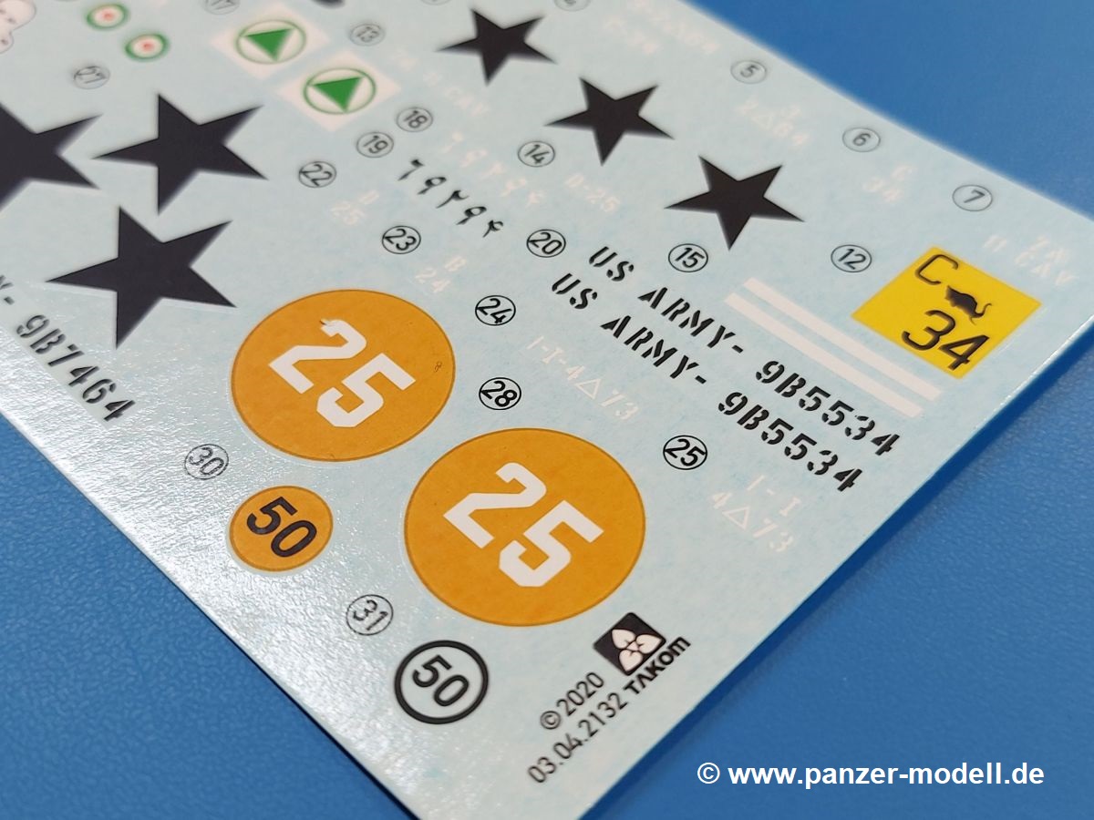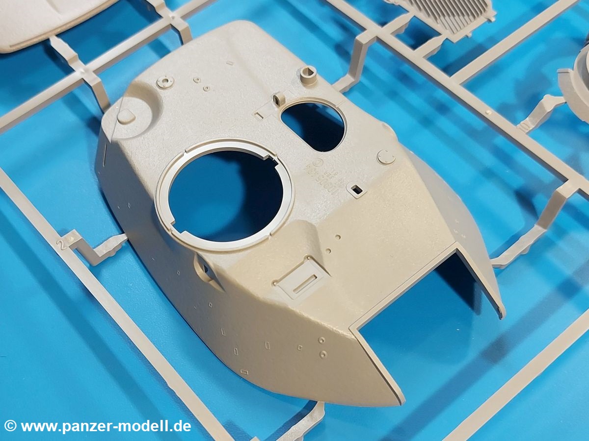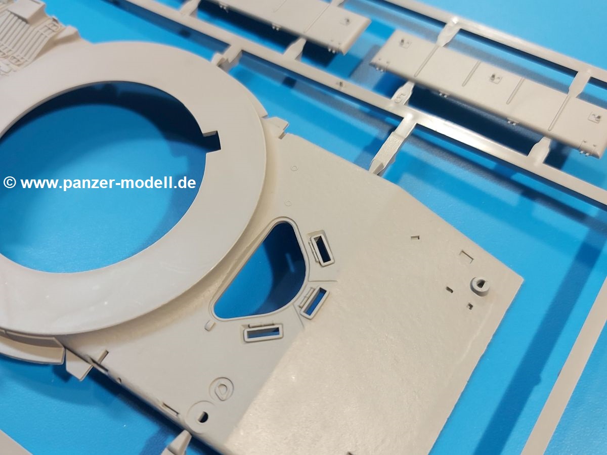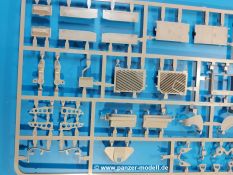 Das Original: Der M-60 ist ein Kampfpanzer aus der Zeit des kalten Krieges, der auch heute noch bei einigen Ländern im Einsatz steht. Er war der Nachfolger des M-48, was man bei der ersten Version noch deutlich an der Turmform sehen konnte. Ab der Version M-60 A1 bekam er einen größeren, neu konzipierten Turm. Er wiegt ab A1 fast 53 Tonnen und erreicht mit seinem 750 PS Motor eine Höchstgeschwindigkeit von 48 km/h auf der Straße und 32 km/h im Gelände. Seine Bewaffnung besteht aus einer 105 mm M68 Kanone, einem M240 MG und einem M85 MG. Zum Gefecht stehen der 4-köpfigen Besatzung 63 Schuss 105 mm, 6000 Schuss 7,62 mm und 900 Schuss 12,7 mm Munition zur Verfügung. Konzipiert um gegen sowjetische T-54 bestehen zu können, konnte er sich in der Operation Desert Storm auch gegen T-55 und T-72 behaupten. Im Laufe der Jahre erhielt er weitere Kampfwertsteigerungen, zuletzt als M-60 A3 TTS. Der Bausatz: Bereits vor 2 Jahren hatte TAKOM den M-60 A1 mit ERA herausgebracht. Danach war in Richtung M-60 erst einmal Ruhe. Nun liegt vor uns der ursprüngliche M-60 A1 Der Karton ist 380 x 250 x 85 mm groß und gut bepackt. Die Spritzlinge sind in größtenteils wieder verschließbaren Klarsichttütchen verpackt. Wir finden im Karton 11 hellgraue Spritzlinge, 2 Klarsichtspritzlinge, die Unterwanne, eine PE-Platine, 1 Draht, 2 Stahlstifte und 1 Decalbogen. Dazu kommt eine 20-seitige Bauanleitung. Die Unterwanne ist einteilig und weist bereits viele, feine, saubere Details wie Notausstiegsluke, Wartungsdeckel und für die Aufnahme der Laufwerkskomponenten auf. Hinzu kommen feine, aber deutliche Gussnummern. Auch die Gussstruktur ist gut wiedergegeben. Die Laufwerkskomponenten bestehen aus den Stoßdämpfern und Endanschlägen der Schwingarme. Diese setzen sich mehrteilig zusammen und werden dann fest und arretiert in die Aufnahmen in der Unterwanne eingeklebt. Die Laufrollen setzen sich aus den Radkörper und der Laufrollengummierung in Spritzguss zusammen, wobei der innere Teil der Doppellaufrolle einteilig ausgeführt ist. Der Detailgrad ist hier wirklich höchst erfreulich und scharf und durch die separate Gummierung für die Außenlaufrolle bekommt man perfekt die markante M60 Laufrolle mit der Hinterschneidung des Felgenrandes dargestellt. Die Oberwanne besteht aus einem Teil, das den Vorderrumpf (mit offen darstellbarer Fahrerluke und Aussparungen für die Winkelspiegel) und die Motorabdeckung mit den geriffelten Wartungsklappen umfasst. Die Kettenbleche werden mit gelochten Halterungen, vielen großen, aber fein detaillierten Staukästen versehen und später separat an die Wanne geklebt. Die markanten Hecktüren mit ihren Schrägriffelungen weisen eine gute Tiefe auf. Im Bausatz liegt auch noch die Hecktür zum Verbau des Teifwatauspuffs bei, ist aber nicht für diesen Bausatz vorgesehen. Der Turm besteht aus Unter- und Oberteil. Wie bereits an der Wanne konnten wir eine gute Gußstruktur und Gußnummern entdecken, die auch die Kommandantenkuppel auszeichnen. Die Kuppel lässt sich schwenkbar bauen, ebenso das 12,7 mm MG, wenn man sich für die Version ohne Allwetterplane entscheidet. Die Kommandanten- wie auch die Ladeschützenluke können offen oder geschlossen angebaut werden. Die Abschleppseile werden aus Kupferdraht und Seilkauschen aus Plastik hergestellt und in die Haltehaken aus PE jeweils vom Turmheck zu den Seiten geführt. Der Turmstaukorb besteht aus 7 Plastikteilen und 2 PE-Gittern. Während man das Bodengitter so verkleben kann, muss das zweite Gitter erst mittels einer im Bausatz enthaltenen Biegeform gebogen werden. Die 105mm M68 Kanone besteht aus einem einteiligen Rohr, leider ohne Züge und Felder an der Mündung, und wird mit dem 2-teiligen Rauchabsauger ergänzt. Da die Blende samt Plane ausgebildet ist, wird die Kanone nicht höhenrichtbar sein. Der große Schießscheinwerfer hat schöne Innendetails, die auch durch die große, kristallklare Scheibe gut zu sehen sein werden. Die Halterung des Scheinwerfers hat mit 10 Teilen doppelt so viele Teile wie der Scheinwerfer selbst. Die Decals sind seidenmatt glänzend und scharf gedruckt. Damit lassen sich 5 Fahrzeuge darstellen: