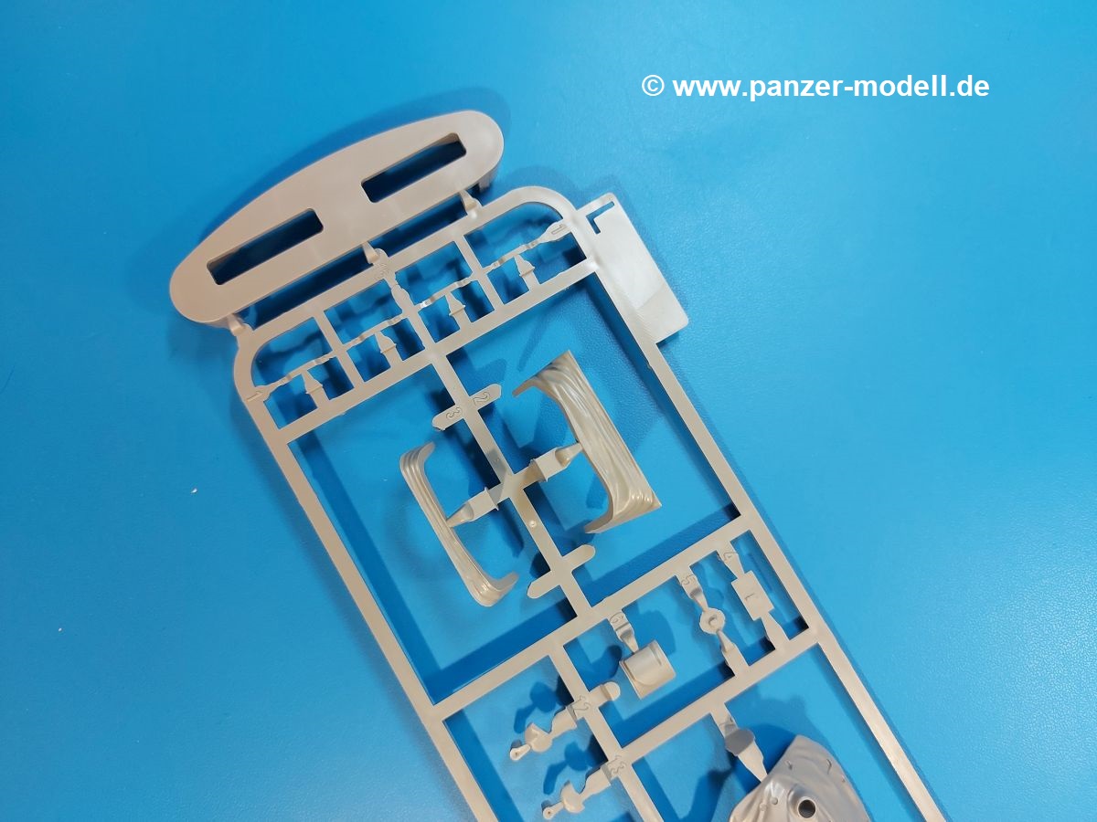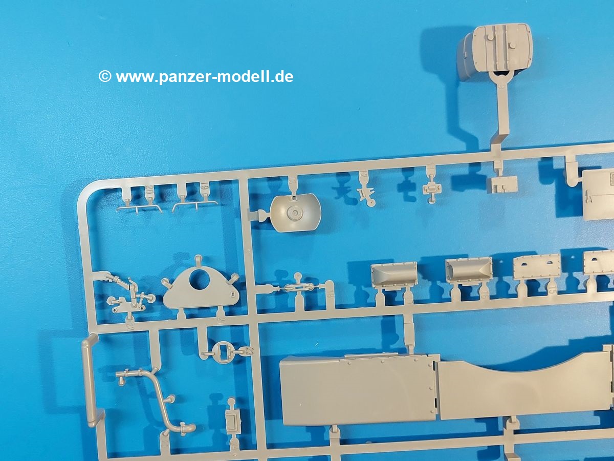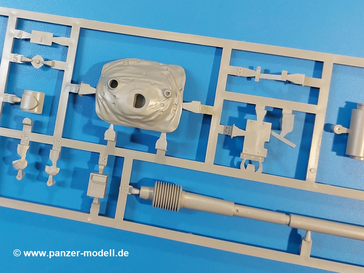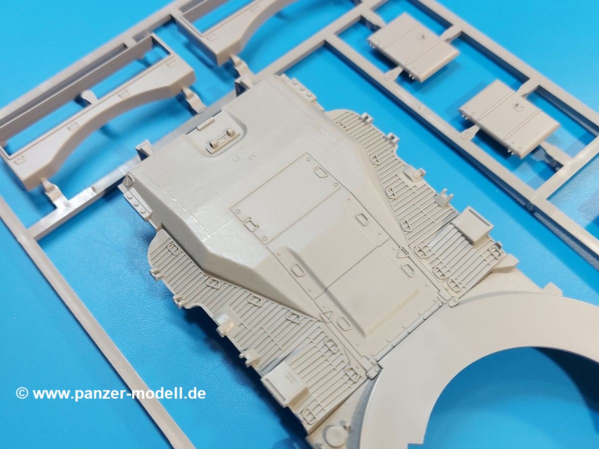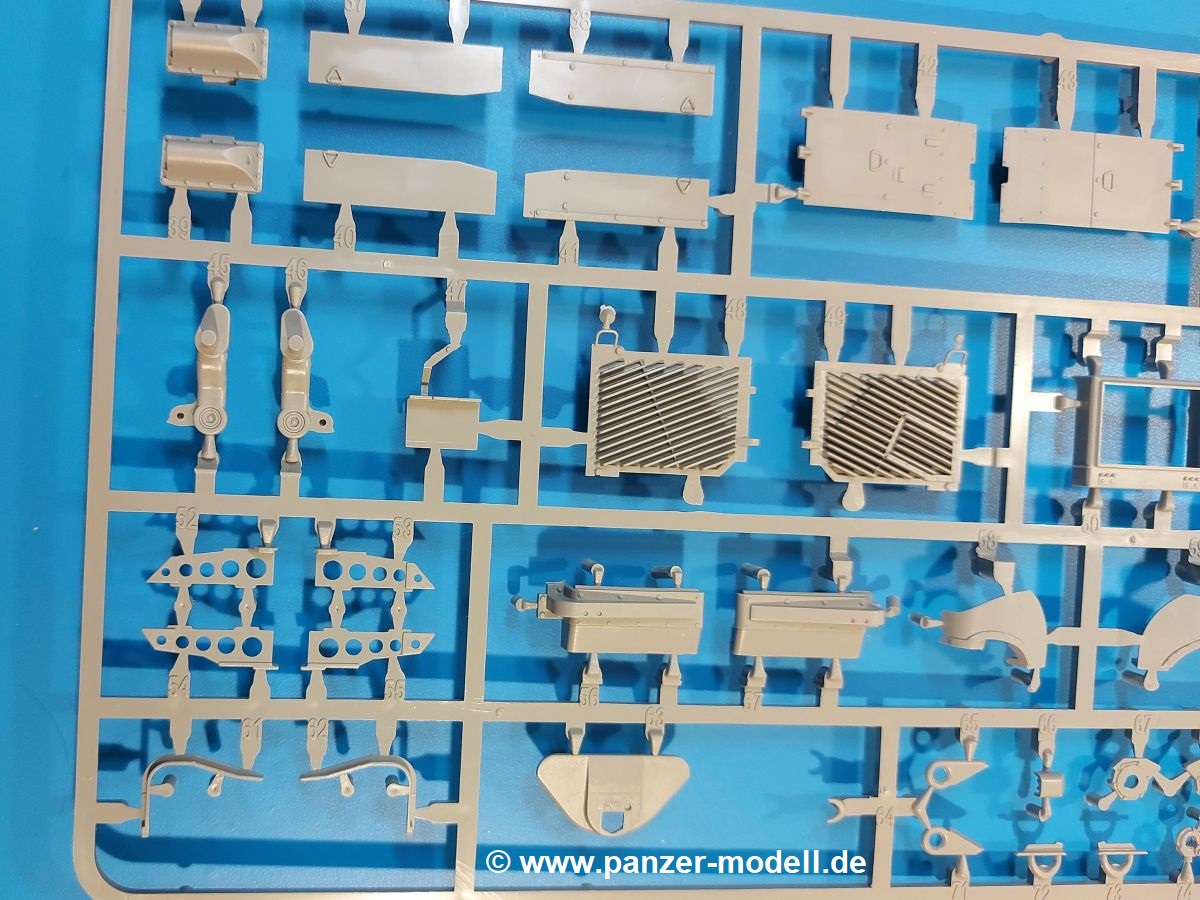 Das Original: Der M-60 ist ein Kampfpanzer aus der Zeit des kalten Krieges, der auch heute noch bei einigen Ländern im Einsatz steht. Er war der Nachfolger des M-48, was man bei der ersten Version noch deutlich an der Turmform sehen konnte. Ab der Version M-60 A1 bekam er einen größeren, neu konzipierten Turm. Er wiegt ab A1 fast 53 Tonnen und erreicht mit seinem 750 PS Motor eine Höchstgeschwindigkeit von 48 km/h auf der Straße und 32 km/h im Gelände. Seine Bewaffnung besteht aus einer 105 mm M68 Kanone, einem M240 MG und einem M85 MG. Zum Gefecht stehen der 4-köpfigen Besatzung 63 Schuss 105 mm, 6000 Schuss 7,62 mm und 900 Schuss 12,7 mm Munition zur Verfügung. Konzipiert um gegen sowjetische T-54 bestehen zu können, konnte er sich in der Operation Desert Storm auch gegen T-55 und T-72 behaupten. Im Laufe der Jahre erhielt er weitere Kampfwertsteigerungen, zuletzt als M-60 A3 TTS. Der Bausatz: Bereits vor 2 Jahren hatte TAKOM den M-60 A1 mit ERA herausgebracht. Danach war in Richtung M-60 erst einmal Ruhe. Nun liegt vor uns der ursprüngliche M-60 A1 Der Karton ist 380 x 250 x 85 mm groß und gut bepackt. Die Spritzlinge sind in größtenteils wieder verschließbaren Klarsichttütchen verpackt. Wir finden im Karton 11 hellgraue Spritzlinge, 2 Klarsichtspritzlinge, die Unterwanne, eine PE-Platine, 1 Draht, 2 Stahlstifte und 1 Decalbogen. Dazu kommt eine 20-seitige Bauanleitung. Die Unterwanne ist einteilig und weist bereits viele, feine, saubere Details wie Notausstiegsluke, Wartungsdeckel und für die Aufnahme der Laufwerkskomponenten auf. Hinzu kommen feine, aber deutliche Gussnummern. Auch die Gussstruktur ist gut wiedergegeben. Die Laufwerkskomponenten bestehen aus den Stoßdämpfern und Endanschlägen der Schwingarme. Diese setzen sich mehrteilig zusammen und werden dann fest und arretiert in die Aufnahmen in der Unterwanne eingeklebt. Die Laufrollen setzen sich aus den Radkörper und der Laufrollengummierung in Spritzguss zusammen, wobei der innere Teil der Doppellaufrolle einteilig ausgeführt ist. Der Detailgrad ist hier wirklich höchst erfreulich und scharf und durch die separate Gummierung für die Außenlaufrolle bekommt man perfekt die markante M60 Laufrolle mit der Hinterschneidung des Felgenrandes dargestellt. Die Oberwanne besteht aus einem Teil, das den Vorderrumpf (mit offen darstellbarer Fahrerluke und Aussparungen für die Winkelspiegel) und die Motorabdeckung mit den geriffelten Wartungsklappen umfasst. Die Kettenbleche werden mit gelochten Halterungen, vielen großen, aber fein detaillierten Staukästen versehen und später separat an die Wanne geklebt. Die markanten Hecktüren mit ihren Schrägriffelungen weisen eine gute Tiefe auf. Im Bausatz liegt auch noch die Hecktür zum Verbau des Teifwatauspuffs bei, ist aber nicht für diesen Bausatz vorgesehen. Der Turm besteht aus Unter- und Oberteil. Wie bereits an der Wanne konnten wir eine gute Gußstruktur und Gußnummern entdecken, die auch die Kommandantenkuppel auszeichnen. Die Kuppel lässt sich schwenkbar bauen, ebenso das 12,7 mm MG, wenn man sich für die Version ohne Allwetterplane entscheidet. Die Kommandanten- wie auch die Ladeschützenluke können offen oder geschlossen angebaut werden. Die Abschleppseile werden aus Kupferdraht und Seilkauschen aus Plastik hergestellt und in die Haltehaken aus PE jeweils vom Turmheck zu den Seiten geführt. Der Turmstaukorb besteht aus 7 Plastikteilen und 2 PE-Gittern. Während man das Bodengitter so verkleben kann, muss das zweite Gitter erst mittels einer im Bausatz enthaltenen Biegeform gebogen werden. Die 105mm M68 Kanone besteht aus einem einteiligen Rohr, leider ohne Züge und Felder an der Mündung, und wird mit dem 2-teiligen Rauchabsauger ergänzt. Da die Blende samt Plane ausgebildet ist, wird die Kanone nicht höhenrichtbar sein. Der große Schießscheinwerfer hat schöne Innendetails, die auch durch die große, kristallklare Scheibe gut zu sehen sein werden. Die Halterung des Scheinwerfers hat mit 10 Teilen doppelt so viele Teile wie der Scheinwerfer selbst. Die Decals sind seidenmatt glänzend und scharf gedruckt. Damit lassen sich 5 Fahrzeuge darstellen: