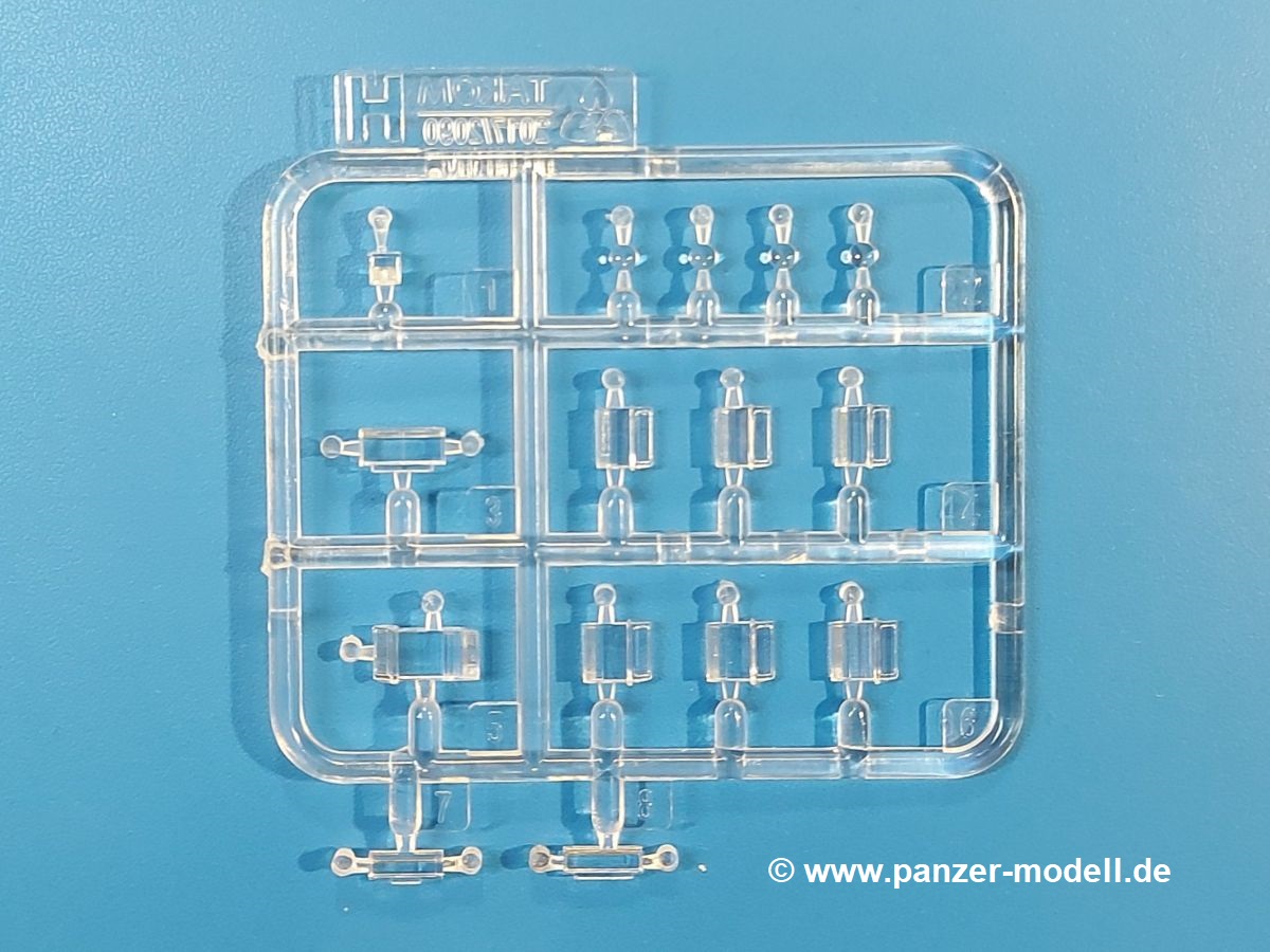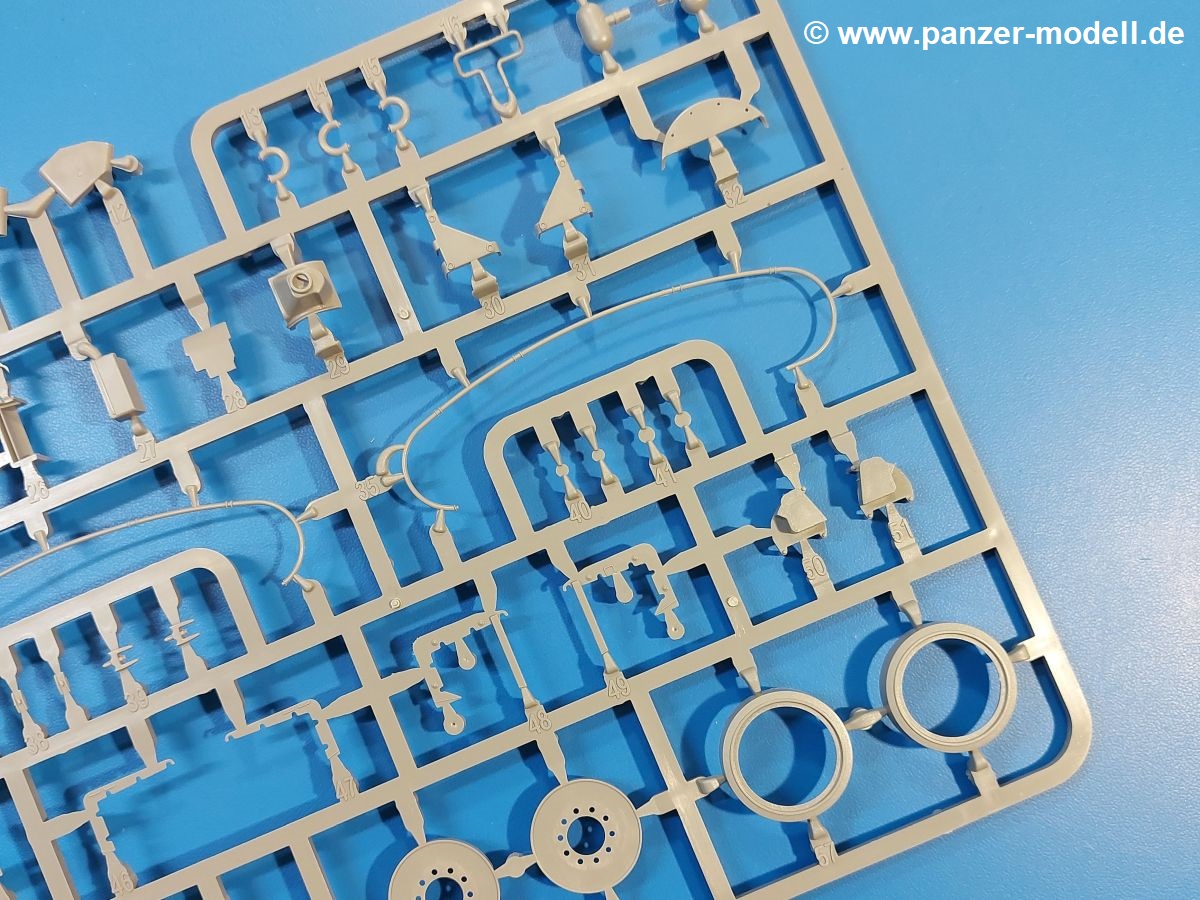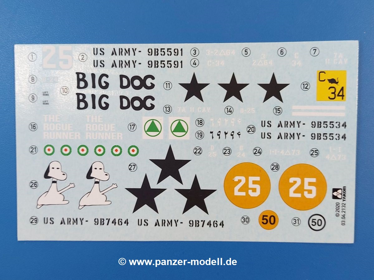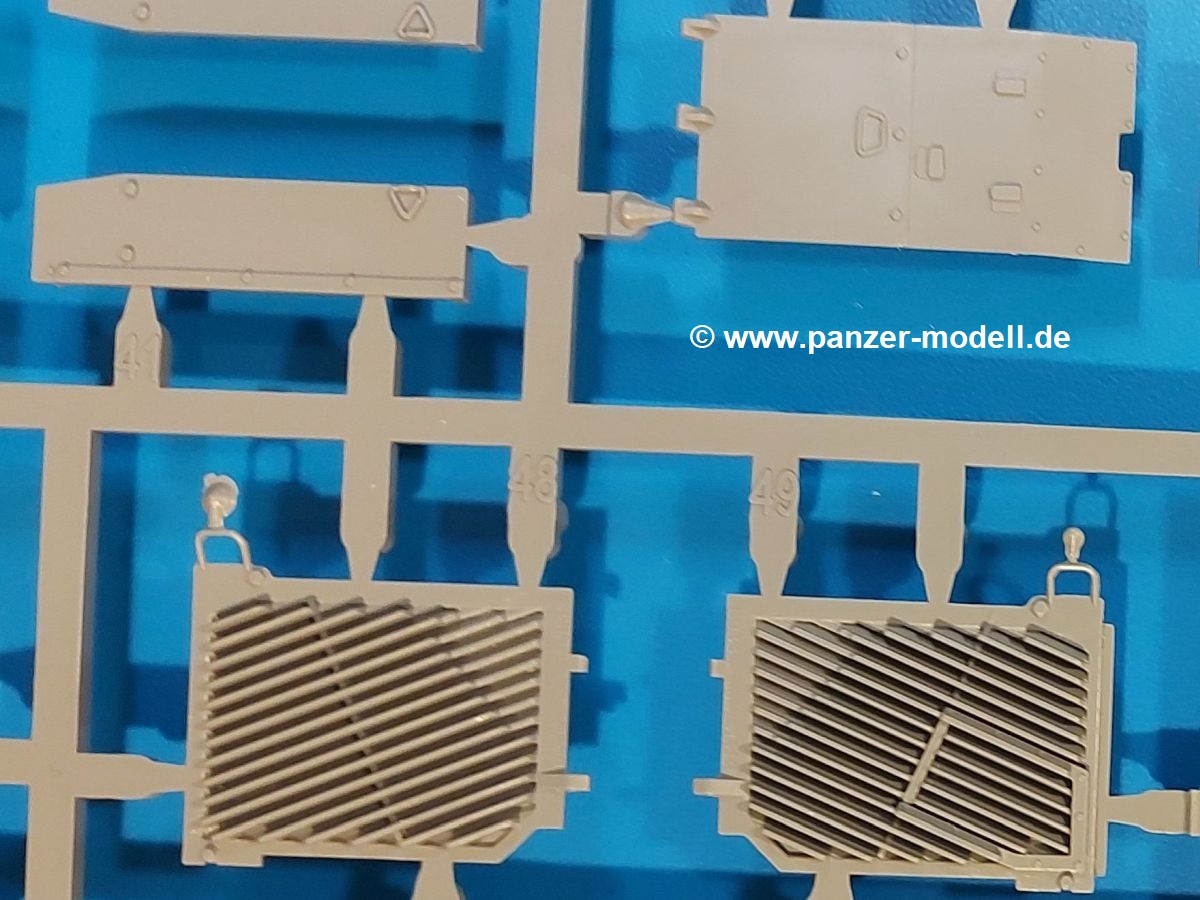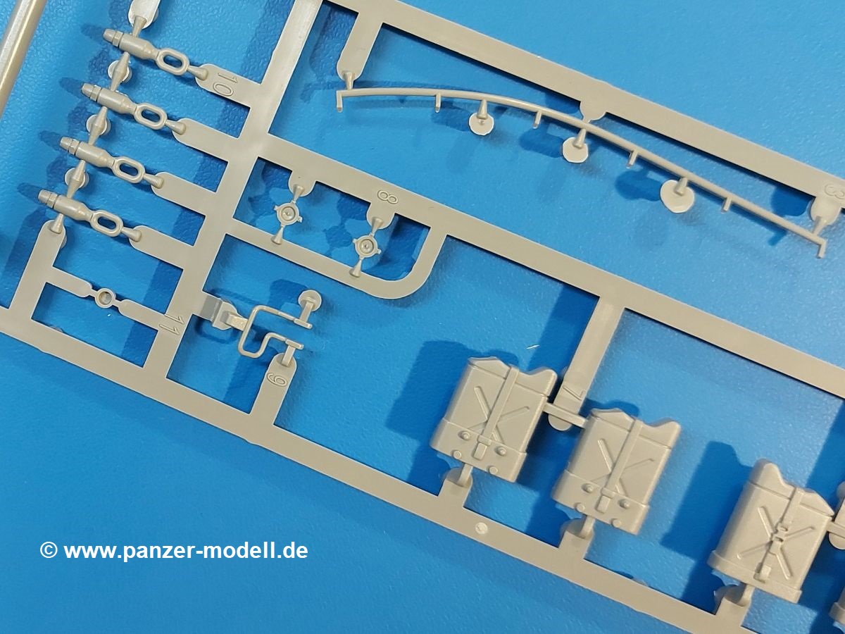 Das Original: Der M-60 ist ein Kampfpanzer aus der Zeit des kalten Krieges, der auch heute noch bei einigen Ländern im Einsatz steht. Er war der Nachfolger des M-48, was man bei der ersten Version noch deutlich an der Turmform sehen konnte. Ab der Version M-60 A1 bekam er einen größeren, neu konzipierten Turm. Er wiegt ab A1 fast 53 Tonnen und erreicht mit seinem 750 PS Motor eine Höchstgeschwindigkeit von 48 km/h auf der Straße und 32 km/h im Gelände. Seine Bewaffnung besteht aus einer 105 mm M68 Kanone, einem M240 MG und einem M85 MG. Zum Gefecht stehen der 4-köpfigen Besatzung 63 Schuss 105 mm, 6000 Schuss 7,62 mm und 900 Schuss 12,7 mm Munition zur Verfügung. Konzipiert um gegen sowjetische T-54 bestehen zu können, konnte er sich in der Operation Desert Storm auch gegen T-55 und T-72 behaupten. Im Laufe der Jahre erhielt er weitere Kampfwertsteigerungen, zuletzt als M-60 A3 TTS. Der Bausatz: Bereits vor 2 Jahren hatte TAKOM den M-60 A1 mit ERA herausgebracht. Danach war in Richtung M-60 erst einmal Ruhe. Nun liegt vor uns der ursprüngliche M-60 A1 Der Karton ist 380 x 250 x 85 mm groß und gut bepackt. Die Spritzlinge sind in größtenteils wieder verschließbaren Klarsichttütchen verpackt. Wir finden im Karton 11 hellgraue Spritzlinge, 2 Klarsichtspritzlinge, die Unterwanne, eine PE-Platine, 1 Draht, 2 Stahlstifte und 1 Decalbogen. Dazu kommt eine 20-seitige Bauanleitung. Die Unterwanne ist einteilig und weist bereits viele, feine, saubere Details wie Notausstiegsluke, Wartungsdeckel und für die Aufnahme der Laufwerkskomponenten auf. Hinzu kommen feine, aber deutliche Gussnummern. Auch die Gussstruktur ist gut wiedergegeben. Die Laufwerkskomponenten bestehen aus den Stoßdämpfern und Endanschlägen der Schwingarme. Diese setzen sich mehrteilig zusammen und werden dann fest und arretiert in die Aufnahmen in der Unterwanne eingeklebt. Die Laufrollen setzen sich aus den Radkörper und der Laufrollengummierung in Spritzguss zusammen, wobei der innere Teil der Doppellaufrolle einteilig ausgeführt ist. Der Detailgrad ist hier wirklich höchst erfreulich und scharf und durch die separate Gummierung für die Außenlaufrolle bekommt man perfekt die markante M60 Laufrolle mit der Hinterschneidung des Felgenrandes dargestellt. Die Oberwanne besteht aus einem Teil, das den Vorderrumpf (mit offen darstellbarer Fahrerluke und Aussparungen für die Winkelspiegel) und die Motorabdeckung mit den geriffelten Wartungsklappen umfasst. Die Kettenbleche werden mit gelochten Halterungen, vielen großen, aber fein detaillierten Staukästen versehen und später separat an die Wanne geklebt. Die markanten Hecktüren mit ihren Schrägriffelungen weisen eine gute Tiefe auf. Im Bausatz liegt auch noch die Hecktür zum Verbau des Teifwatauspuffs bei, ist aber nicht für diesen Bausatz vorgesehen. Der Turm besteht aus Unter- und Oberteil. Wie bereits an der Wanne konnten wir eine gute Gußstruktur und Gußnummern entdecken, die auch die Kommandantenkuppel auszeichnen. Die Kuppel lässt sich schwenkbar bauen, ebenso das 12,7 mm MG, wenn man sich für die Version ohne Allwetterplane entscheidet. Die Kommandanten- wie auch die Ladeschützenluke können offen oder geschlossen angebaut werden. Die Abschleppseile werden aus Kupferdraht und Seilkauschen aus Plastik hergestellt und in die Haltehaken aus PE jeweils vom Turmheck zu den Seiten geführt. Der Turmstaukorb besteht aus 7 Plastikteilen und 2 PE-Gittern. Während man das Bodengitter so verkleben kann, muss das zweite Gitter erst mittels einer im Bausatz enthaltenen Biegeform gebogen werden. Die 105mm M68 Kanone besteht aus einem einteiligen Rohr, leider ohne Züge und Felder an der Mündung, und wird mit dem 2-teiligen Rauchabsauger ergänzt. Da die Blende samt Plane ausgebildet ist, wird die Kanone nicht höhenrichtbar sein. Der große Schießscheinwerfer hat schöne Innendetails, die auch durch die große, kristallklare Scheibe gut zu sehen sein werden. Die Halterung des Scheinwerfers hat mit 10 Teilen doppelt so viele Teile wie der Scheinwerfer selbst. Die Decals sind seidenmatt glänzend und scharf gedruckt. Damit lassen sich 5 Fahrzeuge darstellen: