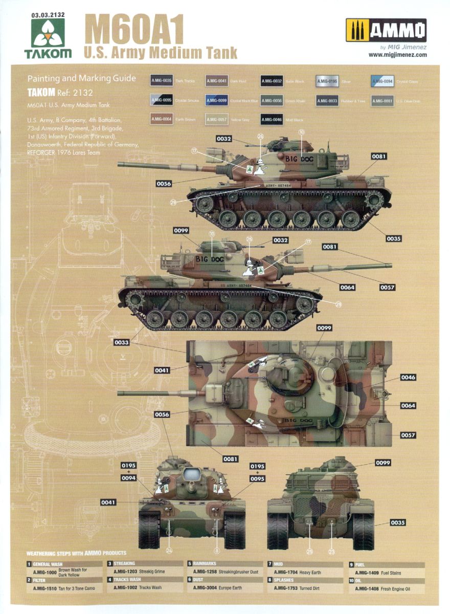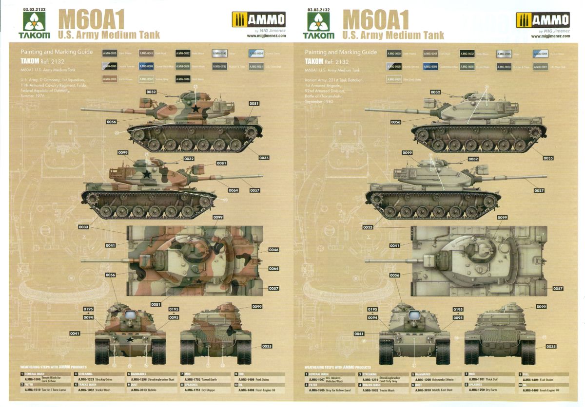 Die 20-seitige Bauanleitung erzählt uns in Englisch auf dem Deckblatt etwas zum Original und beginnt dann mit Warn- und Bearbeitungshinweisen, gefolgt von einer Spritzlingübersicht. Von einigen Unterbaugruppen begleitet führt die Bauanleitung in 22 Schritten zum fertigen Modell. Auf 2 1/2 Seiten erhalten wir die Markierungs- und Bemalungsvorschläge für die vorgenannten 5 Fahrzeuge an. Farbangaben werden ausschließlich für Ammo by MIG Jimenez Farben gemacht. Takoms M-60 A1 braucht sich vor der Konkurenz nicht verstecken. Bei einer moderaten Teilezahl, übersichtlichen PE-Teilen und annehmbarem Preis wird auch ein fortgeschrittener Anfänger sich daran versuchen können.