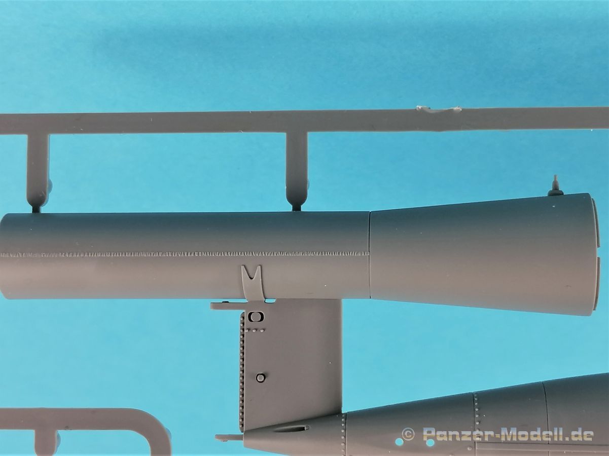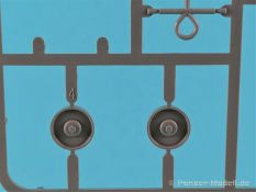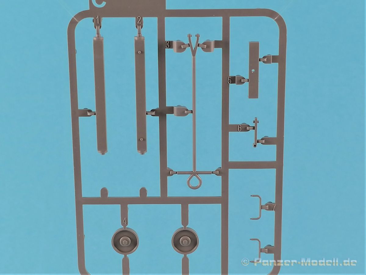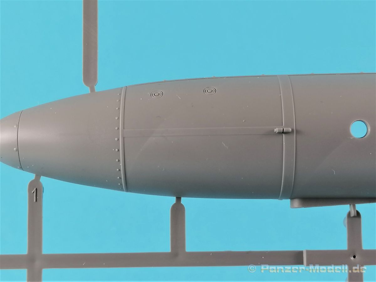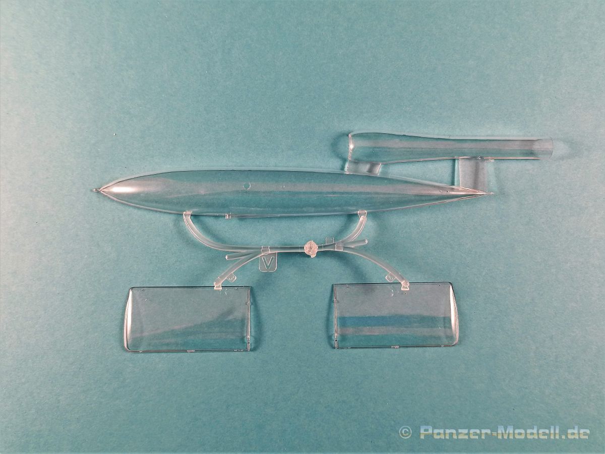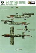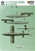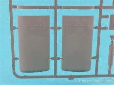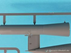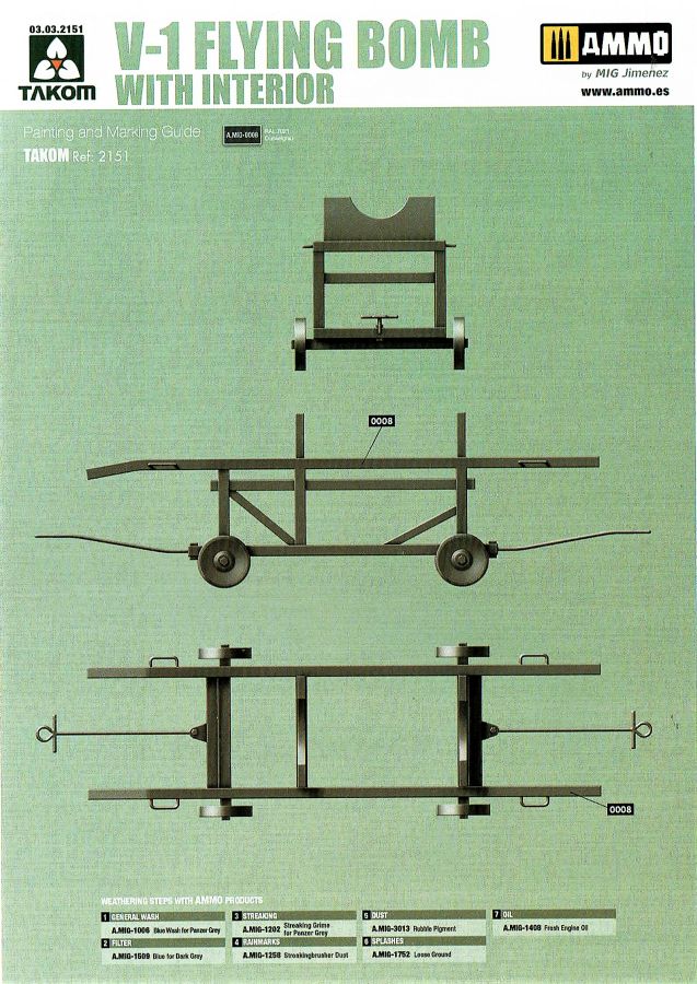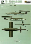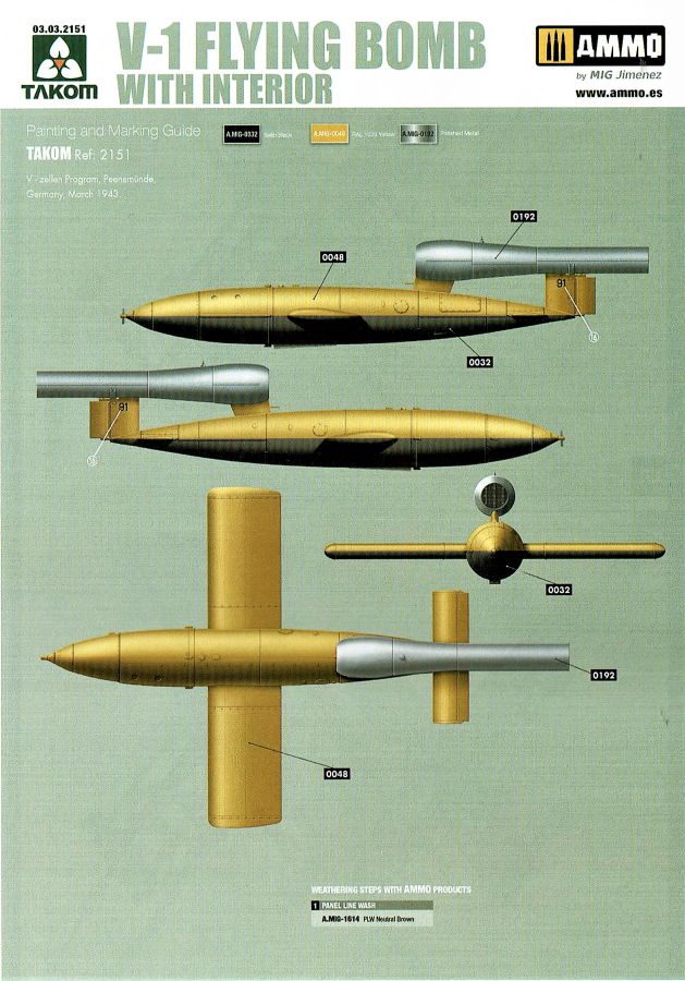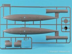 Die V-1 (Vergeltungswaffe!) oder Fiseler Fi 103 war eine der sogenannten “Wunderwaffen” des III. Reiches und der erste eingesetzte Marschflugkörper. Die V-1, auch Flügelbombe war im Frühjahr 1944 einsatzbereit. Von Juni 44 bis März 45 wurde die V1 haupsächlich auf Ziele in London und Belgien eingesetzt. Doch jetzt zum Bausatz. Der 30 x 20 x 6cm große Karton gibt den Blick frei auf acht hellgraue Spritzlinge und einen weiteren aus Klarmaterial. Dazu kommt eine kleine Pe-Platine, ein Blatt mit Decals und die übliche Bauanleitung. Die Rahmen D (2x), E, F und G beinhalten die Bauteile für die V-1, während die Rahmen B und C (2x) den Transportwagen enthalten. Mit V ist der Spritzling der Klarteile gekennzeichnet. Die Gußqualität der Teile ist absolut auf der Höhe der Zeit. Alles ist sehr sauber gespritzt und frei von Sinkstellen, Versatz oder Fischhäuten. Auswerferspuren sind so gut wie keine vorhanden und wenn, dann in nicht einsehbaren Bereichen. Auch Trennnähte finden sich keine. Die Bauteile weisen den für Takom sehr hohen Fertigungsgrad auf. Die Detaillierung ist absolut scharf und überzeugt. Details sind sehr gut reproduziert. Es liegt in der Natur der Sache daß das Modell mit einer überschaubaren Teileanzahl gebaut werden kann. Vorhanden sind neben dem eigentlichen Rumpf mit Triebwerksgondel, den Tragflächen auch alle Komponenten des “Innenlebens”. Alle Aggregate, Schotts und Spanten sind absolut gut ausgeformt. Die relativ geringe Anzahl der Teile schlägt sich auch in der Bauanleitung mit nur 13 Seiten nieder. Nach den üblichen Hinweisen auf Seite eins sind auf der folgendene Seite wie üblich die Bauteile gelistet. Lediglich acht Bauabschnitte sind abzuarbeiten. Davon entfallen drei Abschnitte auf den Bau des Transportwagens. Die Zeichnungen sind im üblichen Stil von Takom gehalten nicht mit Teilen überfrachtet, aber leider manchmal etwas klein. Dei dem Bau der V-1 hat der Modellbauer jetzt die Wahl. Entweder erfolgt der Bau in der konventionellen Weise oder die Klarteile kommen hier zum Einsatz. Diese bestehen aus der linken Rumpfhälfte mit dem Triebwerk und den beiden Oberseiten der Tragflächen. Damit weicht das Modell im Gesamtbild auch sehr von dem Deckelbild ab. Paneellinien und Details sind keine vorhanden. Der ausgezeichnet gedruckte Decalbogen enthält haupsächlich verschiedenen Wartungshinweise. Vier verschiedene Bemalungsvorschläge der Oberflächen einer V-1 gibt es im Anhang. Dazu noch einen weiterer für den Transportwagen. (s.a. Bildteil). Unter jedem Bild auch wieder Hinweise zur Alterung. Die vorgeschlagenen Farben stammen ausnahmslos vom AMIG. Eigentlich ein sehr schöner Kit, jedoch auch mit Schwächen. Vermisst habe ich jegliche Farbangaben zur Gestaltung des Innenlebens. Recherche ist hier unbedingt angesagt wenn man die V-1 als Schnittmodell bauen möchte. Warscheinlich dürften RLM 02 und RLM 66 im Anstrich überwiegen. Auf jeden Fall ein Kit der manchem Dioramenbauer schon vom Maßstab in 1:35 her Freude bereiten dürfte.