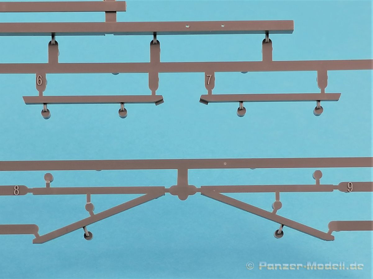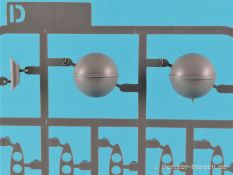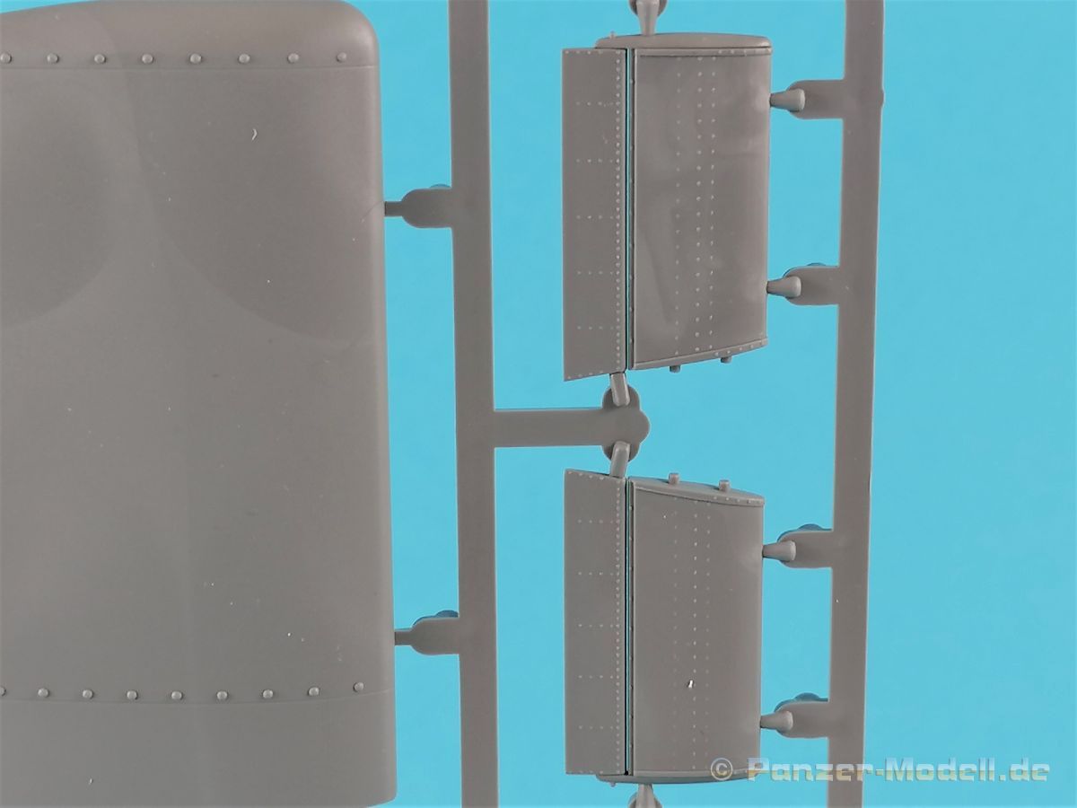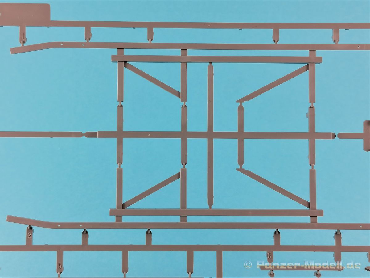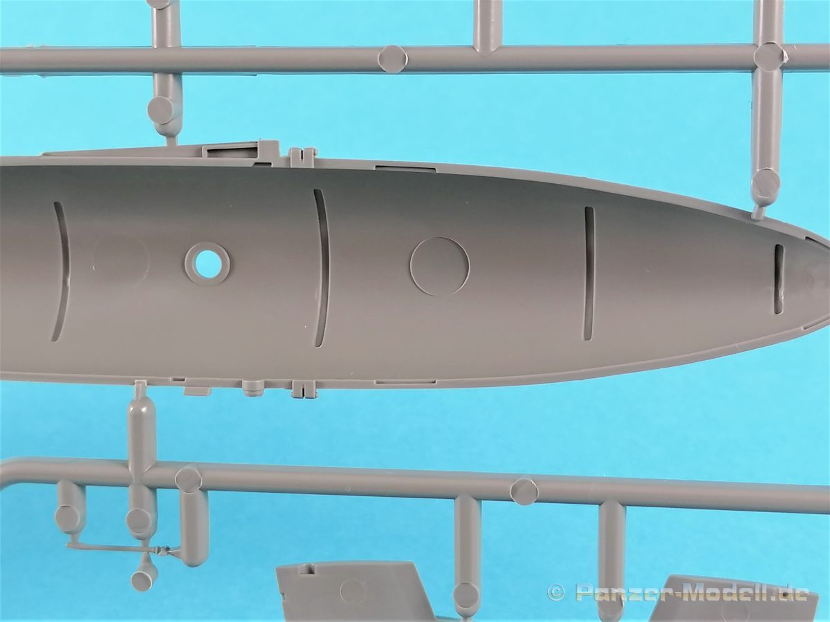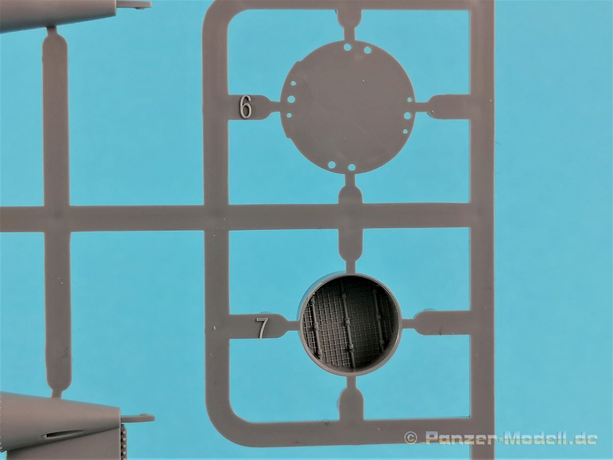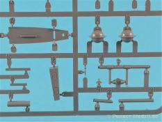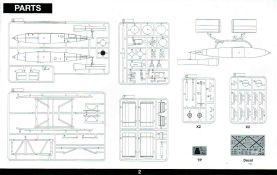 Die V-1 (Vergeltungswaffe!) oder Fiseler Fi 103 war eine der sogenannten “Wunderwaffen” des III. Reiches und der erste eingesetzte Marschflugkörper. Die V-1, auch Flügelbombe war im Frühjahr 1944 einsatzbereit. Von Juni 44 bis März 45 wurde die V1 haupsächlich auf Ziele in London und Belgien eingesetzt. Doch jetzt zum Bausatz. Der 30 x 20 x 6cm große Karton gibt den Blick frei auf acht hellgraue Spritzlinge und einen weiteren aus Klarmaterial. Dazu kommt eine kleine Pe-Platine, ein Blatt mit Decals und die übliche Bauanleitung. Die Rahmen D (2x), E, F und G beinhalten die Bauteile für die V-1, während die Rahmen B und C (2x) den Transportwagen enthalten. Mit V ist der Spritzling der Klarteile gekennzeichnet. Die Gußqualität der Teile ist absolut auf der Höhe der Zeit. Alles ist sehr sauber gespritzt und frei von Sinkstellen, Versatz oder Fischhäuten. Auswerferspuren sind so gut wie keine vorhanden und wenn, dann in nicht einsehbaren Bereichen. Auch Trennnähte finden sich keine. Die Bauteile weisen den für Takom sehr hohen Fertigungsgrad auf. Die Detaillierung ist absolut scharf und überzeugt. Details sind sehr gut reproduziert. Es liegt in der Natur der Sache daß das Modell mit einer überschaubaren Teileanzahl gebaut werden kann. Vorhanden sind neben dem eigentlichen Rumpf mit Triebwerksgondel, den Tragflächen auch alle Komponenten des “Innenlebens”. Alle Aggregate, Schotts und Spanten sind absolut gut ausgeformt. Die relativ geringe Anzahl der Teile schlägt sich auch in der Bauanleitung mit nur 13 Seiten nieder. Nach den üblichen Hinweisen auf Seite eins sind auf der folgendene Seite wie üblich die Bauteile gelistet. Lediglich acht Bauabschnitte sind abzuarbeiten. Davon entfallen drei Abschnitte auf den Bau des Transportwagens. Die Zeichnungen sind im üblichen Stil von Takom gehalten nicht mit Teilen überfrachtet, aber leider manchmal etwas klein. Dei dem Bau der V-1 hat der Modellbauer jetzt die Wahl. Entweder erfolgt der Bau in der konventionellen Weise oder die Klarteile kommen hier zum Einsatz. Diese bestehen aus der linken Rumpfhälfte mit dem Triebwerk und den beiden Oberseiten der Tragflächen. Damit weicht das Modell im Gesamtbild auch sehr von dem Deckelbild ab. Paneellinien und Details sind keine vorhanden. Der ausgezeichnet gedruckte Decalbogen enthält haupsächlich verschiedenen Wartungshinweise. Vier verschiedene Bemalungsvorschläge der Oberflächen einer V-1 gibt es im Anhang. Dazu noch einen weiterer für den Transportwagen. (s.a. Bildteil). Unter jedem Bild auch wieder Hinweise zur Alterung. Die vorgeschlagenen Farben stammen ausnahmslos vom AMIG. Eigentlich ein sehr schöner Kit, jedoch auch mit Schwächen. Vermisst habe ich jegliche Farbangaben zur Gestaltung des Innenlebens. Recherche ist hier unbedingt angesagt wenn man die V-1 als Schnittmodell bauen möchte. Warscheinlich dürften RLM 02 und RLM 66 im Anstrich überwiegen. Auf jeden Fall ein Kit der manchem Dioramenbauer schon vom Maßstab in 1:35 her Freude bereiten dürfte.