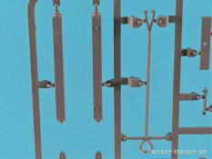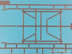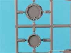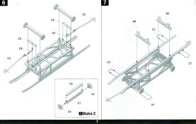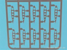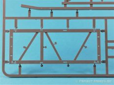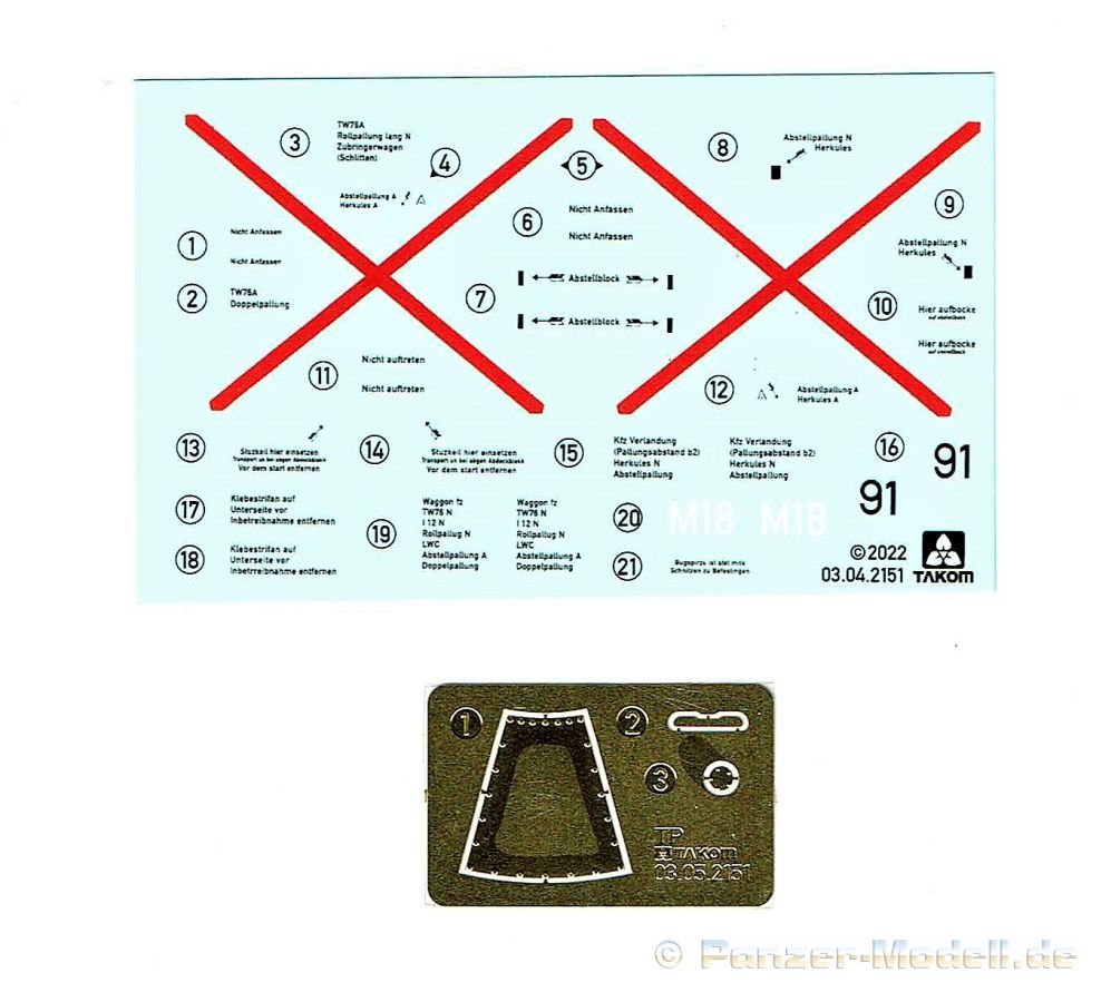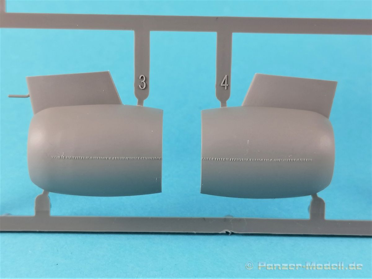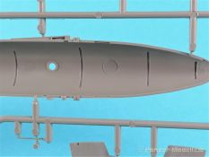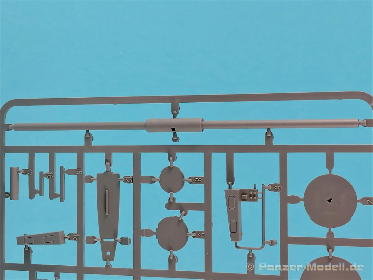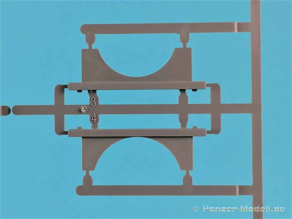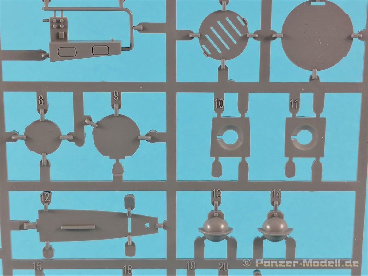 Die V-1 (Vergeltungswaffe!) oder Fiseler Fi 103 war eine der sogenannten “Wunderwaffen” des III. Reiches und der erste eingesetzte Marschflugkörper. Die V-1, auch Flügelbombe war im Frühjahr 1944 einsatzbereit. Von Juni 44 bis März 45 wurde die V1 haupsächlich auf Ziele in London und Belgien eingesetzt. Doch jetzt zum Bausatz. Der 30 x 20 x 6cm große Karton gibt den Blick frei auf acht hellgraue Spritzlinge und einen weiteren aus Klarmaterial. Dazu kommt eine kleine Pe-Platine, ein Blatt mit Decals und die übliche Bauanleitung. Die Rahmen D (2x), E, F und G beinhalten die Bauteile für die V-1, während die Rahmen B und C (2x) den Transportwagen enthalten. Mit V ist der Spritzling der Klarteile gekennzeichnet. Die Gußqualität der Teile ist absolut auf der Höhe der Zeit. Alles ist sehr sauber gespritzt und frei von Sinkstellen, Versatz oder Fischhäuten. Auswerferspuren sind so gut wie keine vorhanden und wenn, dann in nicht einsehbaren Bereichen. Auch Trennnähte finden sich keine. Die Bauteile weisen den für Takom sehr hohen Fertigungsgrad auf. Die Detaillierung ist absolut scharf und überzeugt. Details sind sehr gut reproduziert. Es liegt in der Natur der Sache daß das Modell mit einer überschaubaren Teileanzahl gebaut werden kann. Vorhanden sind neben dem eigentlichen Rumpf mit Triebwerksgondel, den Tragflächen auch alle Komponenten des “Innenlebens”. Alle Aggregate, Schotts und Spanten sind absolut gut ausgeformt. Die relativ geringe Anzahl der Teile schlägt sich auch in der Bauanleitung mit nur 13 Seiten nieder. Nach den üblichen Hinweisen auf Seite eins sind auf der folgendene Seite wie üblich die Bauteile gelistet. Lediglich acht Bauabschnitte sind abzuarbeiten. Davon entfallen drei Abschnitte auf den Bau des Transportwagens. Die Zeichnungen sind im üblichen Stil von Takom gehalten nicht mit Teilen überfrachtet, aber leider manchmal etwas klein. Dei dem Bau der V-1 hat der Modellbauer jetzt die Wahl. Entweder erfolgt der Bau in der konventionellen Weise oder die Klarteile kommen hier zum Einsatz. Diese bestehen aus der linken Rumpfhälfte mit dem Triebwerk und den beiden Oberseiten der Tragflächen. Damit weicht das Modell im Gesamtbild auch sehr von dem Deckelbild ab. Paneellinien und Details sind keine vorhanden. Der ausgezeichnet gedruckte Decalbogen enthält haupsächlich verschiedenen Wartungshinweise. Vier verschiedene Bemalungsvorschläge der Oberflächen einer V-1 gibt es im Anhang. Dazu noch einen weiterer für den Transportwagen. (s.a. Bildteil). Unter jedem Bild auch wieder Hinweise zur Alterung. Die vorgeschlagenen Farben stammen ausnahmslos vom AMIG. Eigentlich ein sehr schöner Kit, jedoch auch mit Schwächen. Vermisst habe ich jegliche Farbangaben zur Gestaltung des Innenlebens. Recherche ist hier unbedingt angesagt wenn man die V-1 als Schnittmodell bauen möchte. Warscheinlich dürften RLM 02 und RLM 66 im Anstrich überwiegen. Auf jeden Fall ein Kit der manchem Dioramenbauer schon vom Maßstab in 1:35 her Freude bereiten dürfte.
