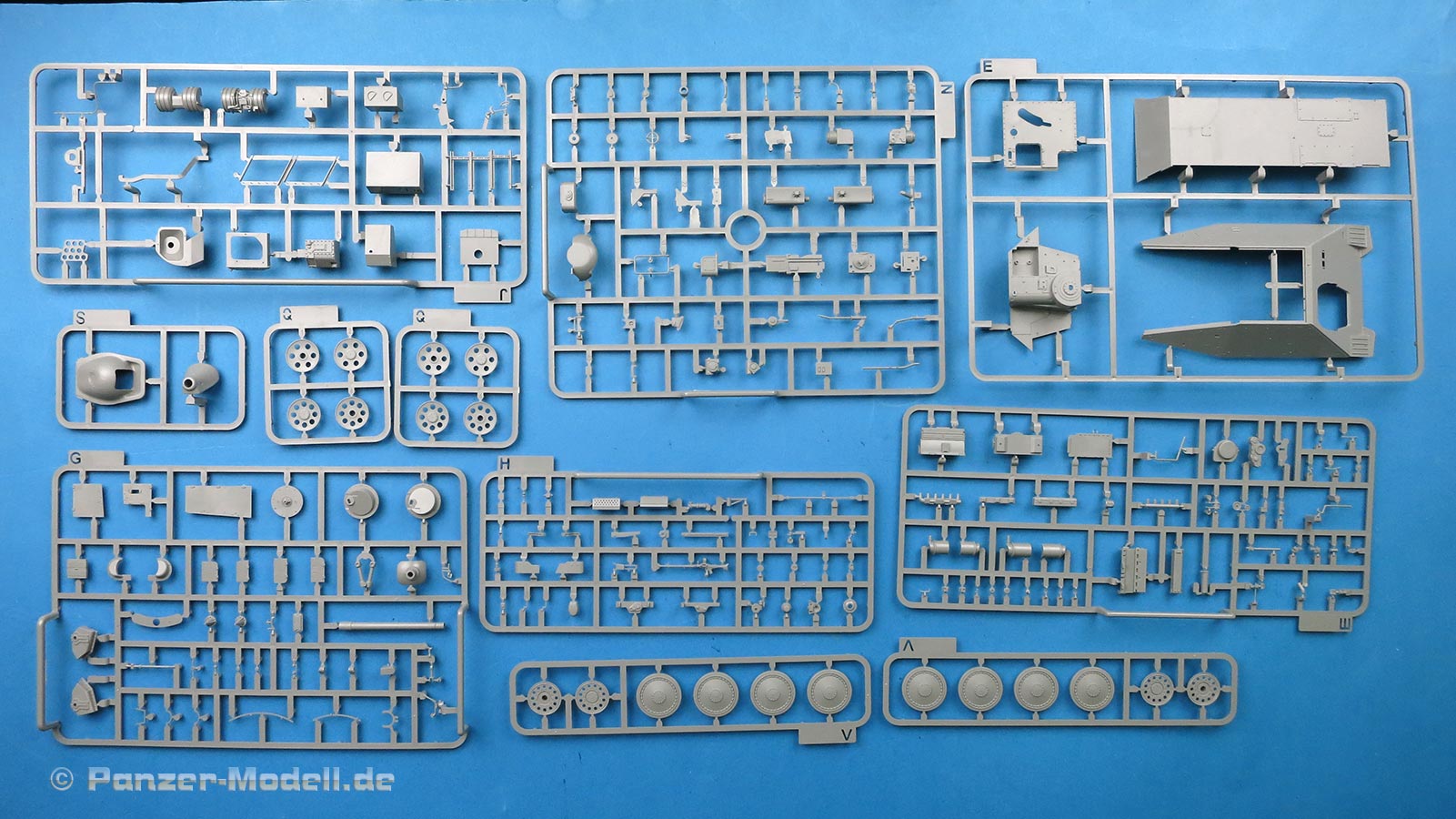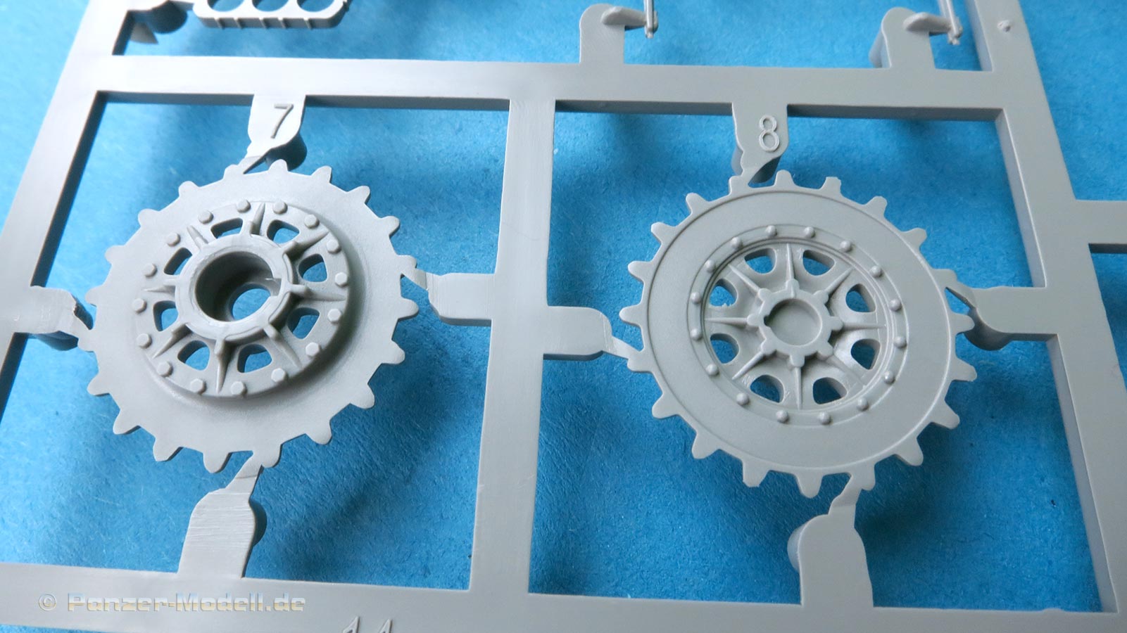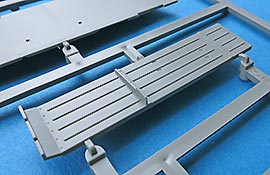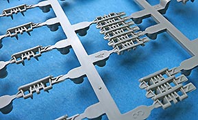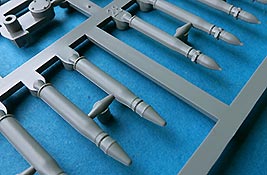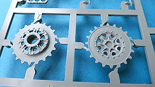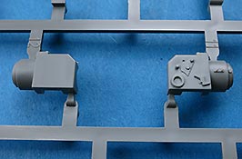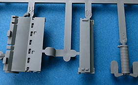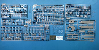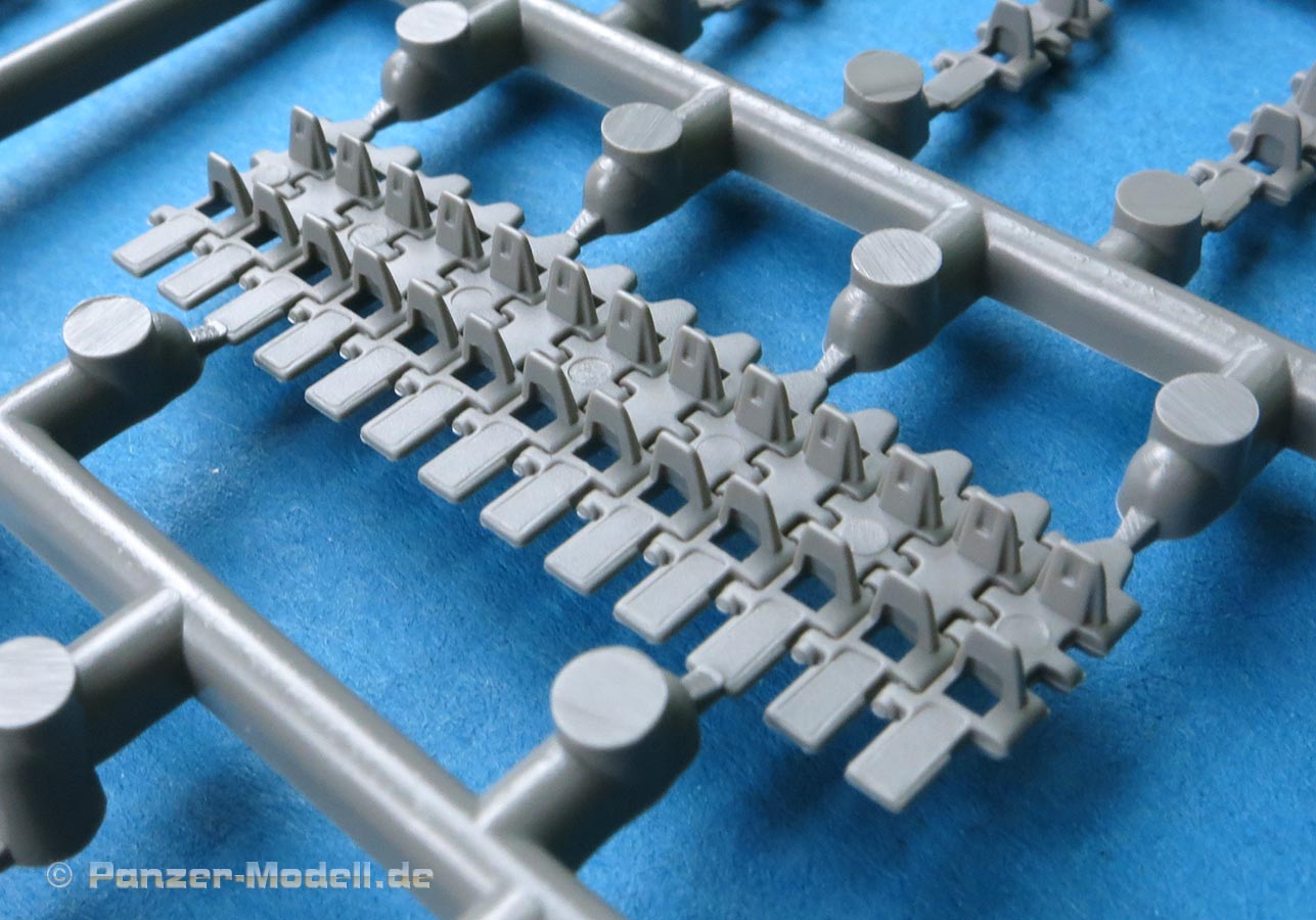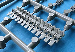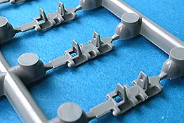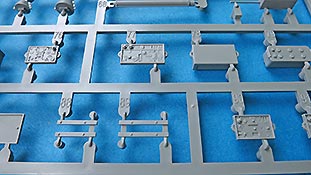 Die Teile sind sauber ausgespritzt, mit scharfen Details, ohne Versatz und Verzug. Angüsse sind so angebracht, dass ein Abtrennen der Teile einfach und ohne große Nacharbeit vonstattengehen sollte. Auswerfer sind oft nur flach und meist auf die Angüsse gesetzt oder auf Innenseiten von Teilen, die nach dem Bau kaum mehr einsehbar sind.
