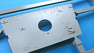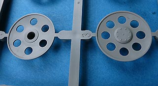 Das Laufwerk baut sich aus den Kurbelarmen und Blattfedern zusammen und wird verklebt. Die Laufrollen sind die für die frühe Version korrekten mit 32 Radmuttern am Außenring.