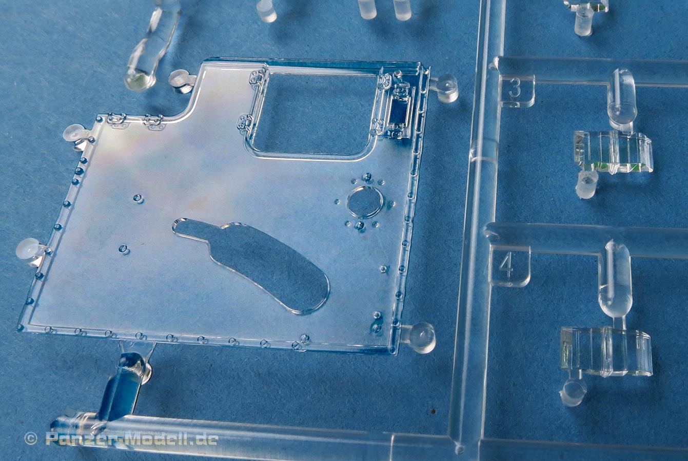 Wer jetzt wieder stöhnt, dass man ja später nichts mehr von all dem sehen kann, dem sei vermeldet, dass zum einen eine wunderschöne, klare Deckplatte für den Kampfraum beiliegt - diese kann man also nun entweder so belassen und hat dadurch einen Einblick in das Innenleben, oder man lackiert diese ganz normal (oder nimmt das Kampfraumdach in grauem Plastik) und belässt es beim Einblick durch die Luken.