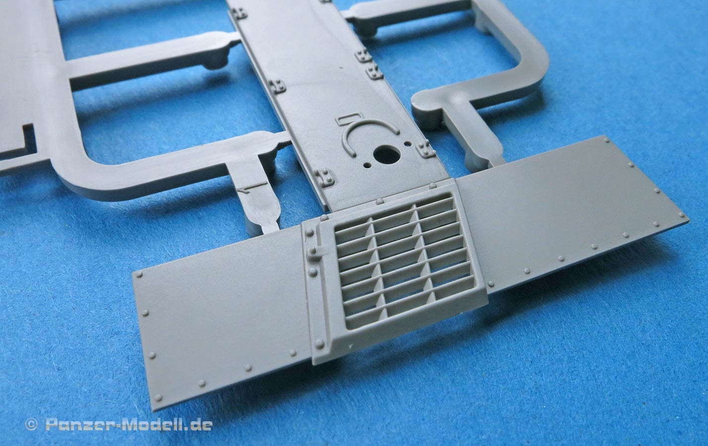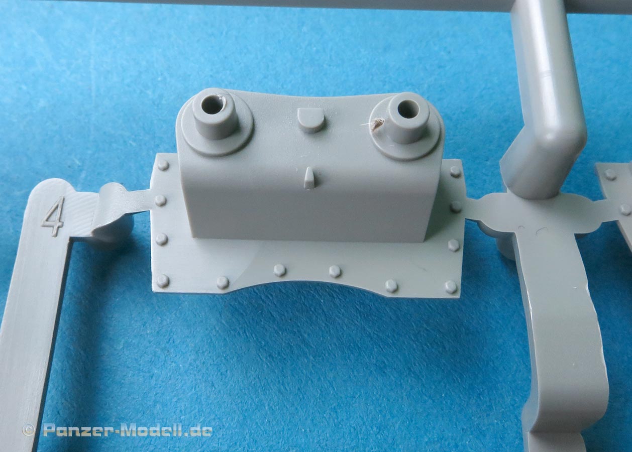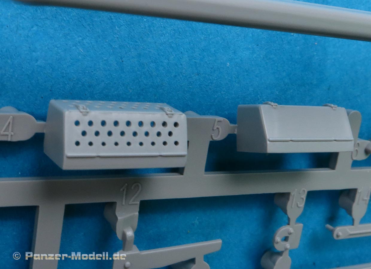 Die Ausrüstung auf den Kettenblechen ist schön gespritzt und die Ausrüstungskiste in der für die frühe Version korrekten gelochten Version.
