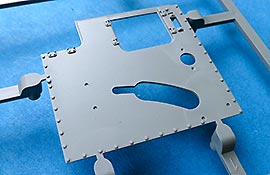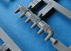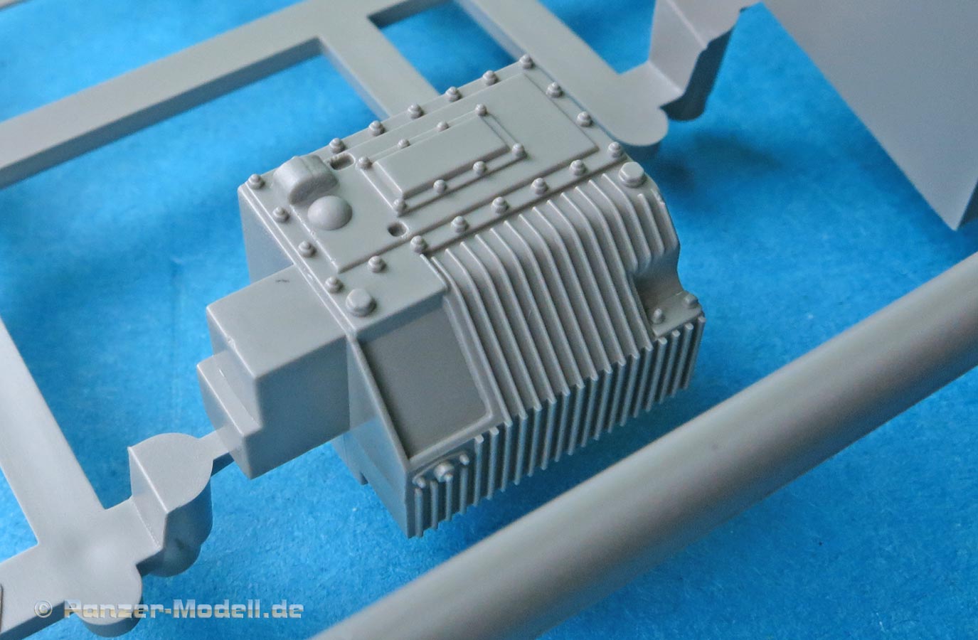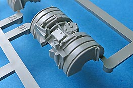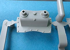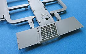 Der Mittelteil der Motorabdeckung wird fest montiert. Am unteren Ende ist eine Lamellenöffnung für die Motorkühlung. Die Lamellen werden mit einem Fotoätzteilgitter abgedeckt. Der Auspuff ist die für die frühe Ausführung korrekte Version mit Abgasrohr das in einen Endschalldämpfer führt, der sich aus zwei Halbteilen zusammensetzt und mit einem Hitzeschutzgitter aus PE Blech.