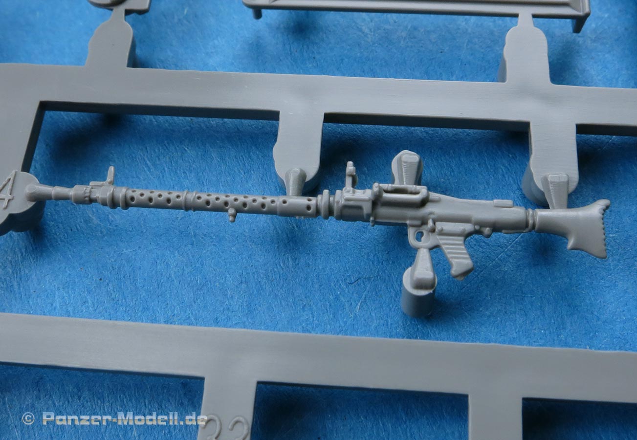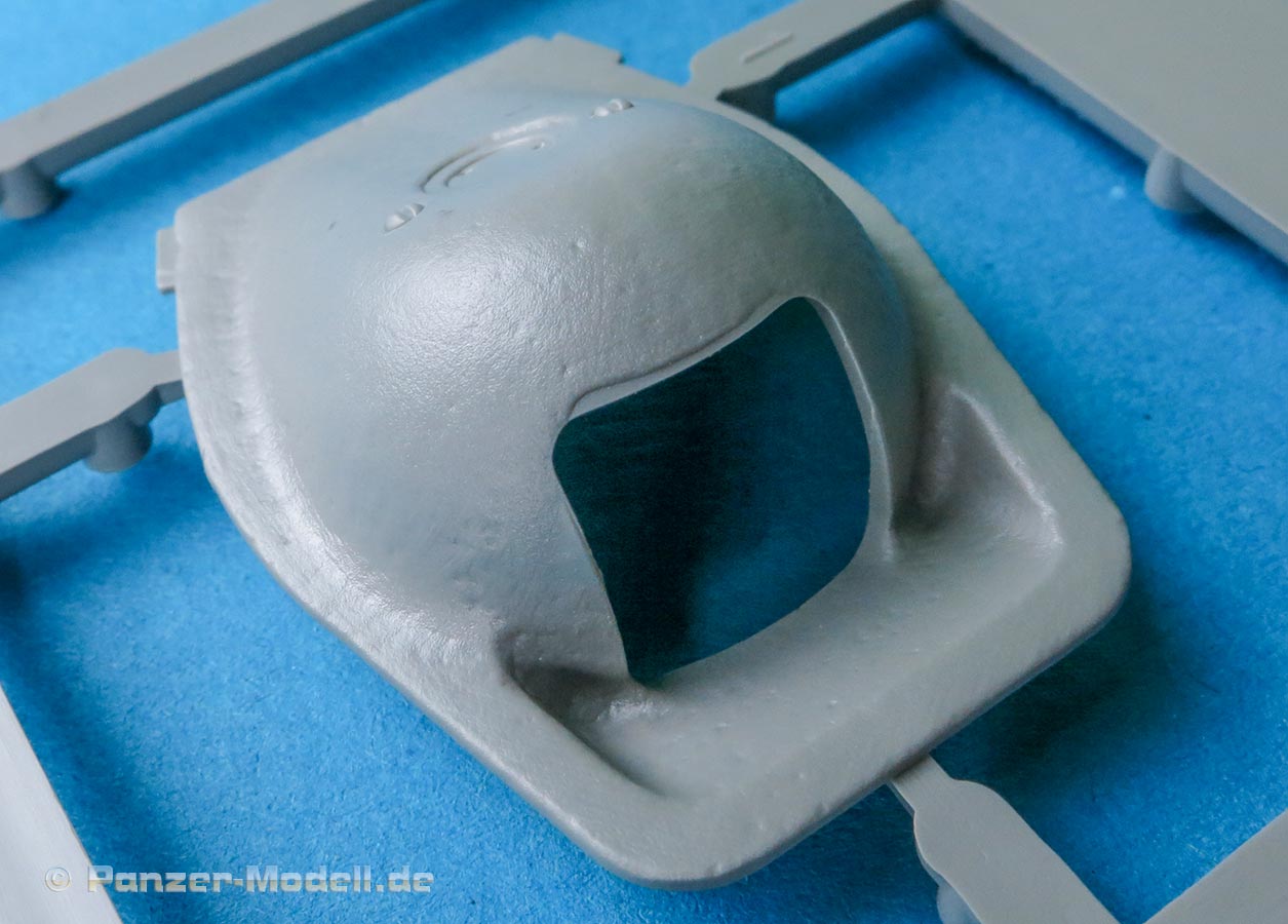 Das Aufbaudach ist wie zuvor bereits angesprochen einmal in normalem und einem in klarem Kunststoff enthalten. Das von innen bedienbare MG34 mit Trommelmagazin ist gut detailliert mit Kühllöchern am Lauf, geriffelter Schulterstütze, Abzugsbügel. Das Trommelmagazin hat den Tragegriff angegossen. Bei vorsichtigem Umgang mit Klebstoff sollte man die MG-Halterung so anbringen können, dass sie beweglich bleibt.