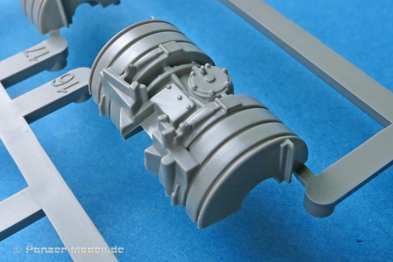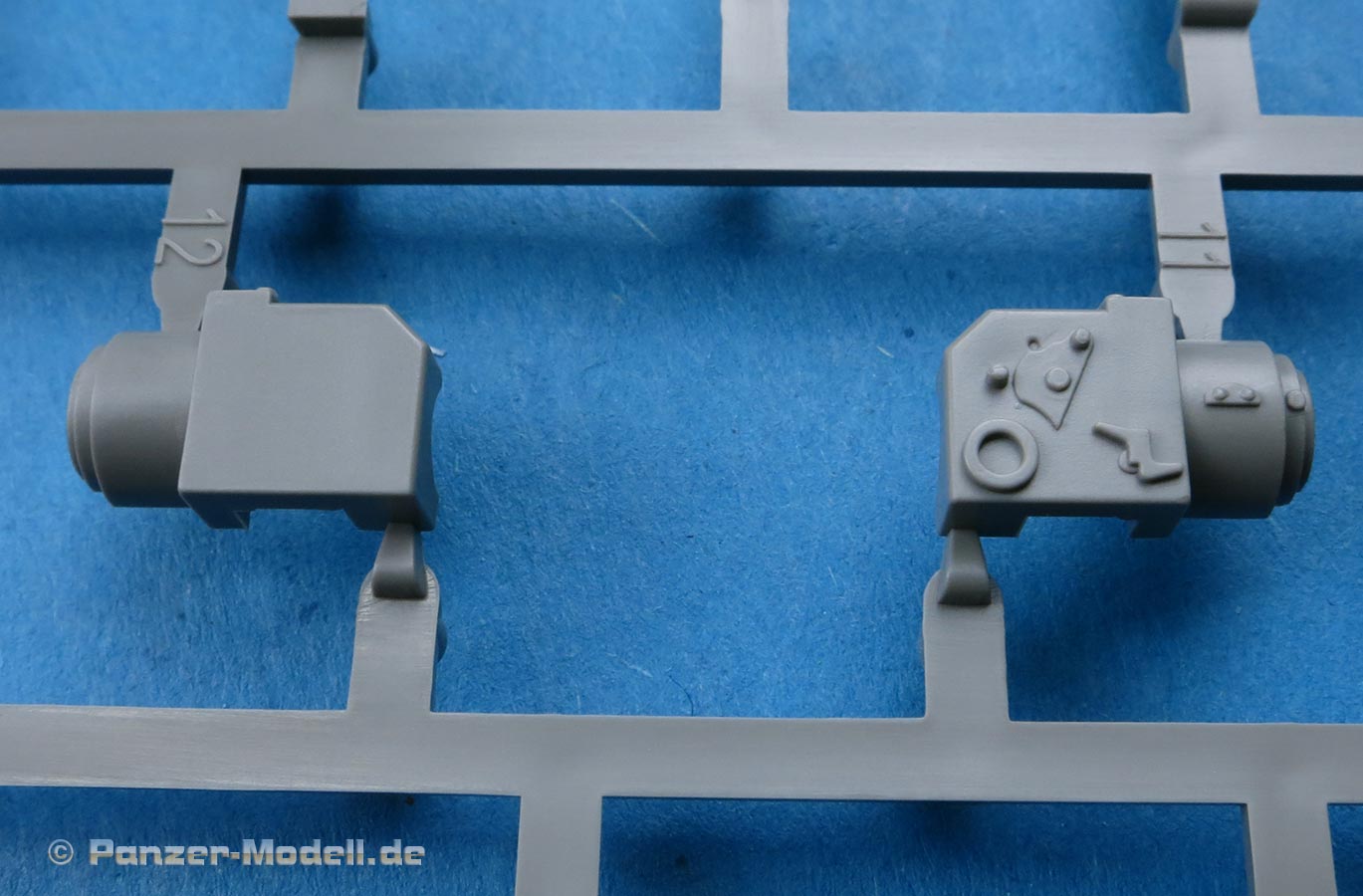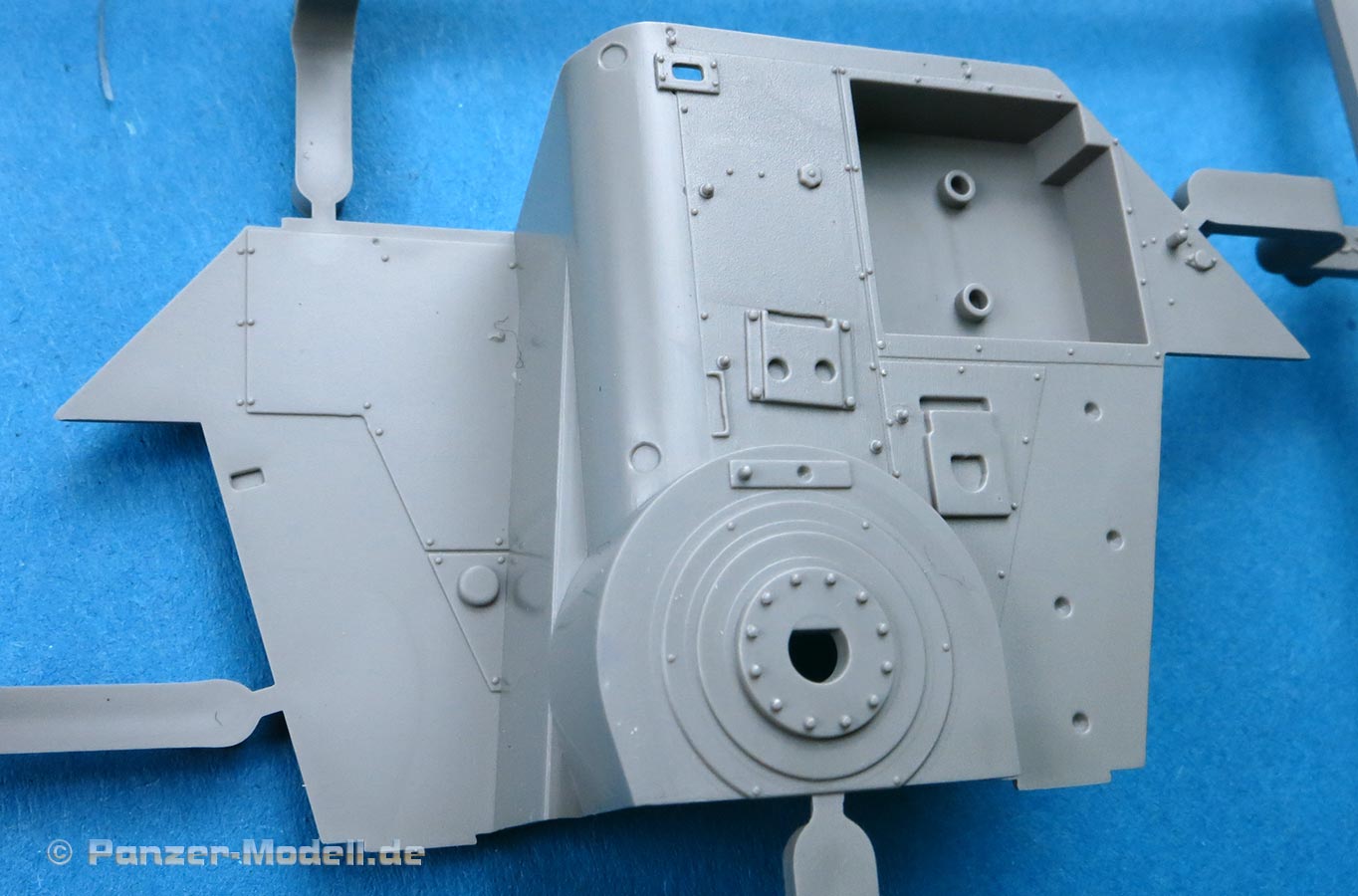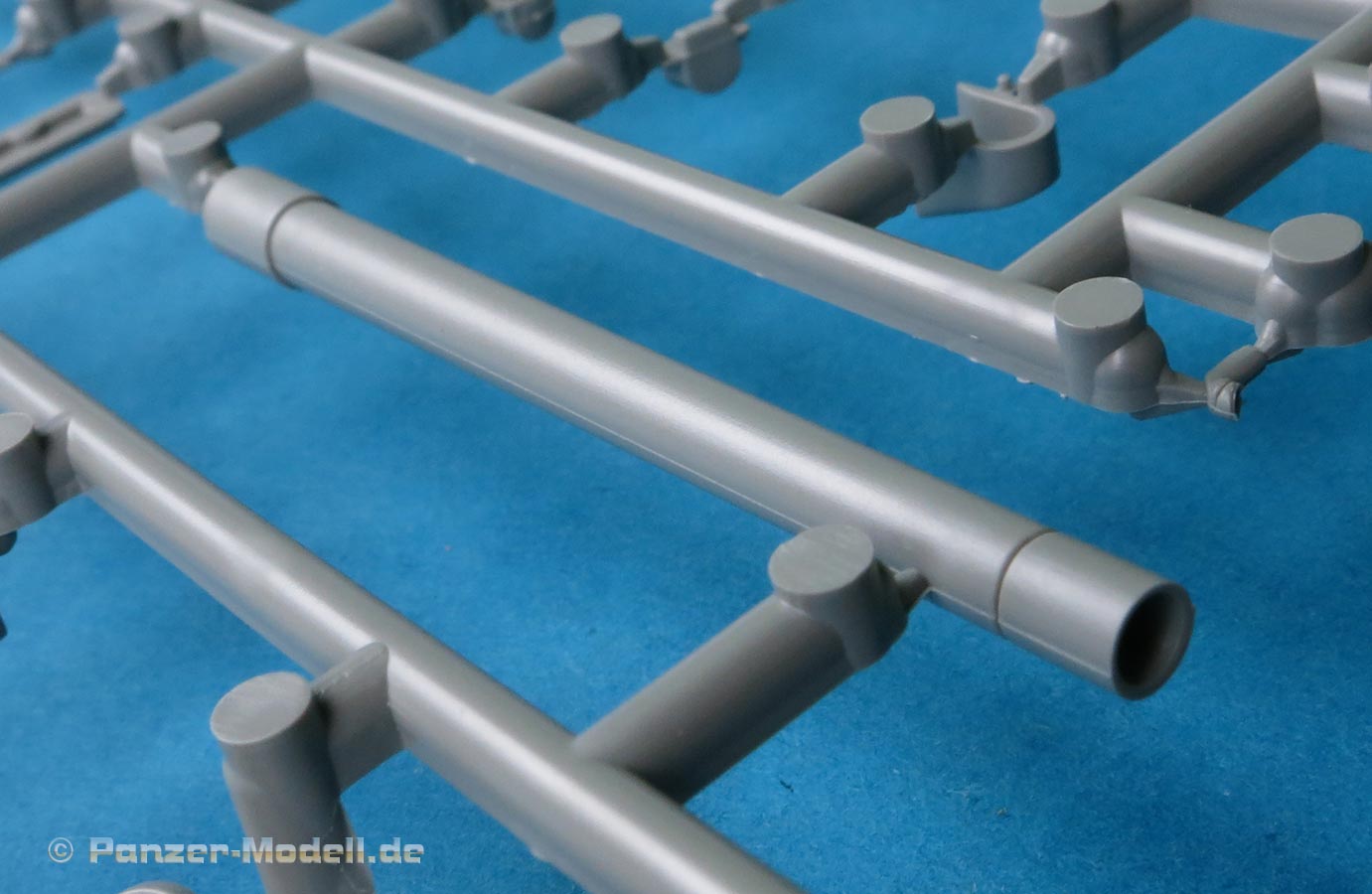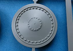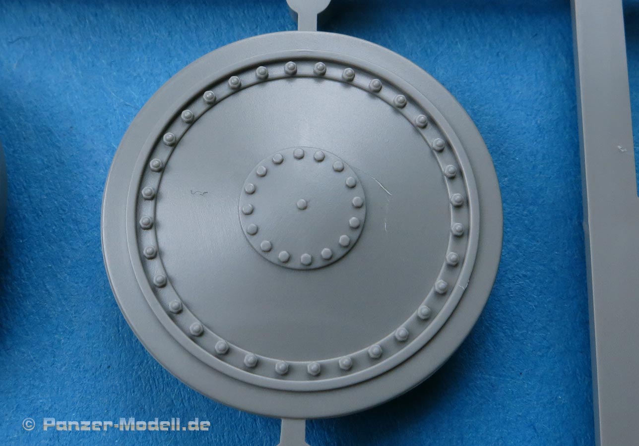 Man hat die Wahl zwischen einem einteiligen, an der Mündung offen Plastikrohr und dem beiliegenden Metallrohr für die 7,5cm Kanone. Das Plastikrohr ist sauber gespritzt mit nur einer leichten Naht, die sich leicht versäubern lässt. Das Metallrohr ist sauber gedreht mit offener Mündung. Die Topfblende weist eine schöne und realistische Gussstruktur auf.