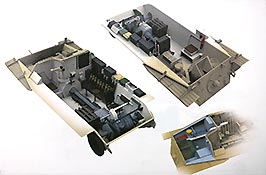 Die Inneneinrichtung ist nach meinem Dafürhalten komplett und sehr schön und fein detailliert gespritzt. Hier scheint es an nichts zu fehlen. Getriebe, Vorgelegeachsen, Lenkmechanismus, Fahrerplatz, Kardanwelle, Munitionshalterungen mit Munition, Funkgeräte und nicht zu vergessen - es ist auch der komplette Praga Motor mit recht vielen Teilen und schönen Details enthalten. Die Munition ist teilweise bereits mit Halterungen angespritzt und es finden sich zwei Sorten Granaten dabei.