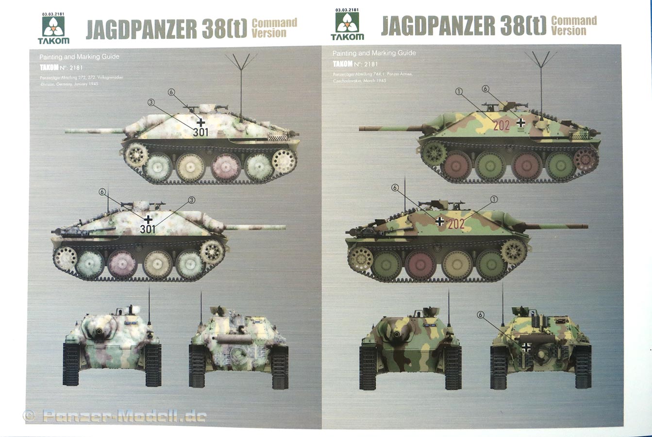 Am Ende der Anleitung sind einige Farb-CAD eingedruckt zur farblichen Gestaltung des Innenraums und 4 Farbprofile zur Bemalung und Markierung. Interessanterweise hat Takom hier keine Farbreferenzen angegeben zu einem spezifischen Farbhersteller - hier muss der Modellbauer anhand der gedruckten Farben sich selber aus dem eigenen Fundus die richtigen Farben heraussuchen ... etwas eigenwillig. Die Bemalungsvarianten sind für folgende Einheiten: