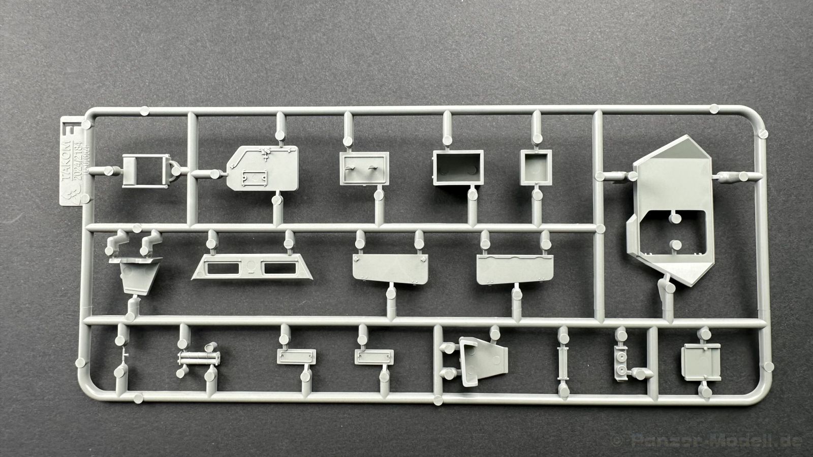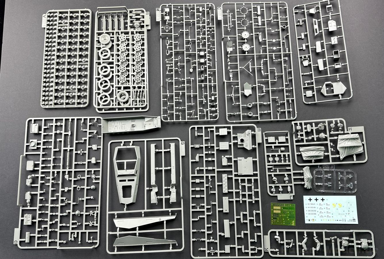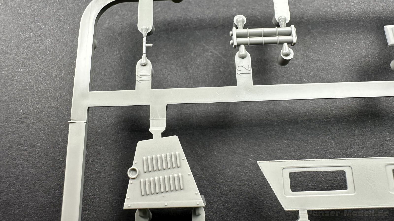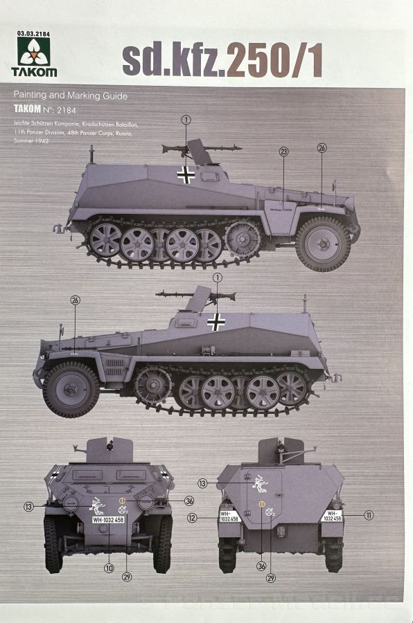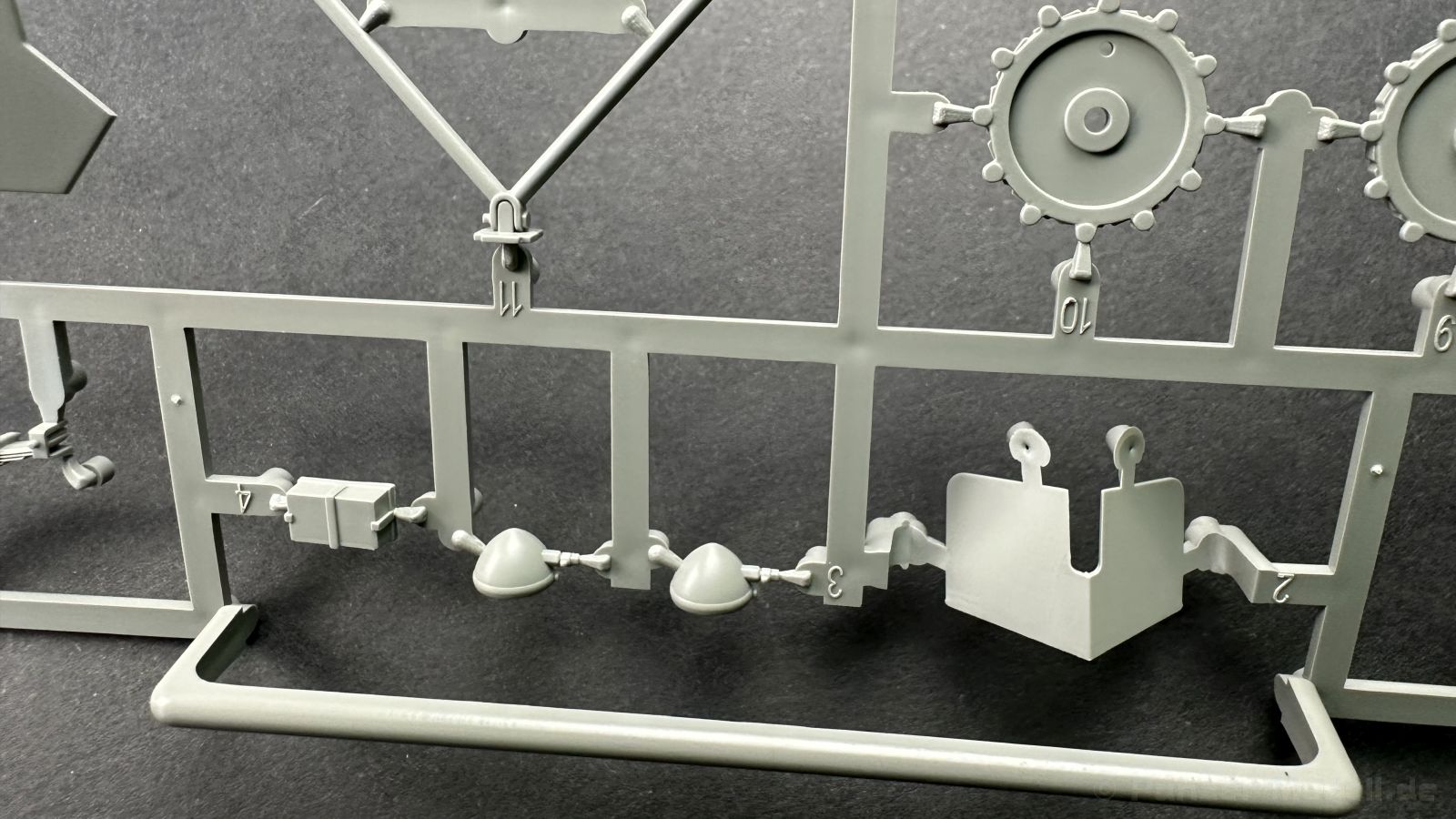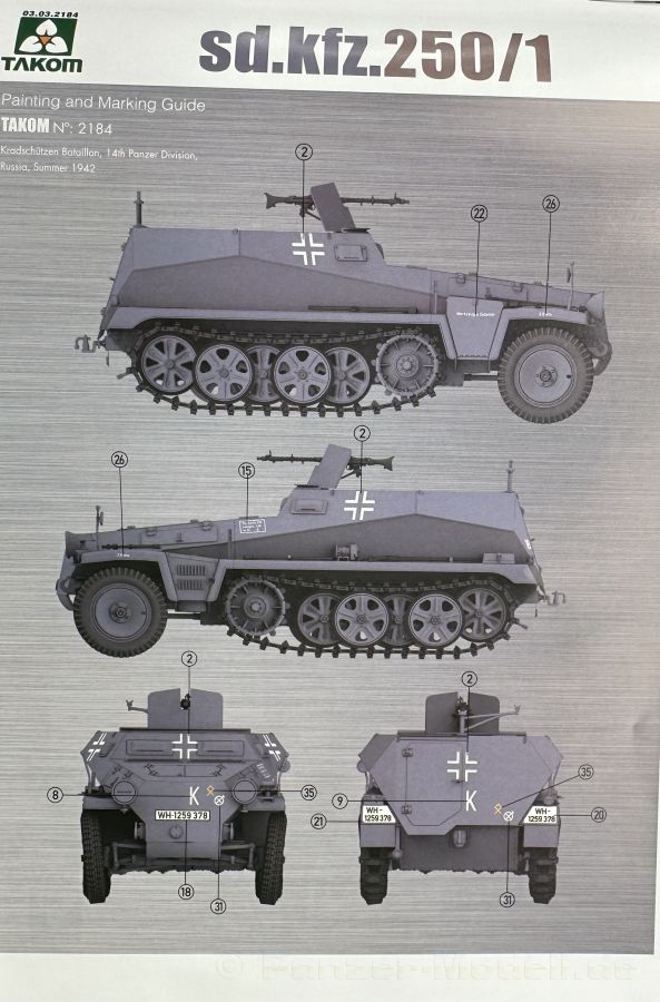 Es hat lange gedauert bis sich ein Hersteller an eine neue Version des kleinen Bruders des „251“ gewagt hat. Zuletzt haben wir ein Bausatz des Sd. Kfz. 250 Alte von Dragon erhalten das noch Wurzeln bei Gunze Sangyo aus den späten 1980 / frühen 1990 Jahren hatte. Kommen wir zu den Eckdaten. Wir finden in dem Takom typischen hellen Kunststoff insgesamt: - 12 Spritzlinge Die Anleitung gliedert sich in 27 Baustufen. Auf den ersten Blick finden wir hier einen Bausatz absolut auf der Höhe der Zeit was Details, Gravuren und Ausstattung angeht. Die Anleitung startet mit dem Zusammenbau der Details in der Wanne, erfreulicherweise ist die Wanne einteilig. Die Details in der Wanne sind Top, leider verschwindet davon das meiste unter dem Kampfraum bzw. der Abdeckung. Apropos der Kampfraumboden, leider sind hier viel zu wenige „Punkte“ aufgebracht die das Warzenblech imitieren sollen. Bei Baustufe 3 ist die Bezeichnung falsch bei Bauteil B4 muss nicht B5 angeklebt werden sondern B9 ! Die Einzelgliederkette muss aus dem Rahmen gelöst werden, ein wenig versäubert werden und wird, wenn wirklich sehr wenig dickflüssiger Kleber auf dem Laufpolster verwendet wird sogar beweglich. Die Reifen werden in Sandwichbausweise / Scheiben zusammengeklebt, dadurch erhalten wir ein großartiges Profil. Leider fehlen bei den Laufrollen und dem Vorderädern sämtliche Herstelleraufdrucke. Das Getriebe ist wirklich sehr schön detailliert, leider ist die Position im Fahrzeug nicht ganz richtig, das Getriebe müsste auf Höhe des 1. Laufrades befinden. Leider hat Takom hier nicht richtig gearbeitet. Eine Korrektur wird schwierig da der Fußraum dann nicht mehr passt und alle Anbauteile dann nicht montiert werden können. Ein Motor ist ebenfalls enthalten, auch hier finden wir eine tolle Detaillierung vor, ein wesentlicher Gewinn wenn wir an Dragon denken die auch einen Motor haben der allerdings nur rudimentär detailliert ist. Bauteil F12 kann getrost entsorgt werden, die beiden Ersatzlaufbehälter für das MG34 sind viel zu klein. In Bauschritt 17 muss der Feuerlöscher gerade montiert werden und nicht wie in der Anleitung gezeigt schräg. Ein Highlight vom Bausatz sind die Planen und die Beladung, hier fallen die großartigen Gravuren und Details ins Auge. Schön ist ebenfalls das Takom eine passende Fahrer Figur mit ins Modell gepackt hat. Ebenfalls großartig sind die 3 verschiedenen Abdeckungen / Planen für den Kampfraum, hier habt ihr die Auswahl von ganz, halb oder dreiviertel ausgerollt, auch hier fallen die Details, Faltenwurf und Co auf. Man könnte jetzt ja Unken und das begründen das man sonot nicht die Fehler in der Innenraumaufteilung sieht.. An Decals hat Takom insgesamt 4 Varianten gedacht, alle in Panzergrau gehalten: - Kradschützen Battalion GD , Army Group South , Summer 1942 Erfreulich ist ebenfalls das wir ein Farbprofile für die Bemalung des Innenraums / Motorraum vorfinden. Leider alles ohne Farbangaben. Mein Fazit fällt leider total durchwachsen aus. Auf der einen Seite ein Bausatz auf der Höhe der Zeit mit richtig viel Zubehör wie EZK, Fahrer, Beladung, Plane etc. anderseits grobe Schnitzer bei den Details und der Aufteilung im Innenraum. Interessant ist natürlich der mehr als günstige Preis von unter 30 Euro