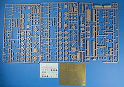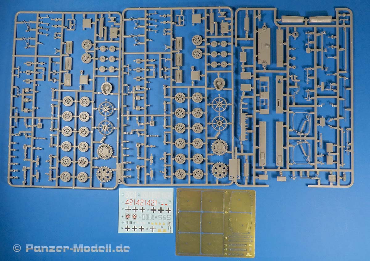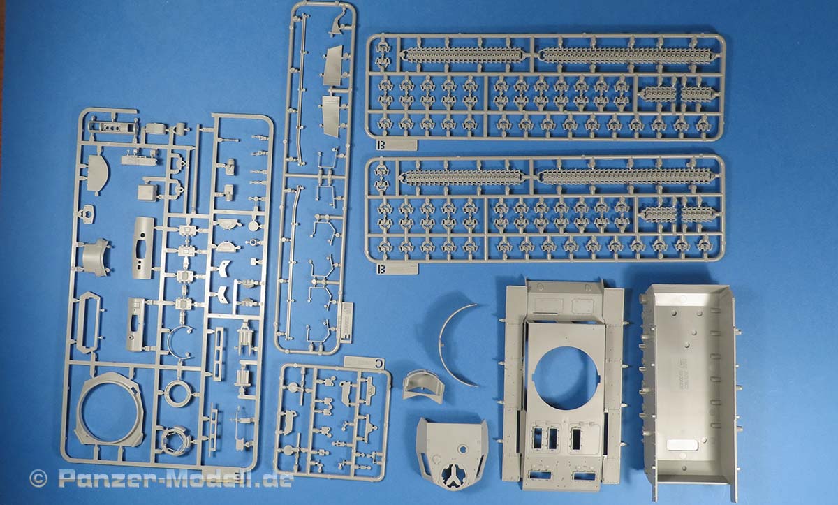 Im Karton finden wir nun also 8 graue Spritzlinge, die Ober- und Unterwanne, das Turmoberteil, die gebogene Turmschürze aus Plastik, der Turmstaukasten, eine PE Platine und einen Decalbogen.