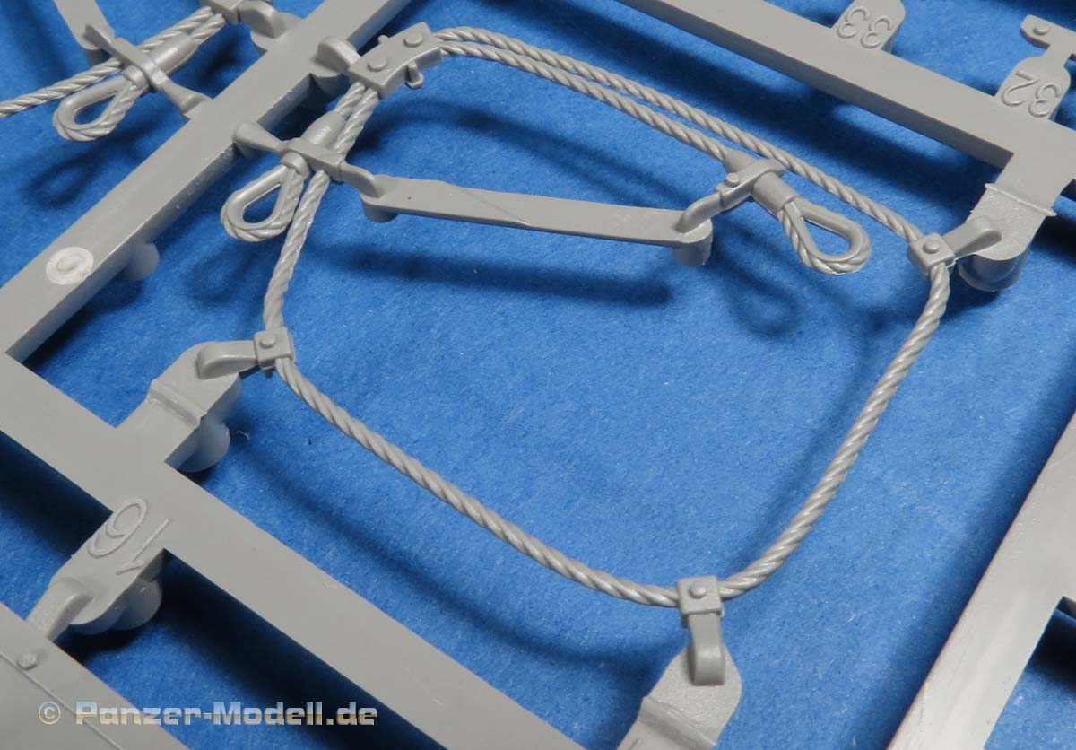 Die Aussendetails wie die komplette Ausstattung der Bordwerkzeuge sind fein und filigran und machen einen guten Eindruck. Die Abschleppseile sind bereits komplett mit Halterungen und in passender Form in Plastik gespritzt und machen einen tollen Eindruck.