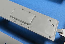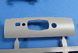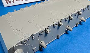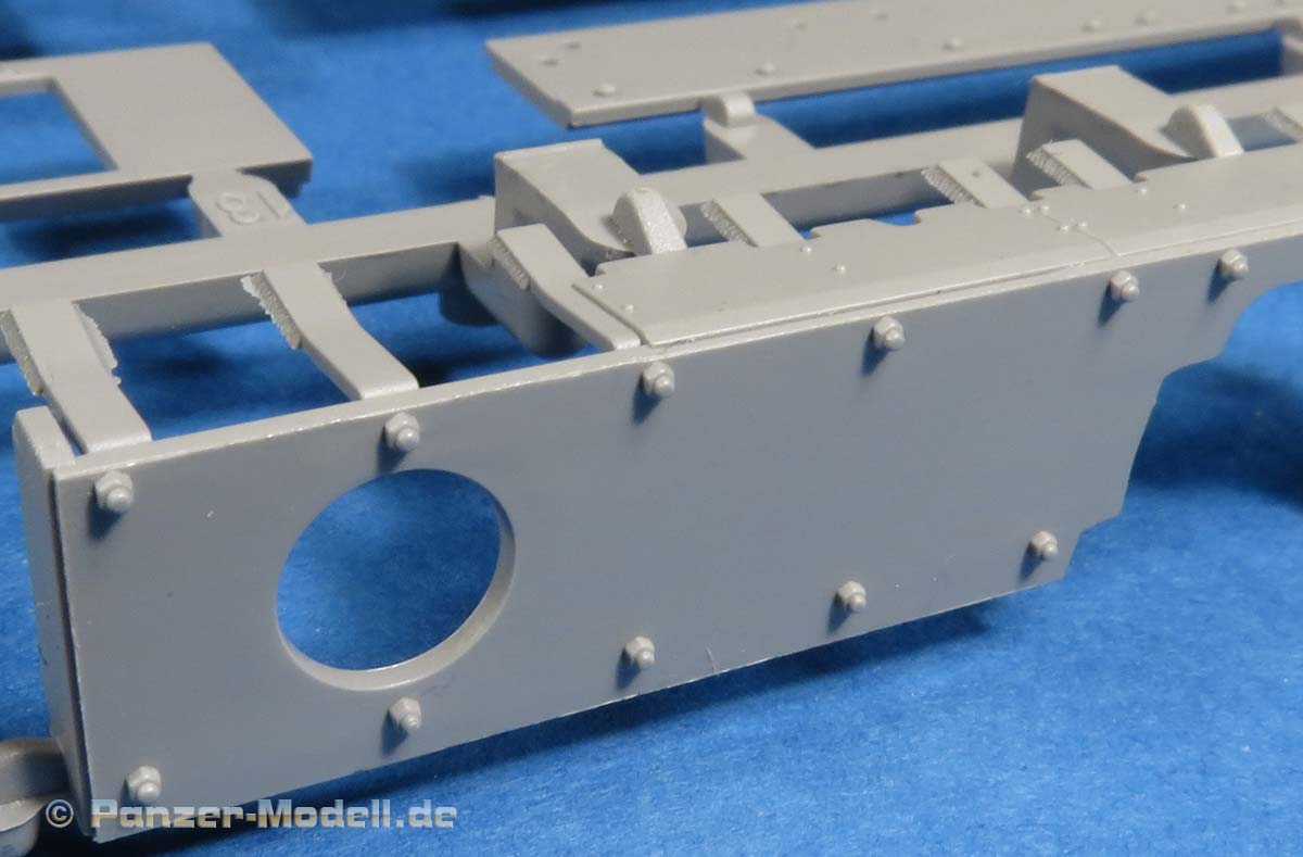 Die Aufbauseiten und Front werden mit einzelnen Blechen versehen. An der Front gibt es dazu noch die passende Abstandszusatzpanzerung in einem Stück mit fein detaillierten Schraubenköpfen.