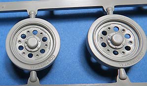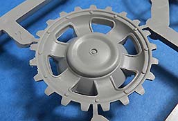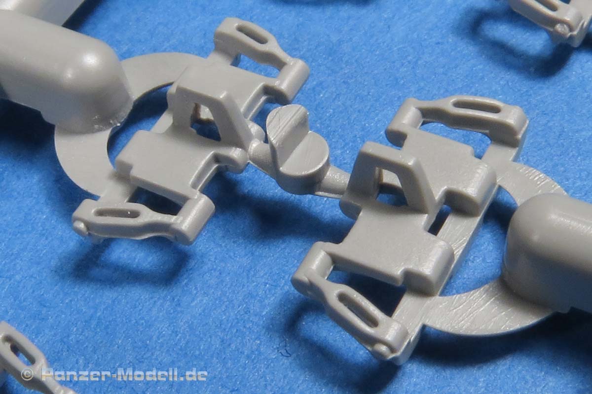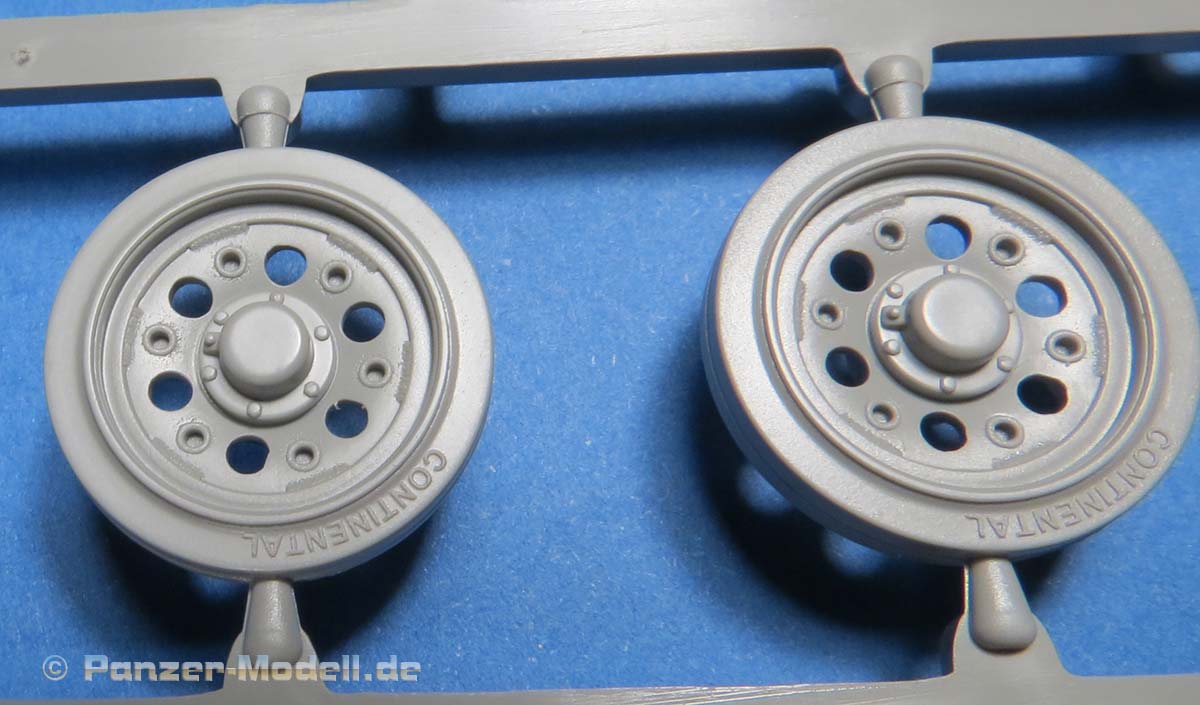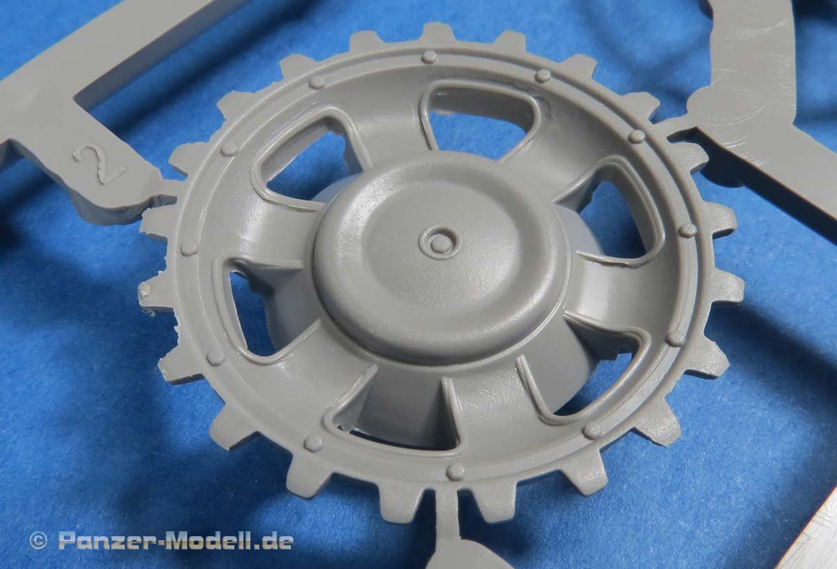 Die Laufrollen, wie auch Treib- und Leiträder sind sehr gut und mit feinen Details gespritzt. Die Laufrollen sitzen an je 2 Angüssen, was das Heraustrennen relativ angehem macht. Die Qualität der Doppellaufrollen ist sensationell. Tolle, saubere Details, insbesondere die unterschiedlichen Stufen der Felgen, die abgesetzte Gummierung, welche mit sehr feinem "Continental" Schriftzug daherkommt. Leider ist das die einzige Detaillierung der Gummierung. Auch an den Stützrollengummis findet sich der feine Schriftzug des Herstellers.