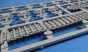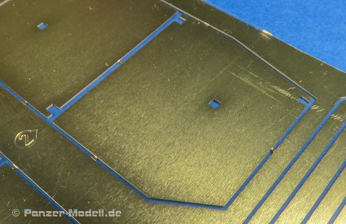 Die Seitenschürzen der Wanne liegen als fein geätzte PE Teile in einzelnen Segmenten bei. Sehr vorbildlich! Die Halterungen aus Spritzguss sind sehr fein und filigran gespritzt,