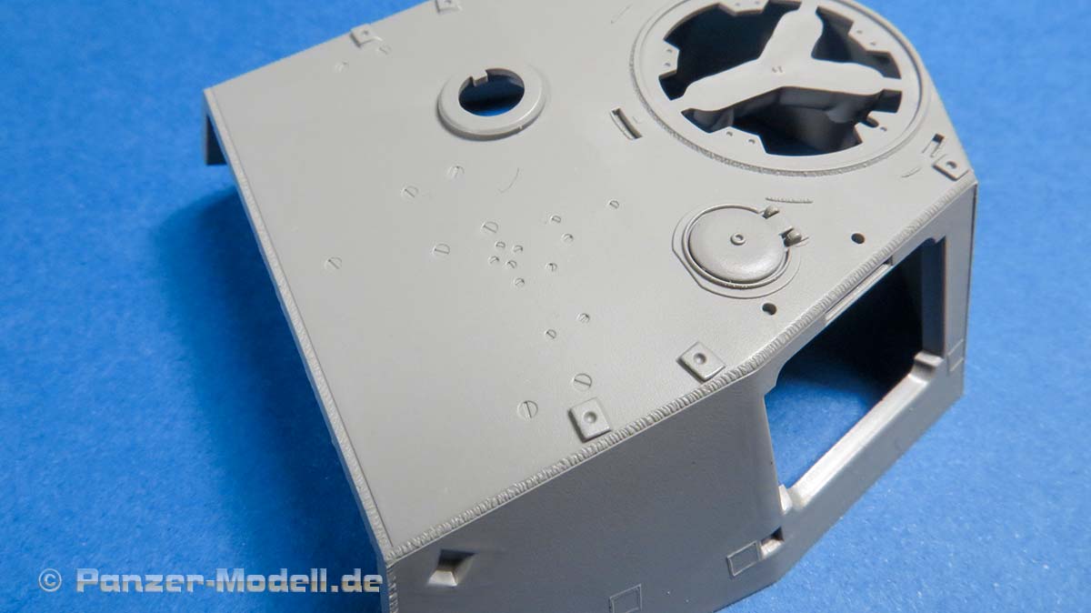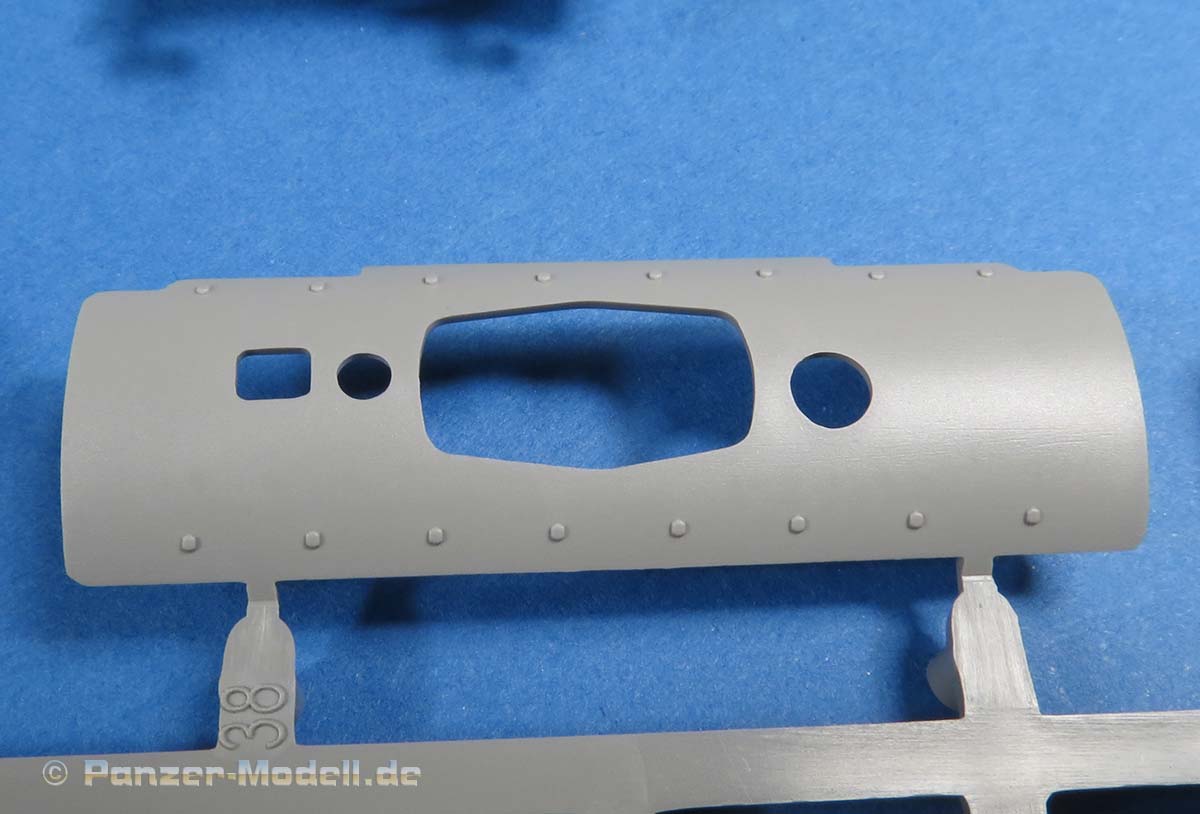 Die Oberwanne ist soweit einteilig mit geschlossen eingespritzten Lukendeckeln des Motordecks und angespritzten Kettenblechen - diese weisen eine sensationell feine Riffelung auf. Auch die Detaillierung der Schweißnähte ist sehr gut gelungen. Die seitlich Luftein- und auslässe werden mit den Abdichtblechen versehen - Lüftergitter gibt es hier nicht, die man allerdings bräuchte, wenn man die Dichtbleche nicht abgesenkt darstellt..