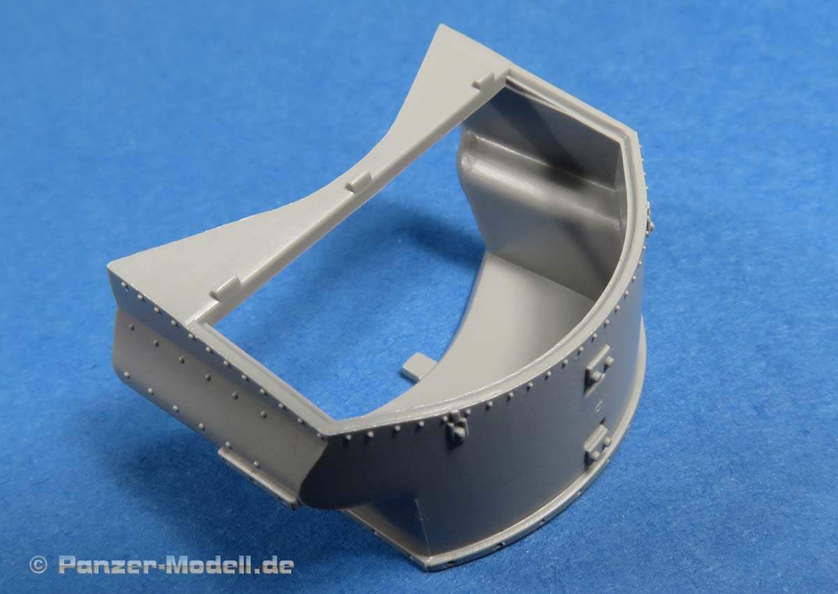 Die Kanoneblende ist mehrteilig mit feinen Details auf höhenbeweglicher Wiege. Auch hier ist die Zusatzpanzerung als Einzelteile enthalten mit sehr schönen feinen Nietenköpfen.