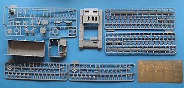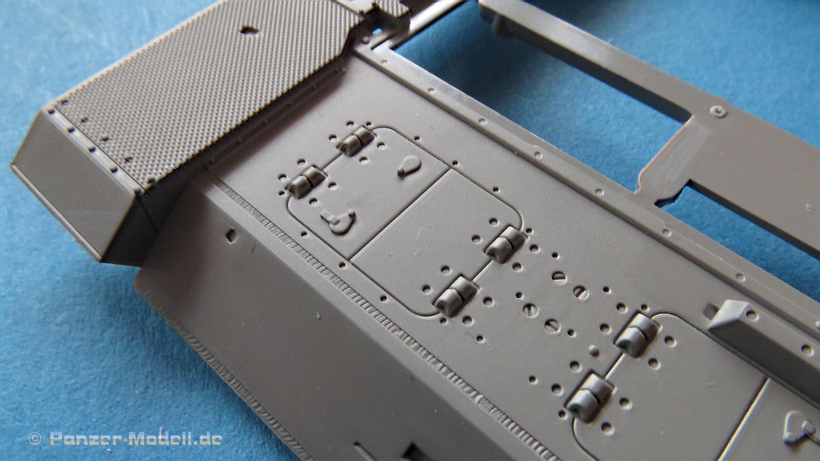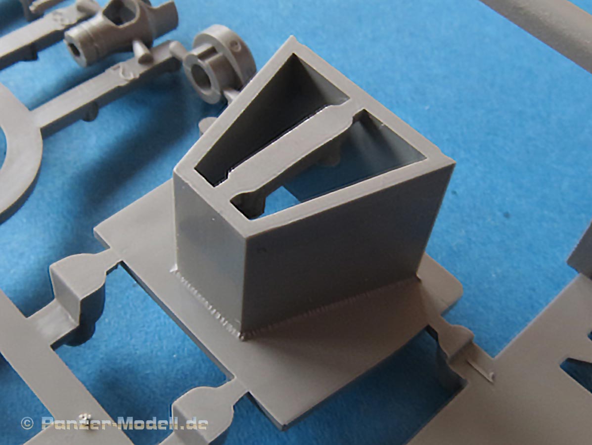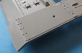 Die Oberwanne ist soweit einteilig mit geschlossen eingespritzten Lukendeckeln des Motordecks und angespritzten Kettenblechen - diese weisen eine sensationell feine Riffelung auf. Auch die Detaillierung der Schweißnähte ist sehr gut gelungen. Die seitlich Luftein- und auslässe werden mit fein geätzten Lüftergitter aus PE Teilen dargestellt.