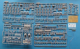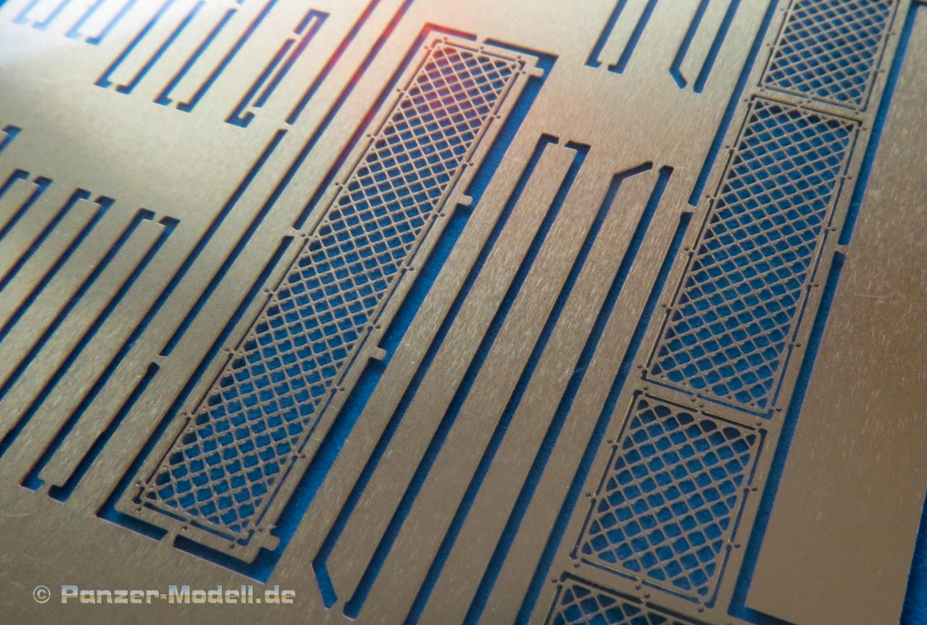 Dem Bausatz liegen natürlich auch die Halterungen uns die Schürzenteile als einzelne PE Bleche bei. Auch der "Zaun" zum halten von Ausrüstung auf dem Motordeck liegt als PE Teile bei und ist eine wirklich hervorragende Ausstattung.