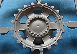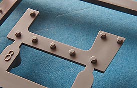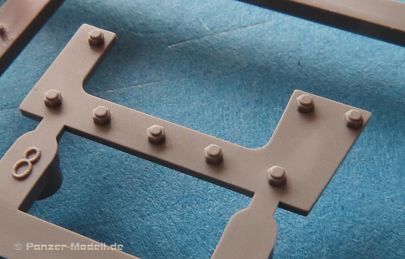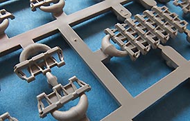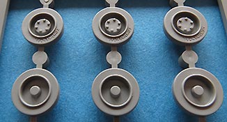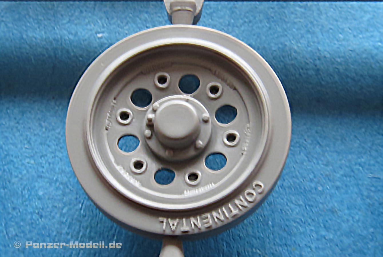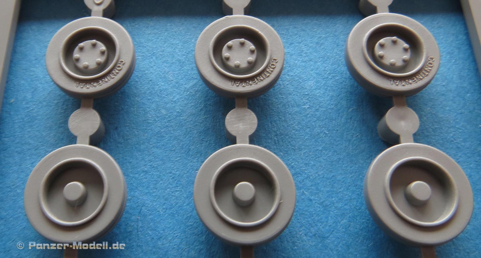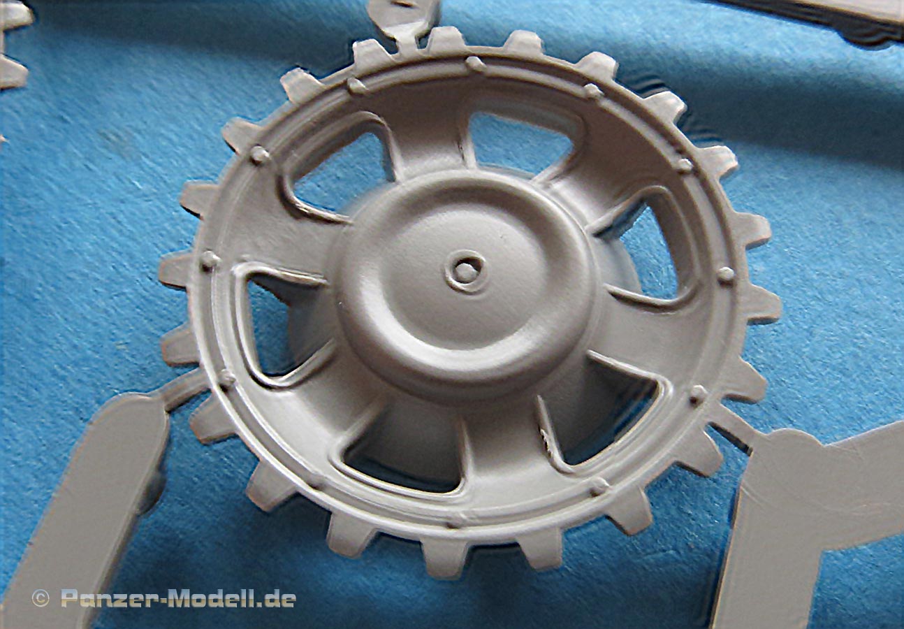 Die Laufrollen, wie auch Treib- und Leiträder sind sehr gut und mit feinen Details gespritzt. Die Laufrollen sitzen an je 2 Angüssen, was das Heraustrennen relativ angehem macht. Die Qualität der Doppellaufrollen ist sensationell. Tolle, saubere Details, insbesondere die unterschiedlichen Stufen der Felgen, die abgesetzte Gummierung, welche mit sehr feinem "Continental" Schriftzug daherkommt. Leider ist das die einzige Detaillierung der Gummierung. Auch an den Stützrollengummis findet sich der feine Schriftzug des Herstellers.
