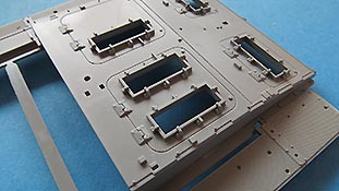 Die Deckplatte der Kasematte ist einteilig mit den offenen Öffnungen der Luken und der Kommandantenkuppel, die man dann eben offen oder geschlossen bauen kann, wobei, wie gesagt, ohne Inneneinrichtung eine offene Darstellung nur dann Sinn macht, wenn man Figuren in die Luken stellt.