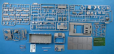 Im Bausatzkarton finden wir 14 Spritzlinge, die Unterwanne, die Oberwanne, den Kasemattaufbau, die Deckplatte, zwei Metallrohre, zwei PE Platinen, Kupferseil und ein kleiner Decalbogen.