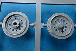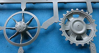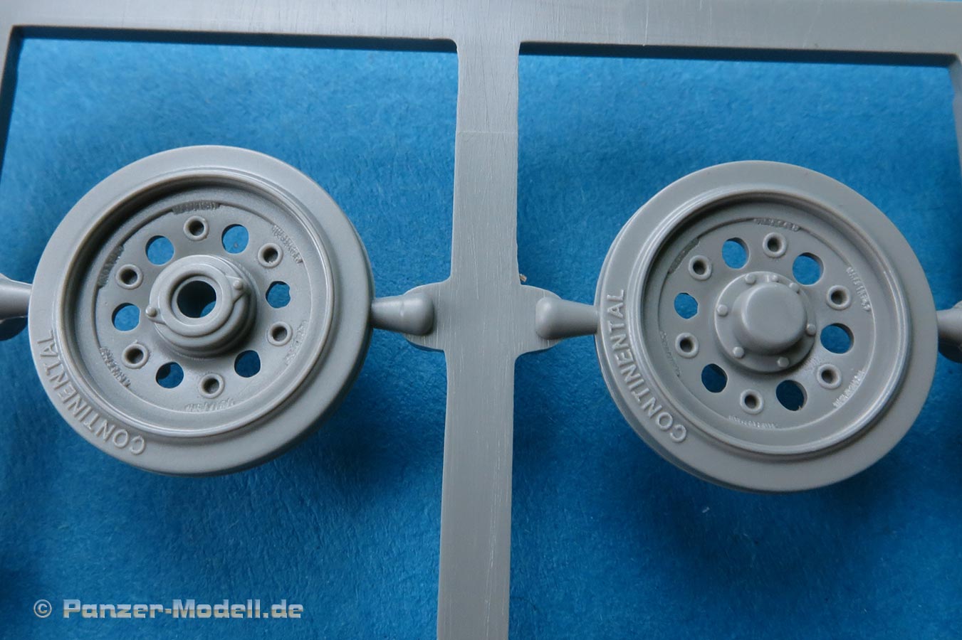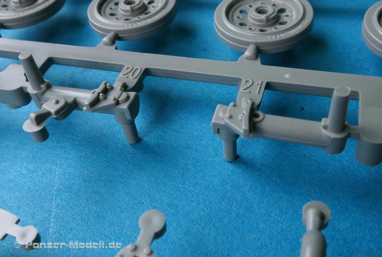Die Laufrollen, wie auch Treib- und Leiträder sind sehr gut und mit feinen Details versehen. Die Doppellaufrollen sind außerordentlich, saubere Details, insbesondere die unterschiedlichen Stufen der Felgen, die runden, sauberen Durchbrüche und die abgesetzte Gummierung, welche mit sehr feinem "Continental" Schriftzug daherkommt. Auch an den Stützrollengummis findet sich der feine Schriftzug des Herstellers.