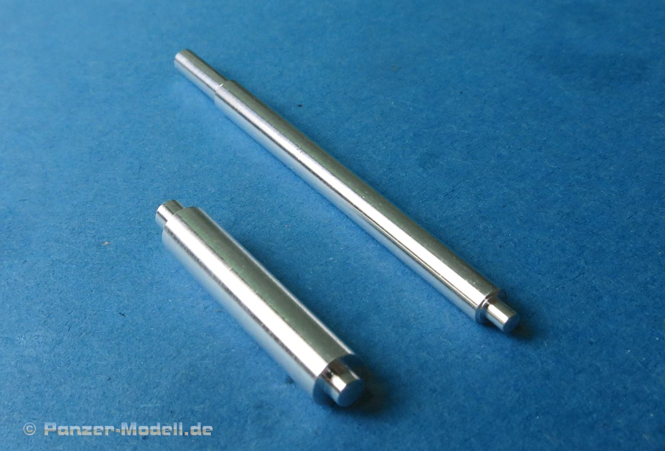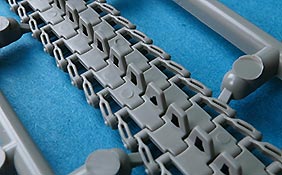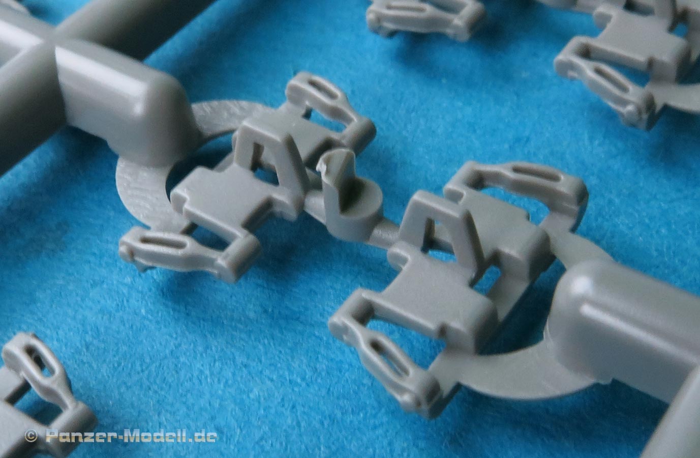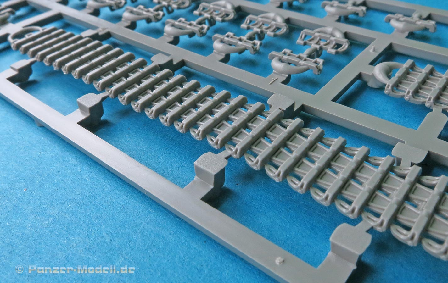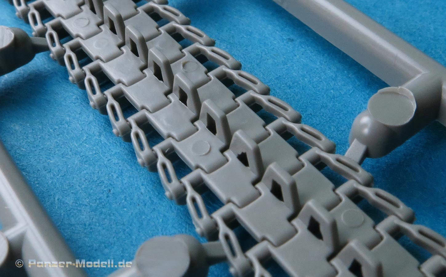 Bewegliche Schwingarme sind nicht vorgesehen, welches aber auch bei der Segmentkette nicht notwendig ist. Die Kette besteht aus Einzelgliedern für die Umläufe um Trieb- und Leitrad, je einem langen Segment für den unteren Bereich, je ein etwas kürzeres Segment für den hinteren und vorderen Teil des unteren Bereichs, ein langes Segment mit eingearbeitetem Durchhang für den oberen Bereich. Die Qualität der Ketten ist gut, sauber und fein detailliert. Allerdings finden sich auch hier Auswerfemarken auf den Innenseiten der Segmente, während die Einzelglieder schön sauber sind.