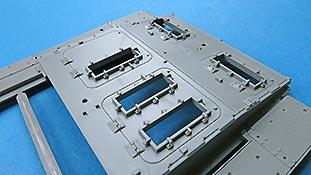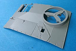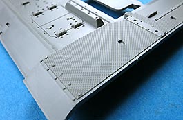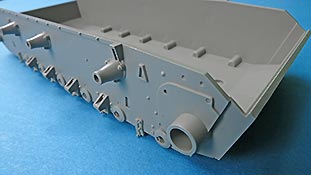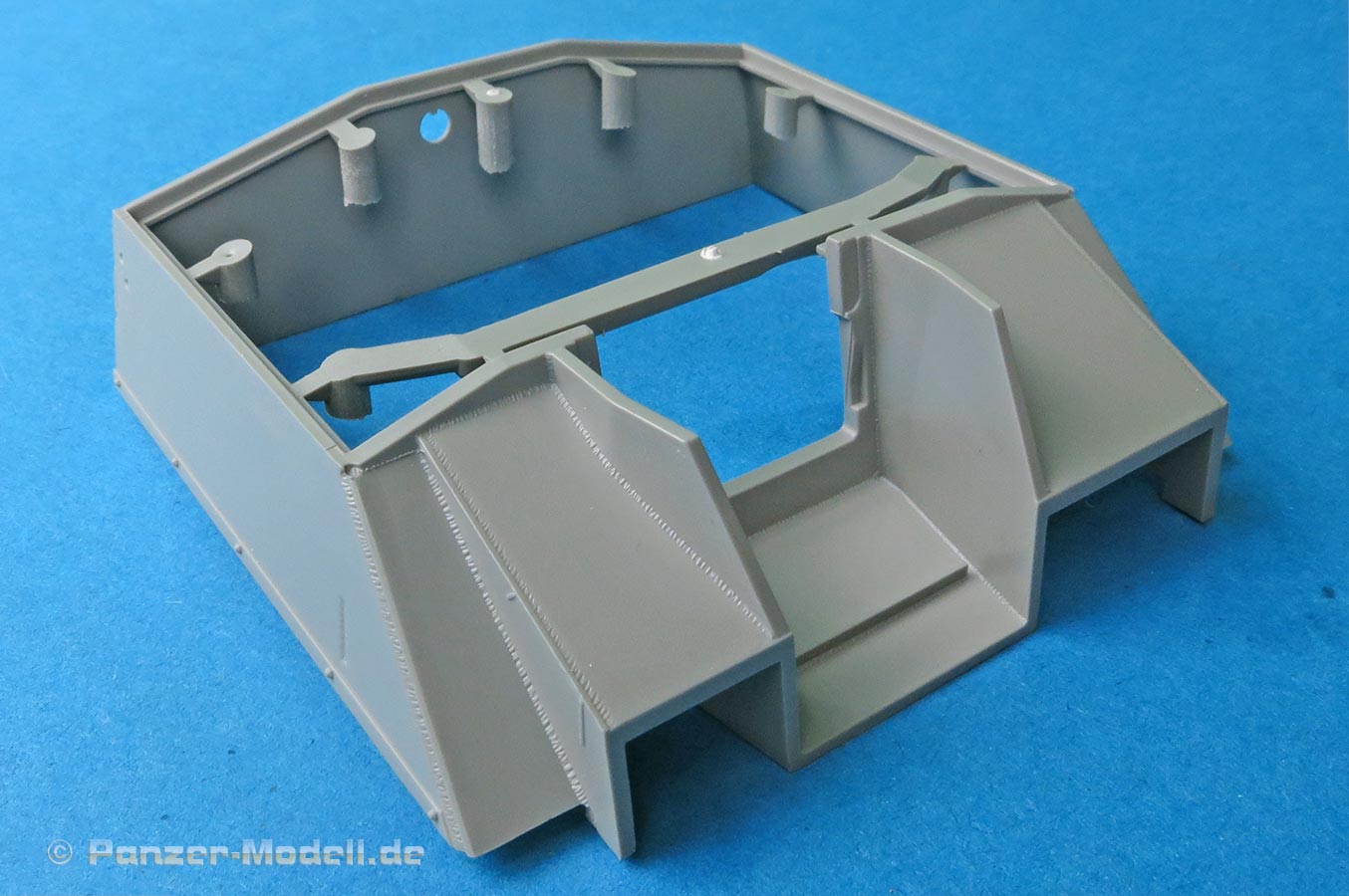 Die Oberwanne setzt sich aus Motordeck, Glacisplatte, Kasematte und Kettenblechen aus Einzelteilen zusammen - letztere weisen eine sensationell feine Riffelung auf. Auch die Detaillierung der Schweißnähte ist sehr gut gelungen.