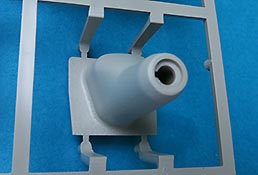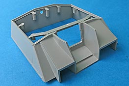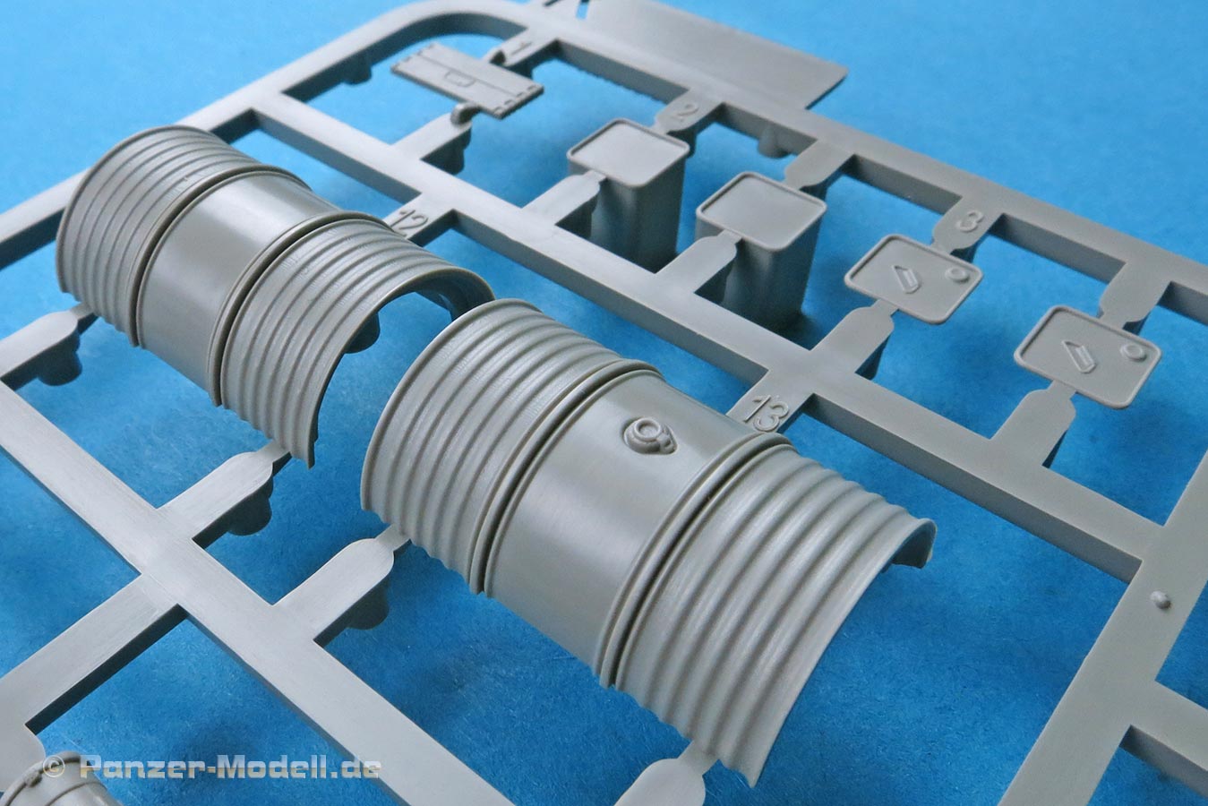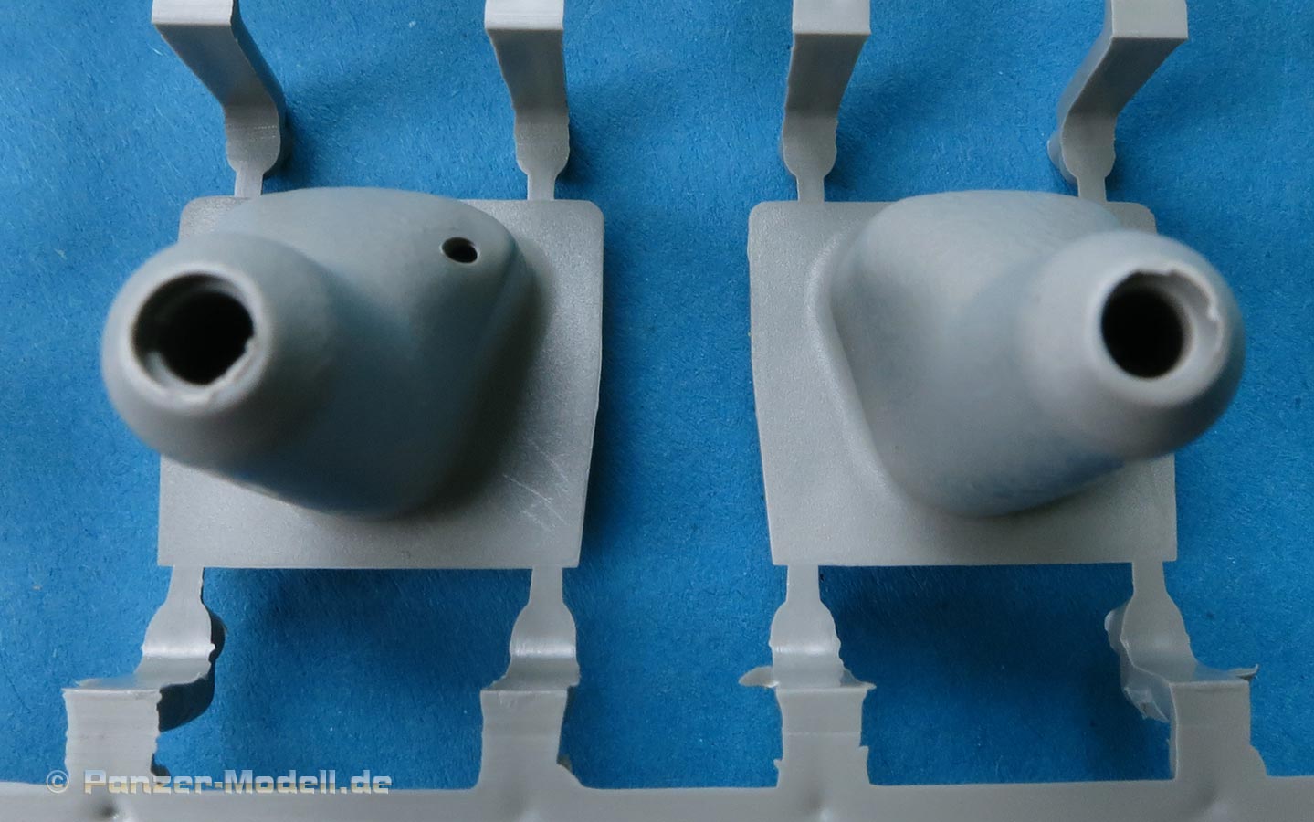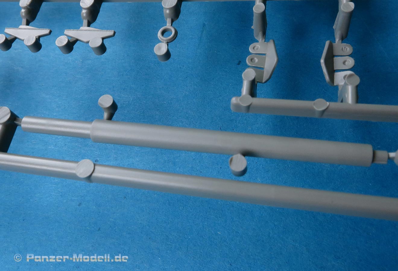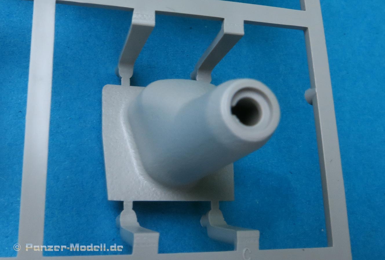 Der Kasemattaufbau ist im groben einteilig, wird aber an der Front mit aufgebolzten Zusatzpanzerplatten versehen. Der Aufbau ist komplett leer ohne Innenausstattung. Es gibt in der Wanne lediglich einen Sockel zum Aufbau der Kanone bzw. Haubitze. Beide verfügen über entsprechende Kanonenblenden und dem jeweiligen Rohr mit Mündungsbremse Die Rohre liegen als Metall- und als Plastikrohre bei und machen einen guten Eindruck. Die markante Topfblende ist mit schönen Details versehen