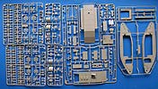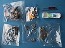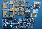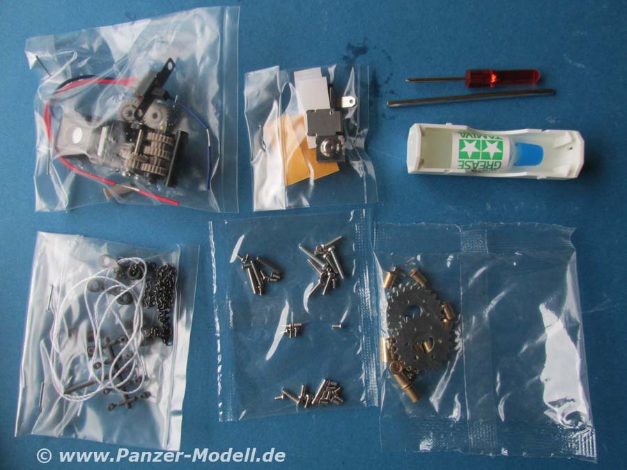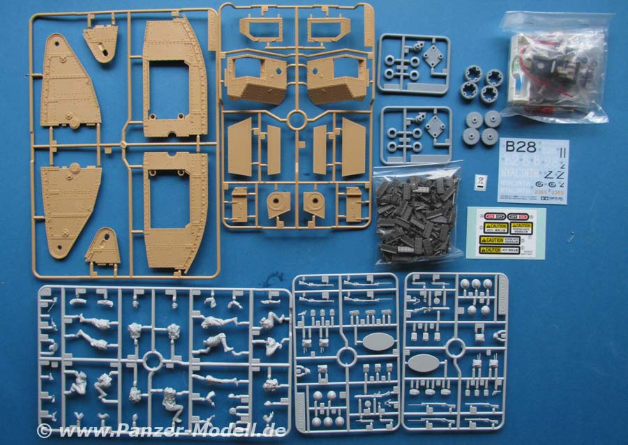 Im Karton finden sich 11 Spritzlinge, Einzelkettenglieder, eine Gliederkette, Seilmaterial, Polycaps, Motor und Anbauteilen, Werkzeuge, Fett, Aufkleber und Decals.
