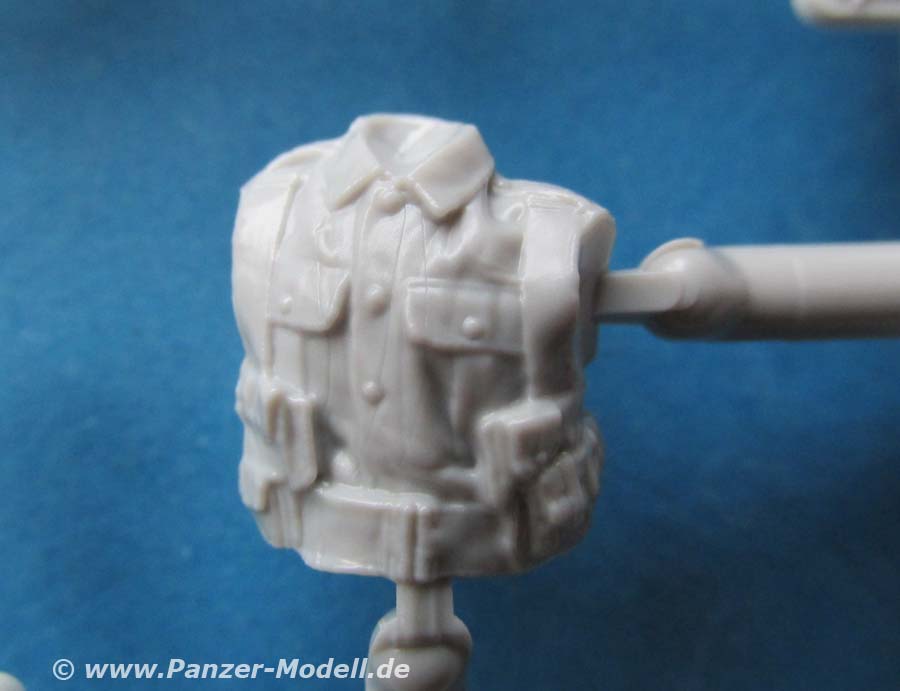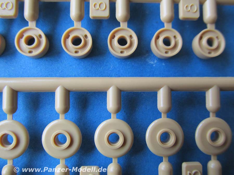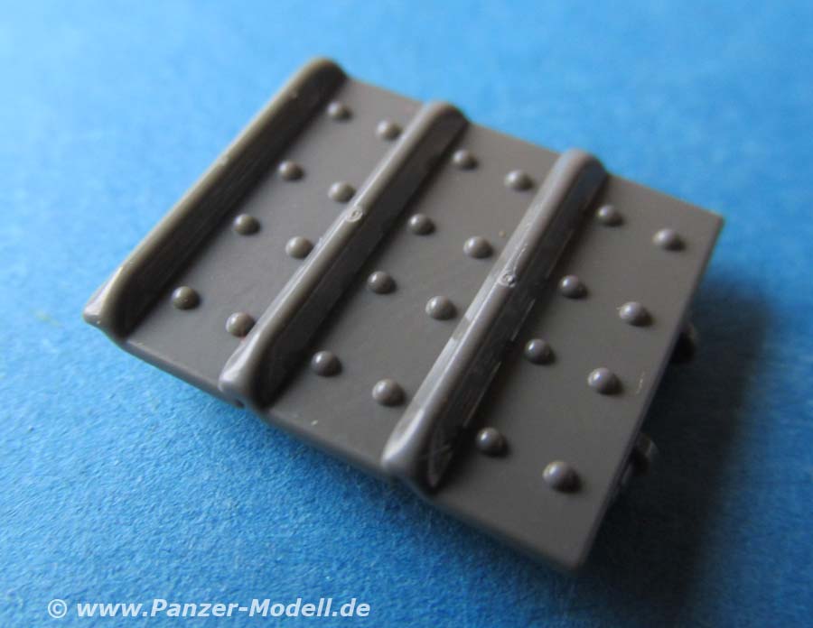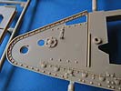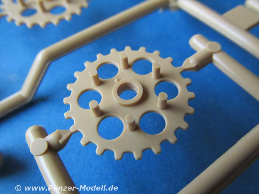 Die Kettenglieder werden einfach zusammengeklipst und bleiben beweglich. Der Guss ist ok, wobei einem ein paar Unsauberheiten und Auswerferstellen auffallen - man muss aber bedebken, dass bei diesem vorliegenden Laufwerk diese Bereiche des Kettengliedes zu keiner Zeit sichtbar sind.
