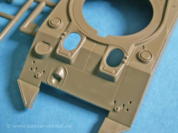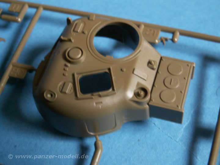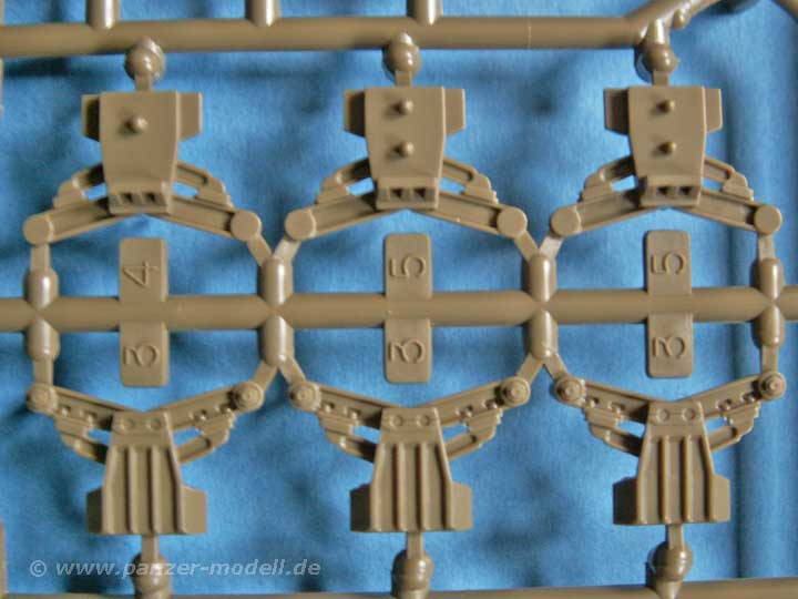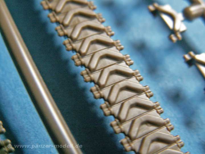 Die Spritzgussteile weisen feine Oberflächendetails, wie z.B. Schraubenköpfe und Nieten auf, die zu gefallen wissen. Die Laufrollenschwingen werden direkt an die Metallwanne angeklebt und weisen eine erstaunliche Teilevielfalt und Detailierung auf. Die Kette besteht aus längeren Kettensegmenten und einzelnen Kettengliedern für die Bereiche um die Leit- und Treibräder.