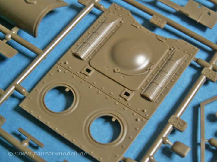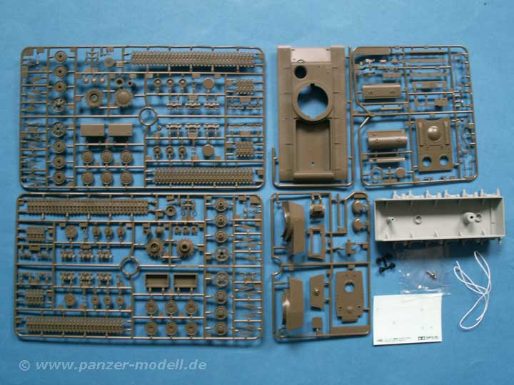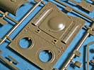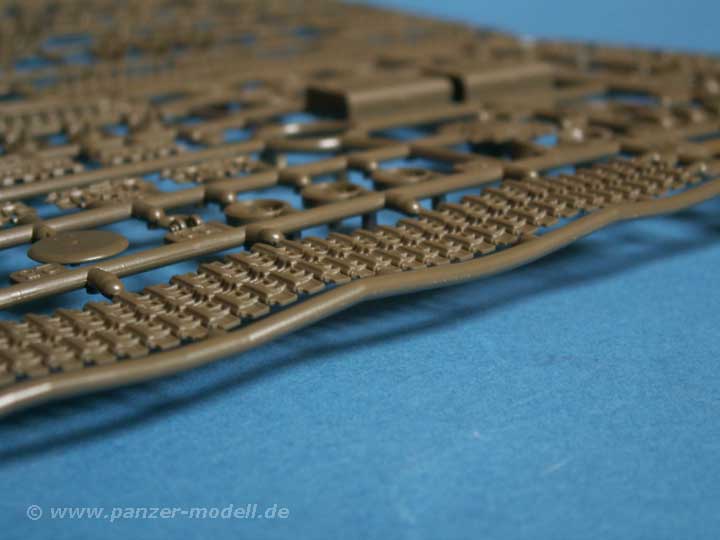 Die Spritzgussteile weisen feine Details auf insoweit dieser klotzige Panzer solche Oberflächendetails aufweist. Die Schwingarme sind bereits an die Metallwanne mit angegossen und ersparen so eine Menge Ausrichtarbeit. Die Kette besteht aus längeren Kettensegmenten und Einzelgliedern. Besonders lobenswert ist die Darstellung der oberen Kette mit bereits dargestelltem Kettendurchhang.