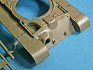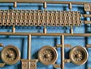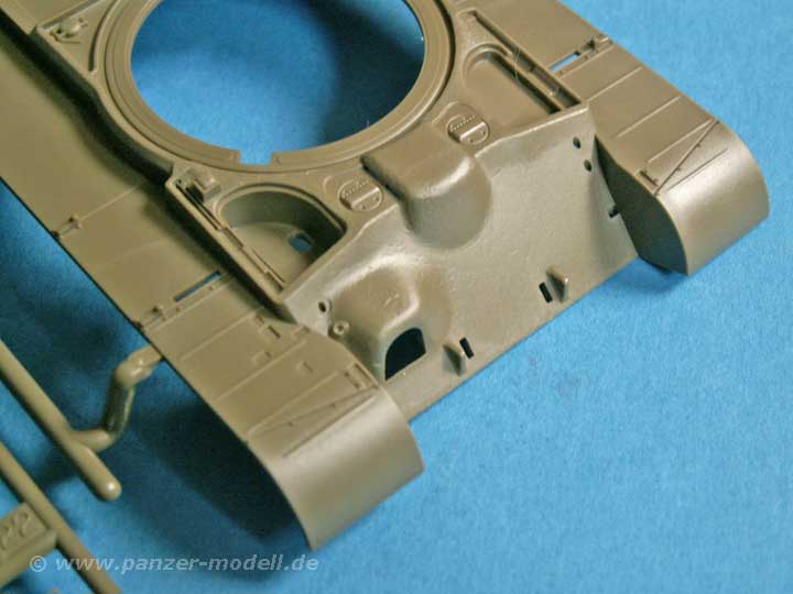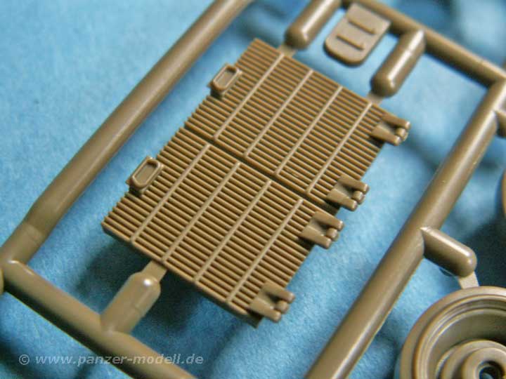 DIe Spritzgussteile sind mit feinen Details versehen und besonders bemerkenswert ist der Turm, der eine dermaßen feine und realistische Gussstruktur aufweist, dass es die helle Freude ist! Auch die übrigen Teile sind sehr schön gestaltet. Die Kette ist aus mehreren Segmenten zusammenzubauen, Das Laufwerk mit den Schwingarmen als komplett Seitenteil zum aufkleben auf die Metallwanne. Der Decalbogen macht einen guten Eindruck.