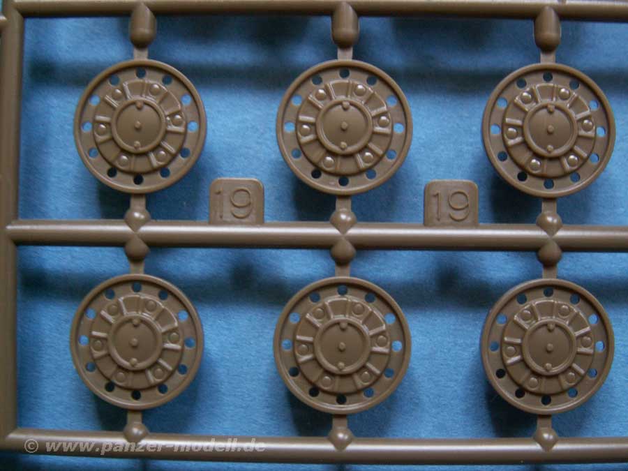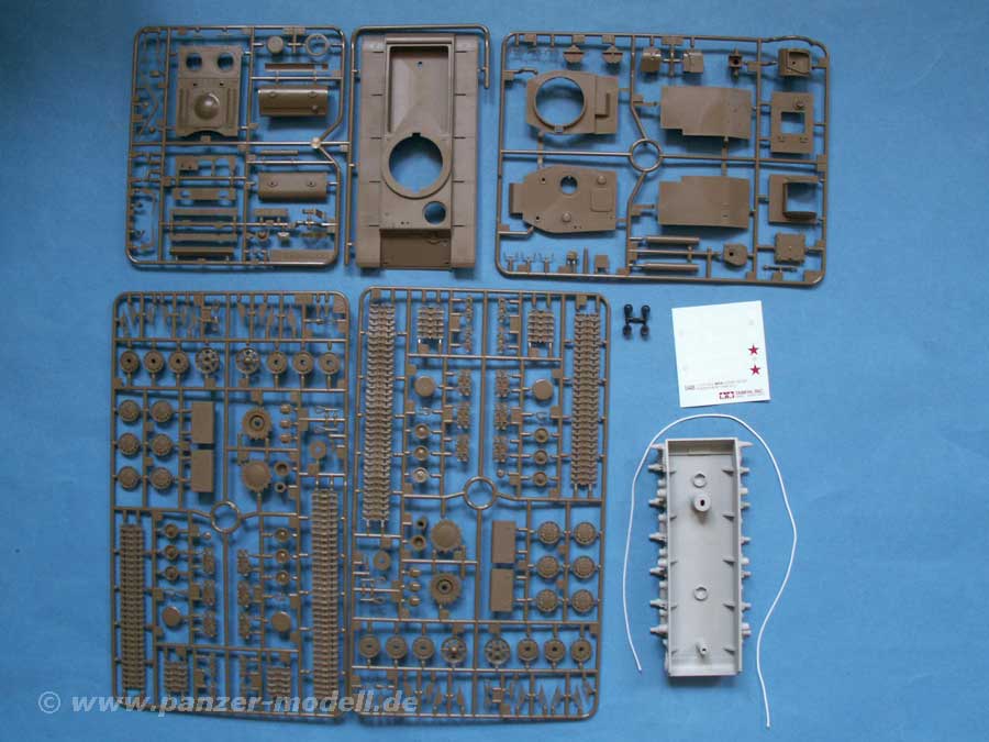 Auch hier findet sich im Karton die Unterwanne aus Metallguss mit bereits angebrachten Schwingarmen. Unterwanne und Laufwerk basieren auf dem bereits bekannten KV-1. Neben der Unterwanne sind 4 Spritzlinge enthalten mit Plastikteilen, sowie Schrauben, Polycaps und ein kleiner Decalbogen.