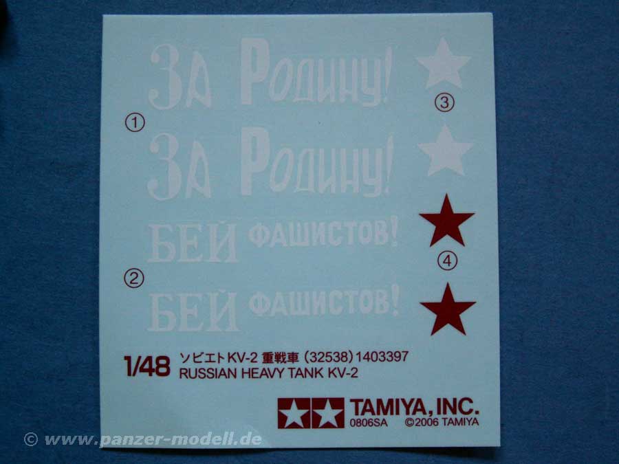 Der decalbogen weist nur jeweils einen Satz Sterne in weiß bzw. rot auf, und zwei Sprüche für den Turm. Die Bauanleitung geht auf die Platzierung dieser Decals ein.