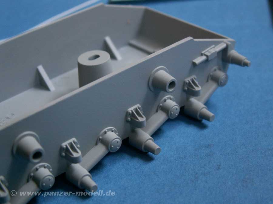 Der Panzer an sich hat nicht viele Details und so beschränken sich die Zubehör Teile auch auf ein paar Staukästen auf den Kettenblechen, sowie Abschleppseile.